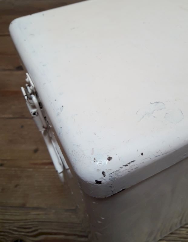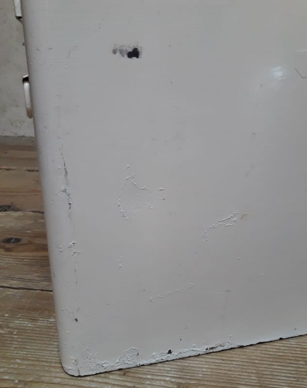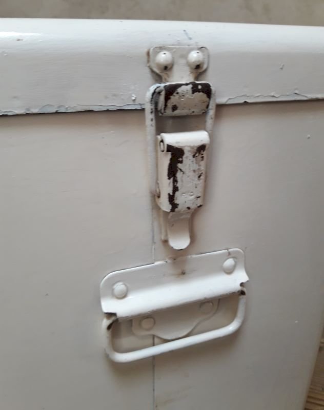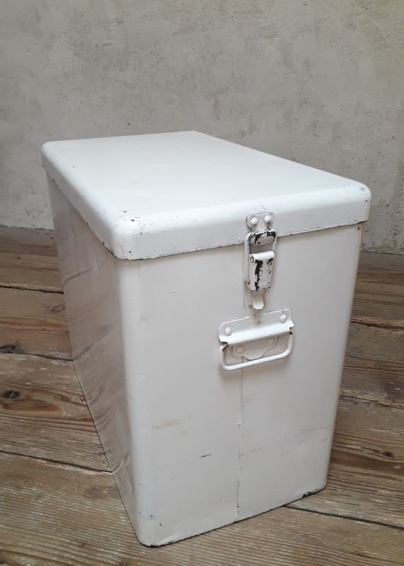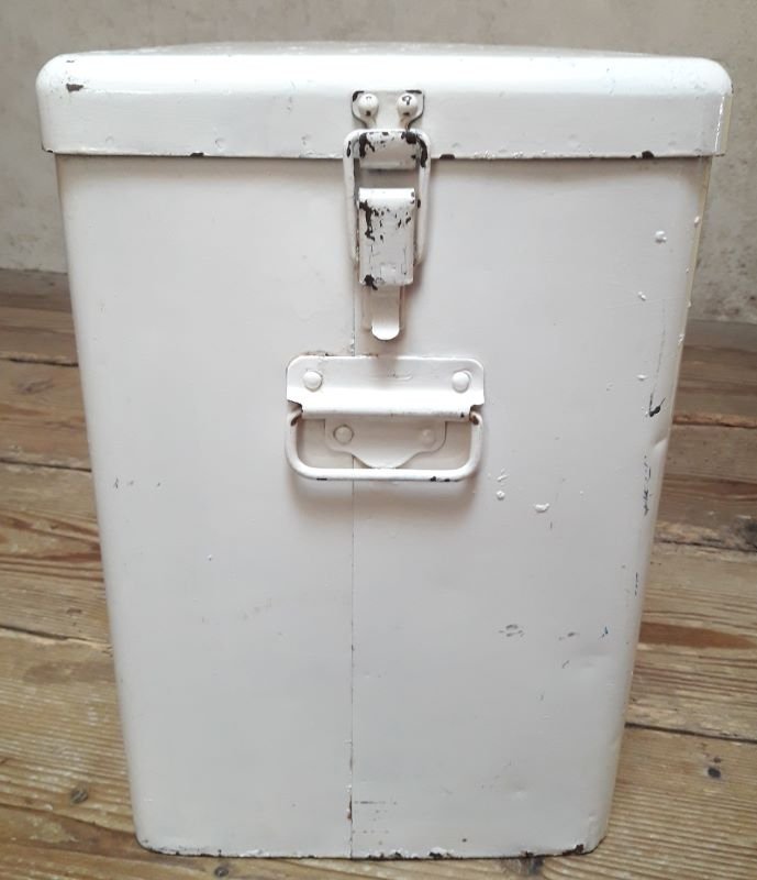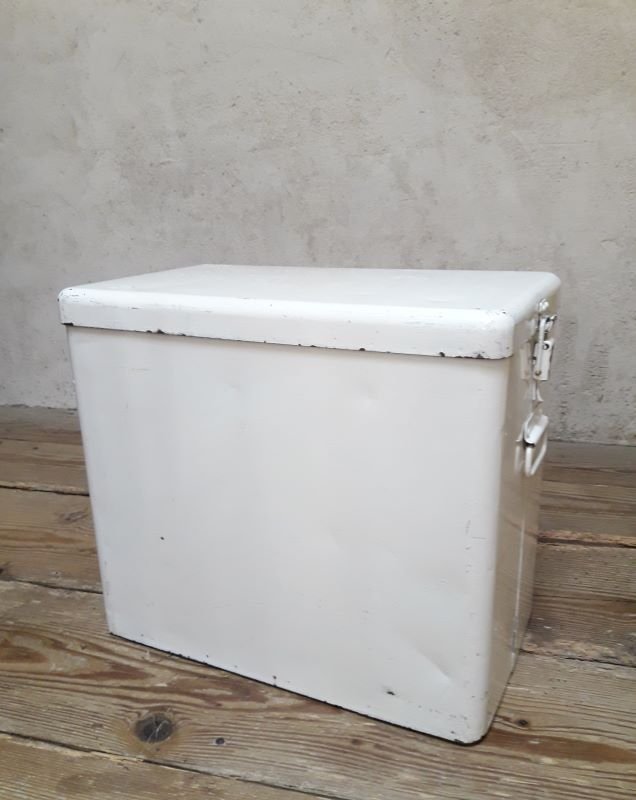 Metal cooler, 45cm wide, 40cm high, and 26cm deep, covered with its satin paint in off-white, beige. Just wiped with a non-abrasive, non-aggressive product to preserve the satin finish of the paint. It has its side transport handles and two side locking latches. Original zinc inner lining. The paint has some imperfections, an adhesive left on one side, the structure has some dings, and the base has some superficial rust marks. Ideal for use as a coffee table or a decorative object with unusual storage! The dimensions of the interior part are 22cm by 40.3cm and 34.2cm high. Weight: 6.1kg.