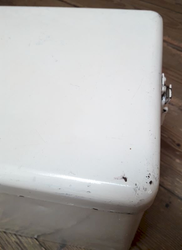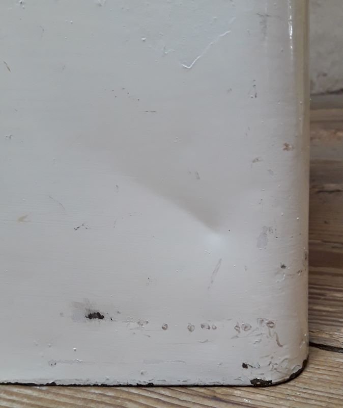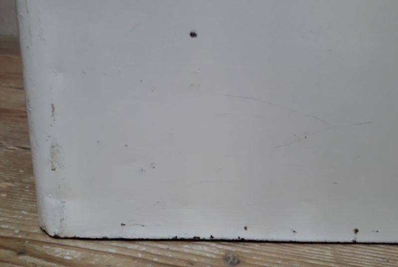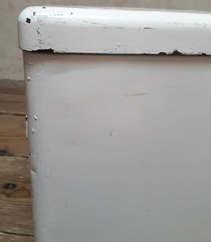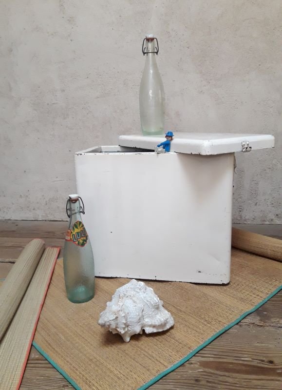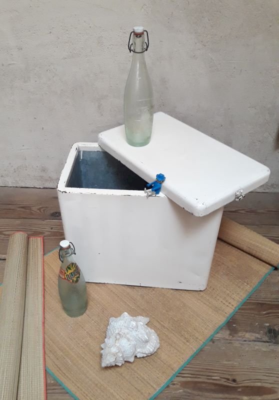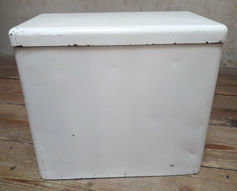 Metal cooler, 45cm wide, 40cm high, and 26cm deep, covered with its satin paint in off-white, beige. Just wiped with a non-abrasive, non-aggressive product to preserve the satin finish of the paint. It has its side transport handles and two side locking latches. Original zinc inner lining. The paint has some imperfections, an adhesive left on one side, the structure has some dings, and the base has some superficial rust marks. Ideal for use as a coffee table or a decorative object with unusual storage! The dimensions of the interior part are 22cm by 40.3cm and 34.2cm high. Weight: 6.1kg.