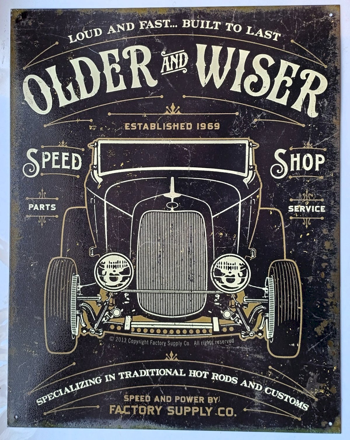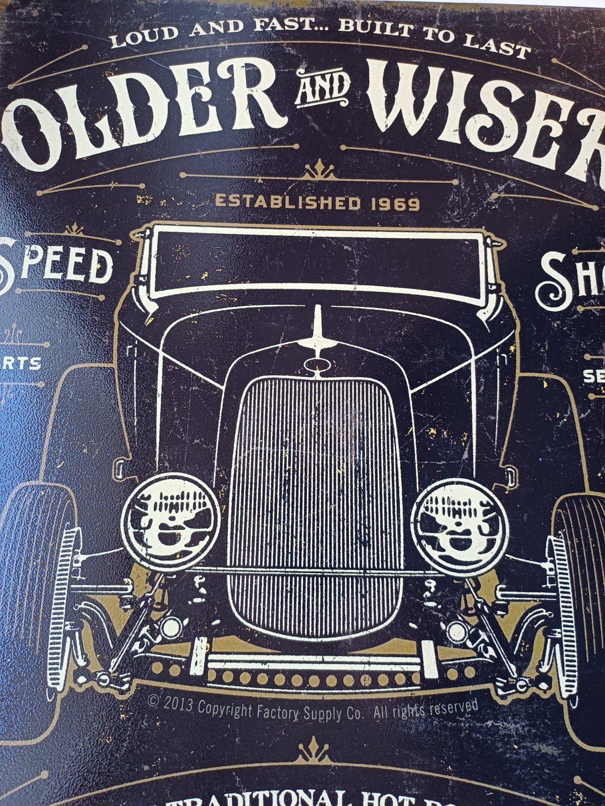 OLDER and WISER for a vintage decoration of your interiors, home, garage. Metal sign measuring 40 x 30 cm with holes in the 4 corners for easy wall fixing. IMPORT USA BRAND NEW Condition: New: Item in new and unused condition, unopened. Check the seller's listing for ... New: Item in new and unused condition, unopened. Check the seller's listing for more details. Original/reproduction: Reproduction Type: Flat sign Origin: United States Period: 2000s and later Country of origin: United States Theme: Automobile Edition: Reissue Shape: Rectangular Product: pin up