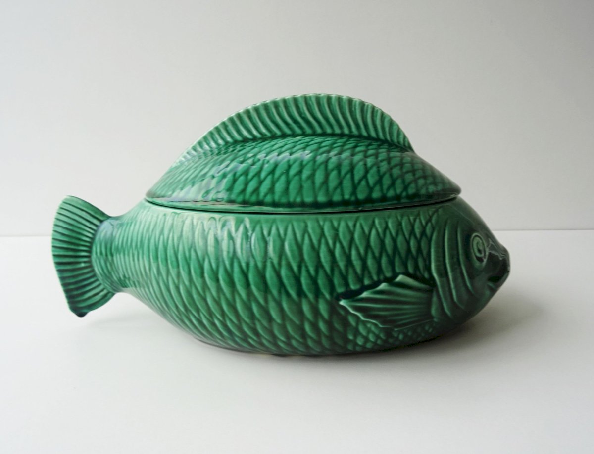 1950s, soup and sauce set in fish-shaped Barbotine, table service, emerald green color. Please make contact. No shipping. Pickup only. (See more: https://www.bibelotandco.fr/profile/alice?q=sarreguemines)