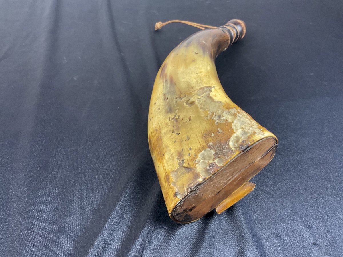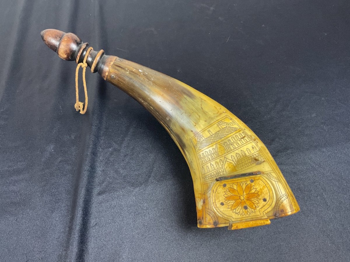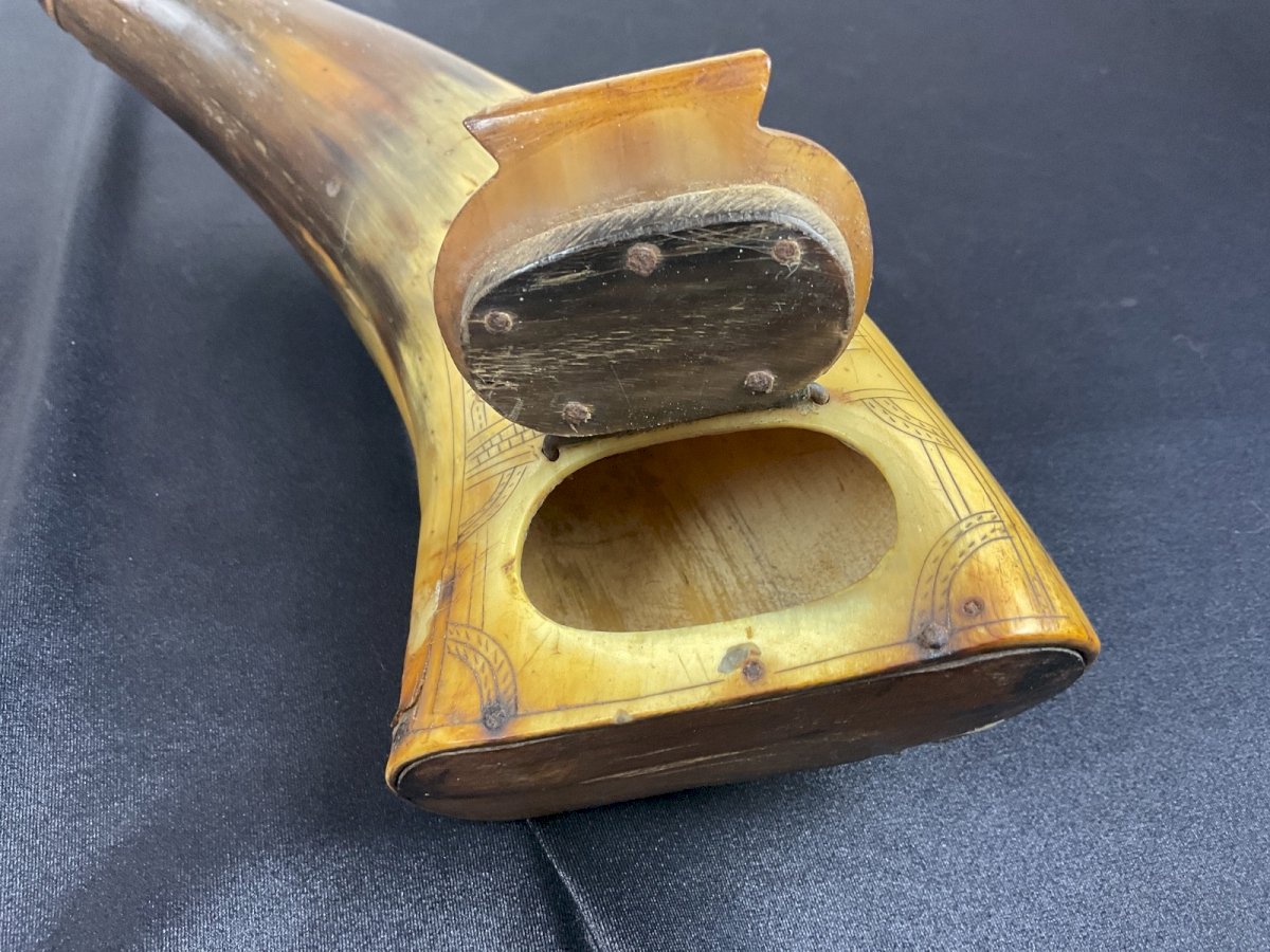 MILITARY POWDER HORN WITH ENGRAVED DECORATION 17TH-18TH CENTURY probable Russian Height: 22 cm Authenticity: Original Type: Folk Art Object Origin: Russia Subtype: POWDER HORN Material: HORN