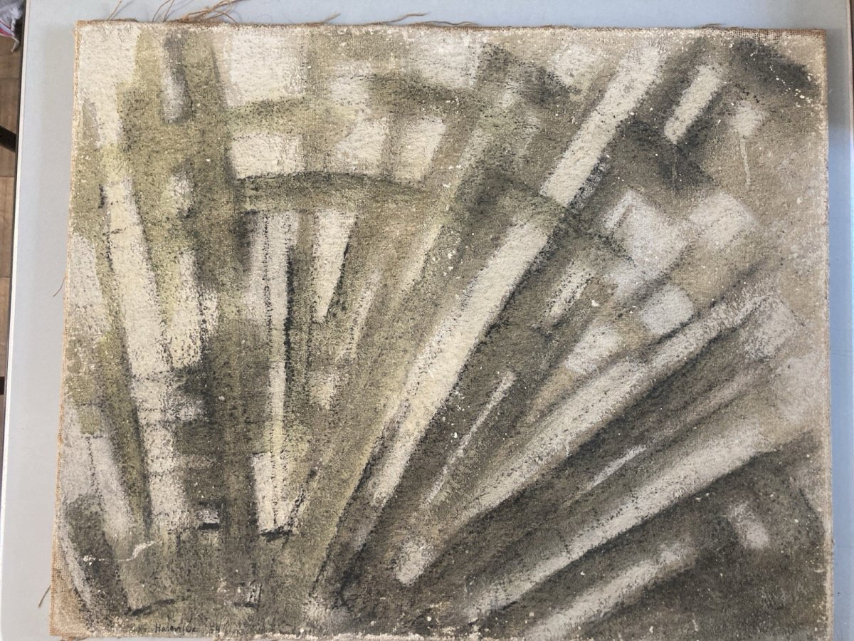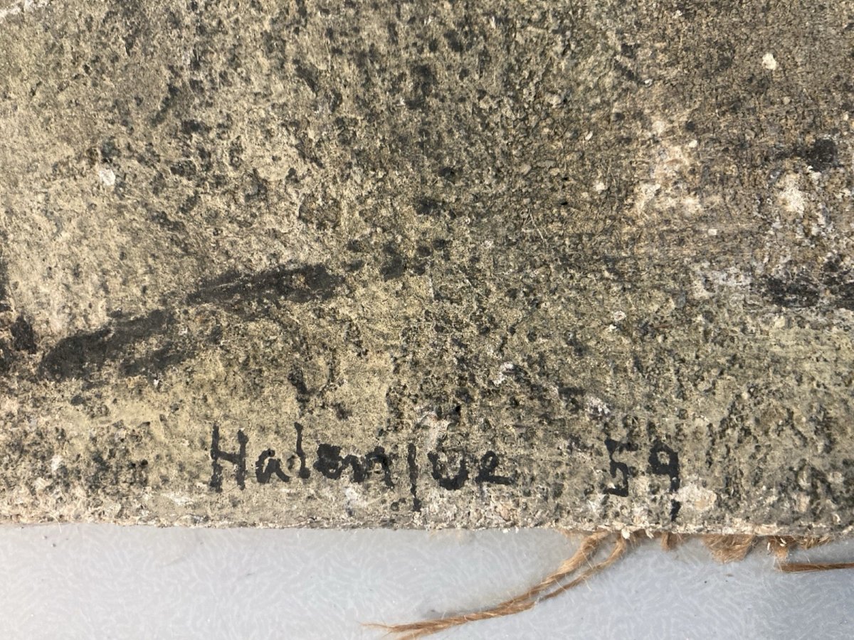 Very beautiful abstract painting, likely from a Belgian school, signature identified, dated 1959, note that the canvas is relaxed and the frame is broken, see photo Type: Oil Style: 1940-1960 Genre: Abstract Features: Signed