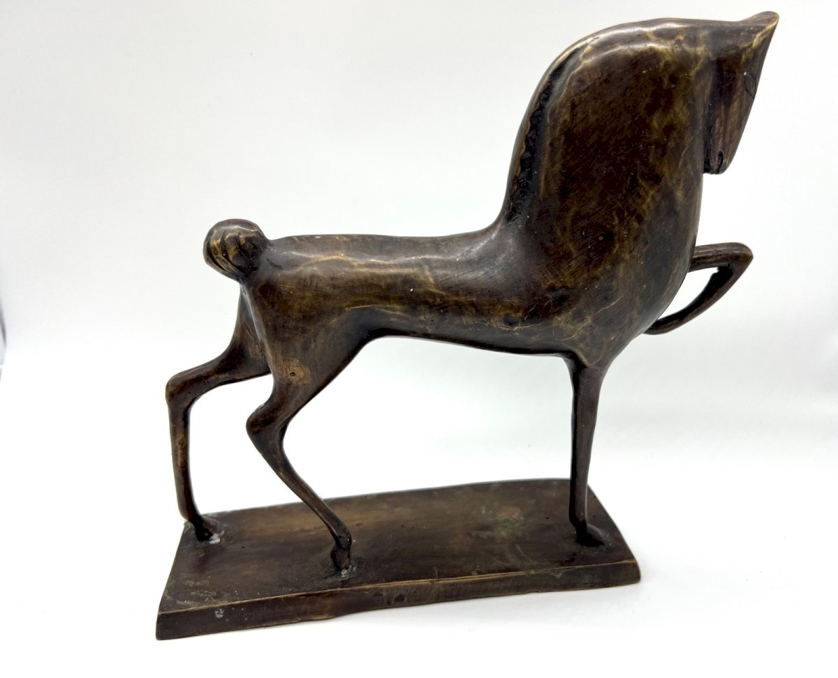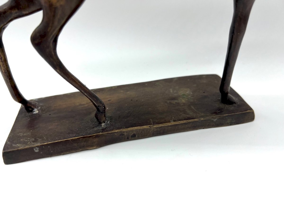 Patinated bronze sculpture representing a stylized horse, with a slender and graphic silhouette. Its deliberately minimalist design evokes the modernist and brutalist art of the mid-20th century: simple lines, a taut look, contained energy. The golden-brown patina shows slight signs of wear on one side, reflecting its age and history. This vibrant patina gives it its authenticity and the organic presence sought by collectors of ancient bronze. A decorative piece full of character, ideal for a contemporary interior, an architect's cabinet, or a collection of modern animal art. Dimensions: Height: 24 cm Length: 23 cm Material: patinated bronze Condition: good general condition, slight surface wear on one side (visible in the photos), preserved antique patina Type: Showcase object, Decorative Origin: Unknown Period: 20th Century Design Material: Bronze