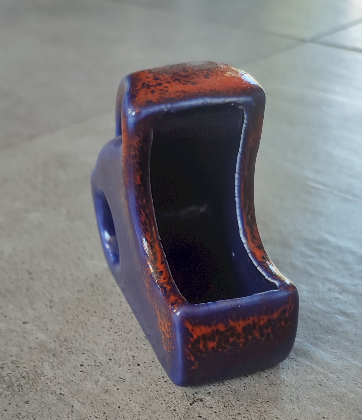 Small decorative Italian ceramic from the 1960s with a modernist design. Sculptural shape with an open handle and circular opening, typical of Italian design of the time, in the spirit of productions from the Bertoncello factory. Beautiful deep cobalt blue glazing accented with reddish-brown, achieved by layering glazes during firing, giving a slightly speckled appearance characteristic of Mid-Century Modern Italian decorative ceramics. Can be used as a small vase, a catch-all, works wonderfully as a sauceboat or simply as a decorative object. Very good condition. Height: 8 cm Length: 9 cm Width: 4 cm.
