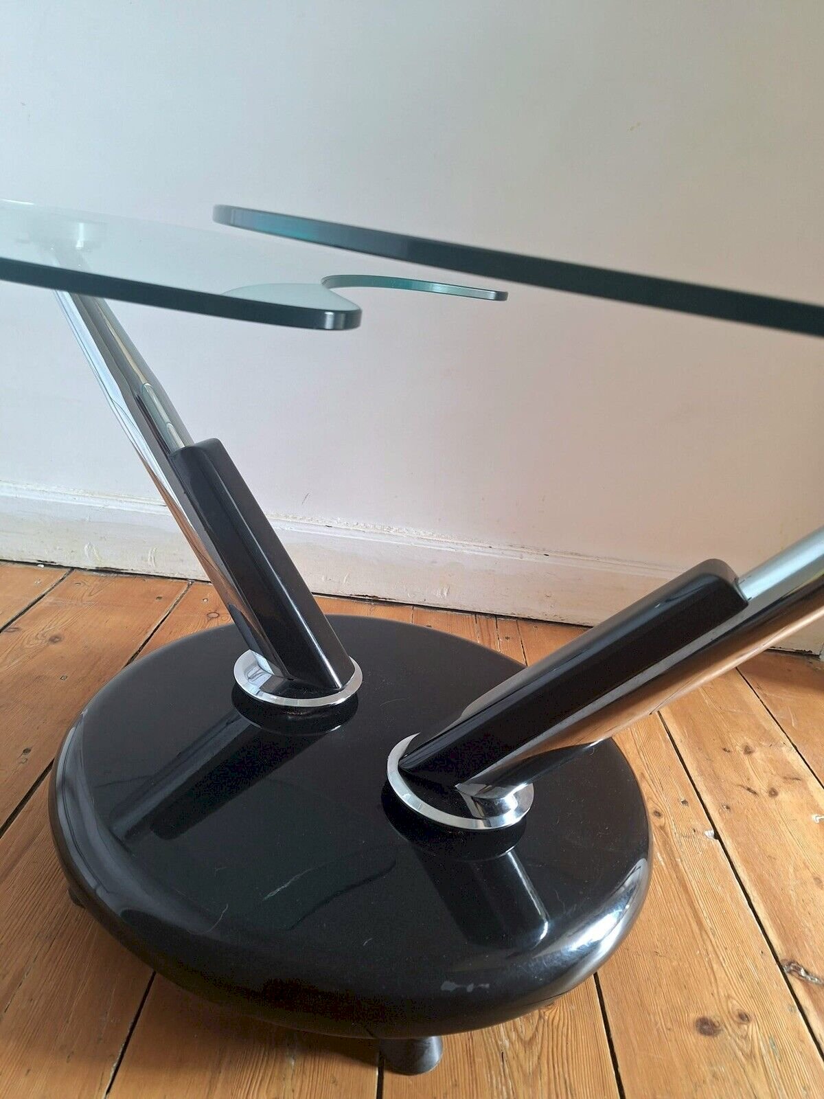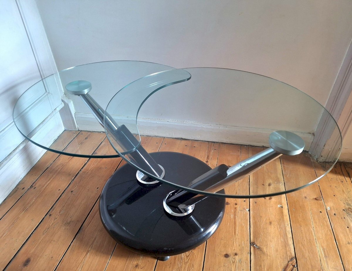 Thank you for writing to me if you would like to make me an offer. Extendable modular coffee table Draenert Studio by Georg Appelshauser, vintage furniture double rotating glass top. This coffee table separates into 2 tops by rotation. A perfectly functional system that slides like on the first day. Very clever and practical, ideal for entertaining in small spaces. Heavy. Some discreet signs of use, see photos: a few scratches on the tops and the base. Closed dimensions 70xh51cm. Open dimensions 105x70xh51cm. Pickup at my home or delivery possible via carrier (e.g., €60 to Paris and the surrounding area, contact me for other destinations). Delivery times of 2 to 4 days are imposed by and are therefore given purely as an indication. Design space age console Type: Table Subtype: Coffee table