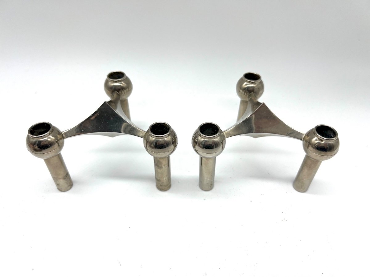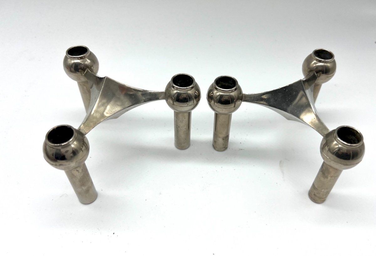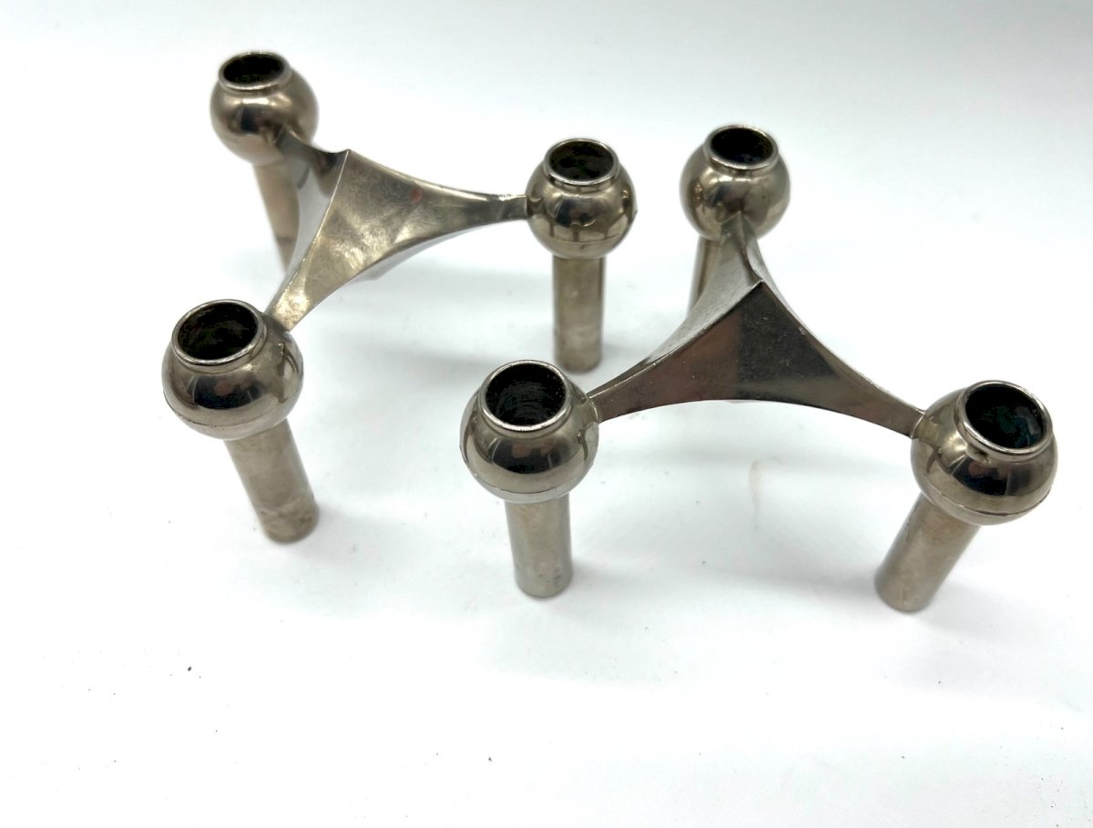Superb pair of modular stackable candle holders in chrome metal, typical of German design in the 1970s. Inspired by the iconic model by Fritz Nagel for BMF (Bayerische Metall Fabrik), these candlesticks can be used separately or combined to create a sculptural and architectural composition. Their geometric design, both simple and bold, embodies the Space Age and Mid-Century Modern aesthetic. The chrome surfaces elegantly reflect light, adding a touch of modernity to any interior. Ideal for design, vintage, or contemporary decoration: on a sideboard, coffee table, or console. Era: circa 1970 Origin: Germany Material: chrome metal Dimensions (each candlestick): Height 7.5 cm – Width 13 cm Condition: general good condition, slight traces of use on the chrome Type: Display object, Decorative Period: 20th-century Design Origin: Germany Material: Silvered metal