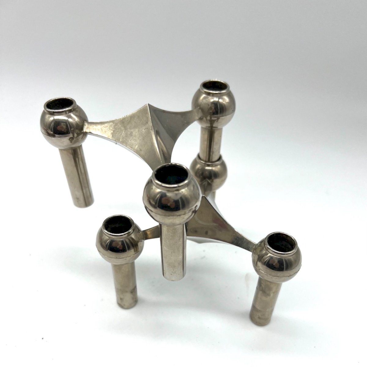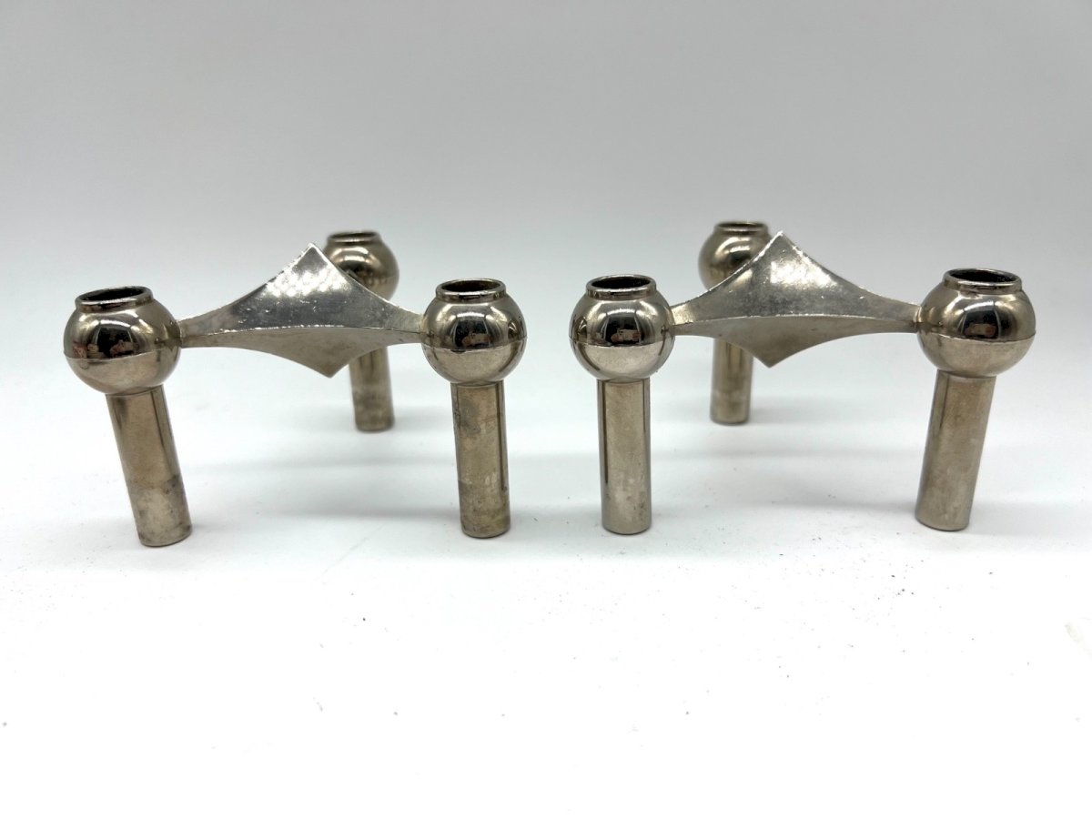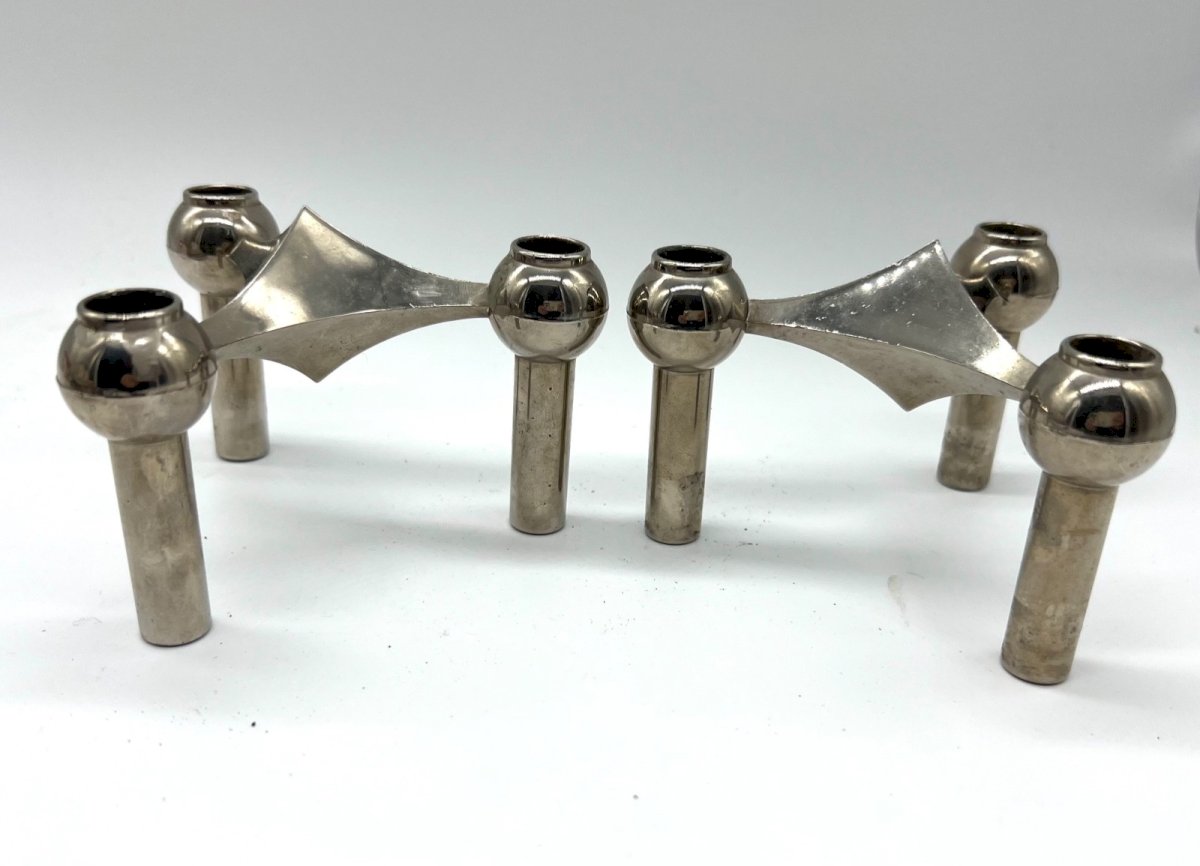 Superb pair of modular stackable candle holders in chrome metal, typical of German design in the 1970s. Inspired by the iconic model by Fritz Nagel for BMF (Bayerische Metall Fabrik), these candlesticks can be used separately or combined to create a sculptural and architectural composition. Their geometric design, both simple and bold, embodies the Space Age and Mid-Century Modern aesthetic. The chrome surfaces elegantly reflect light, adding a touch of modernity to any interior. Ideal for design, vintage, or contemporary decoration: on a sideboard, coffee table, or console. Era: circa 1970 Origin: Germany Material: chrome metal Dimensions (each candlestick): Height 7.5 cm – Width 13 cm Condition: general good condition, slight traces of use on the chrome Type: Display object, Decorative Period: 20th-century Design Origin: Germany Material: Silvered metal