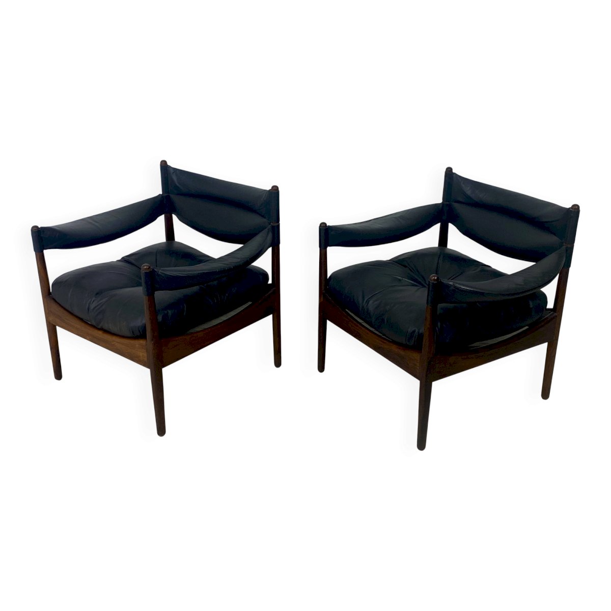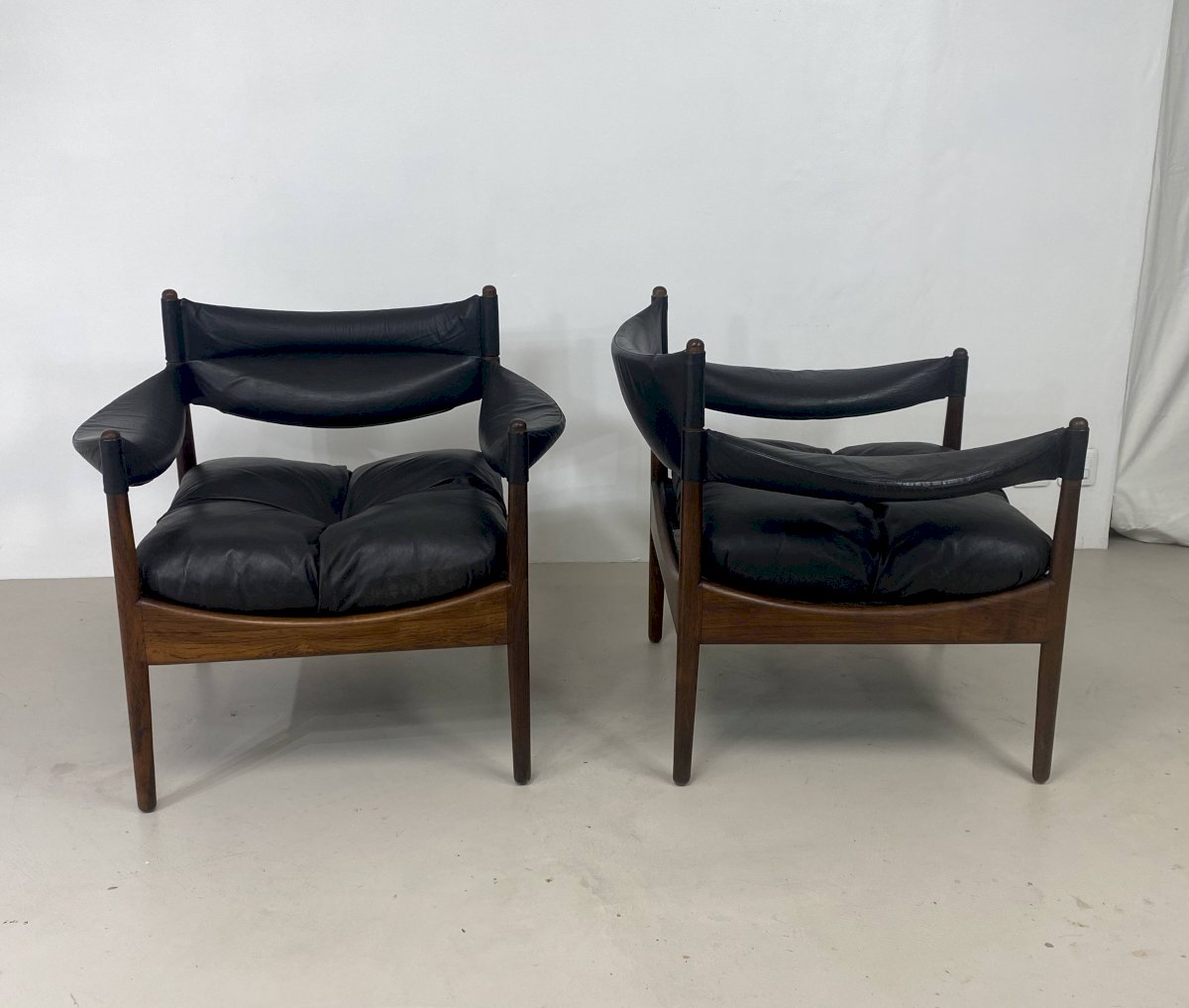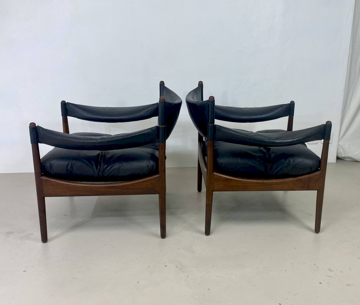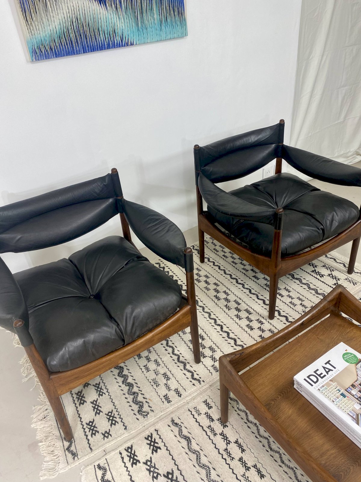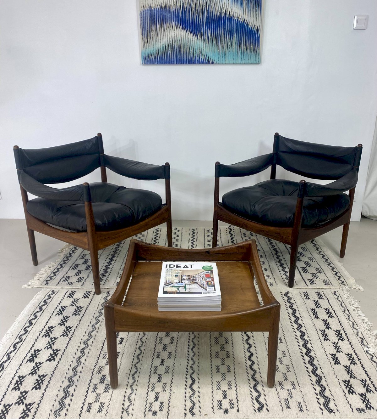 Pair of Modus armchairs, in black leather and rosewood, designed by Kristian Vedel for Søren Willadsen Møbelfabrik. Made in the 1960s in Denmark, these armchairs perfectly embody mid-century modern Scandinavian design. The rosewood frame is in very good condition. The seats and backs are original; the leather shows some minor age-related imperfections, visible in the photos. Materials: leather, rosewood. Color: black. Armchair dimensions: • Width: 55cm. • Depth: 60cm. • Total height: 66cm. Seat height: 39cm. Table dimensions 54/54/32cm. L: 55 W: 60 H: 66