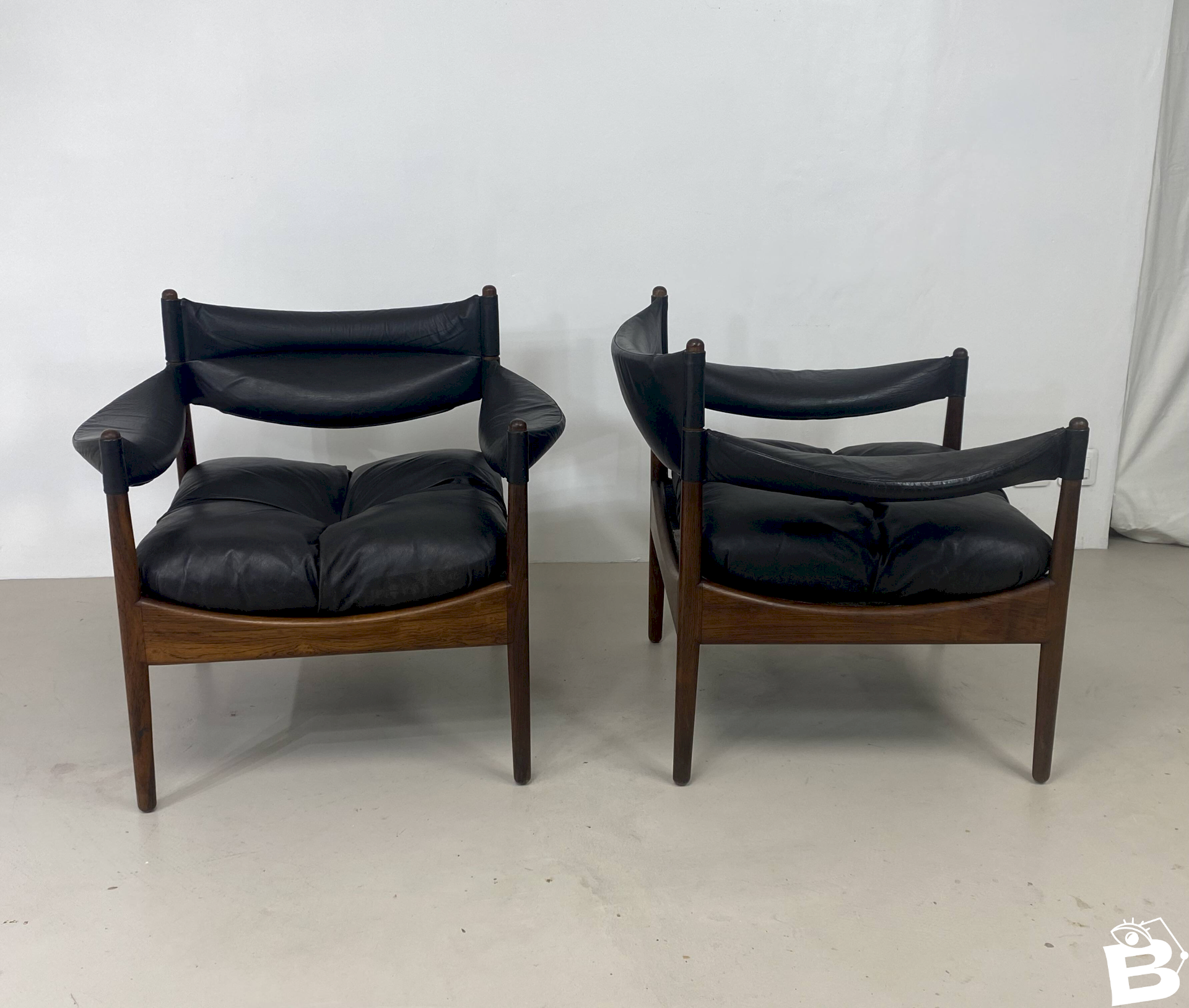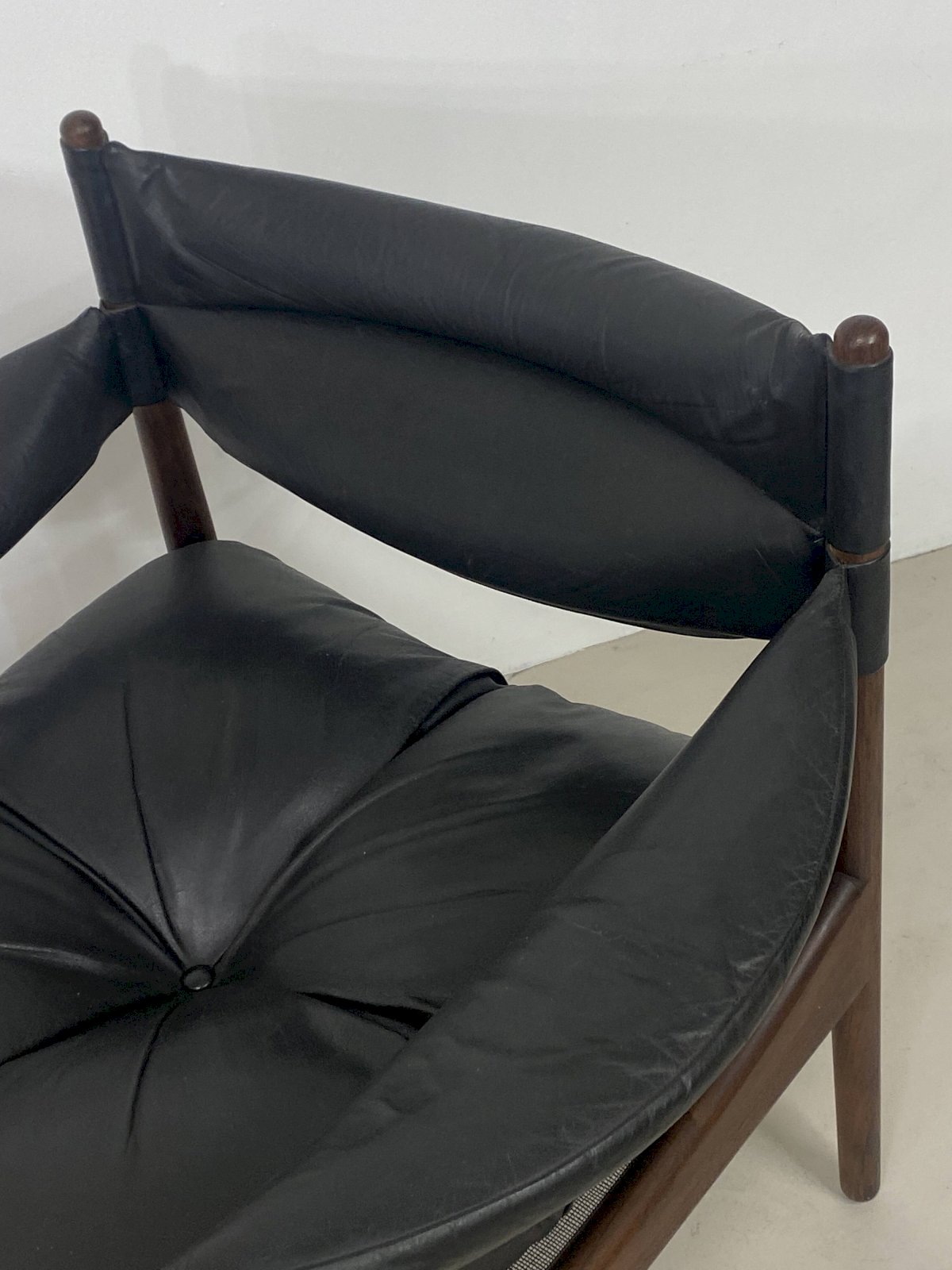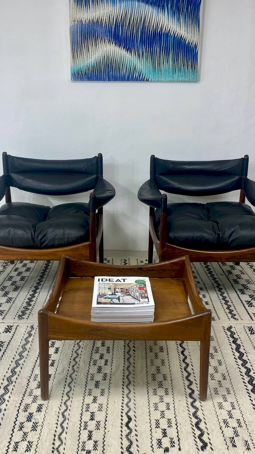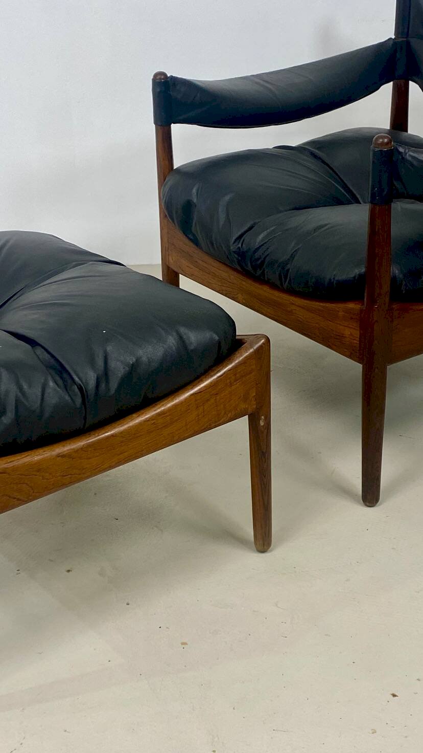 Pair of Modus armchairs, in black leather and rosewood, designed by Kristian Vedel for Søren Willadsen Møbelfabrik. Made in the 1960s in Denmark, these armchairs perfectly embody mid-century modern Scandinavian design. The rosewood frame is in very good condition. The seats and backs are original; the leather shows some minor age-related imperfections, visible in the photos. Materials: leather, rosewood. Color: black. Armchair dimensions: • Width: 55cm. • Depth: 60cm. • Total height: 66cm. Seat height: 39cm. Table dimensions 54/54/32cm. L: 55 W: 60 H: 66