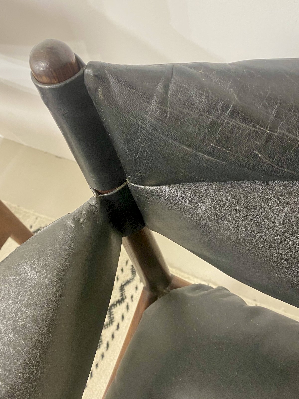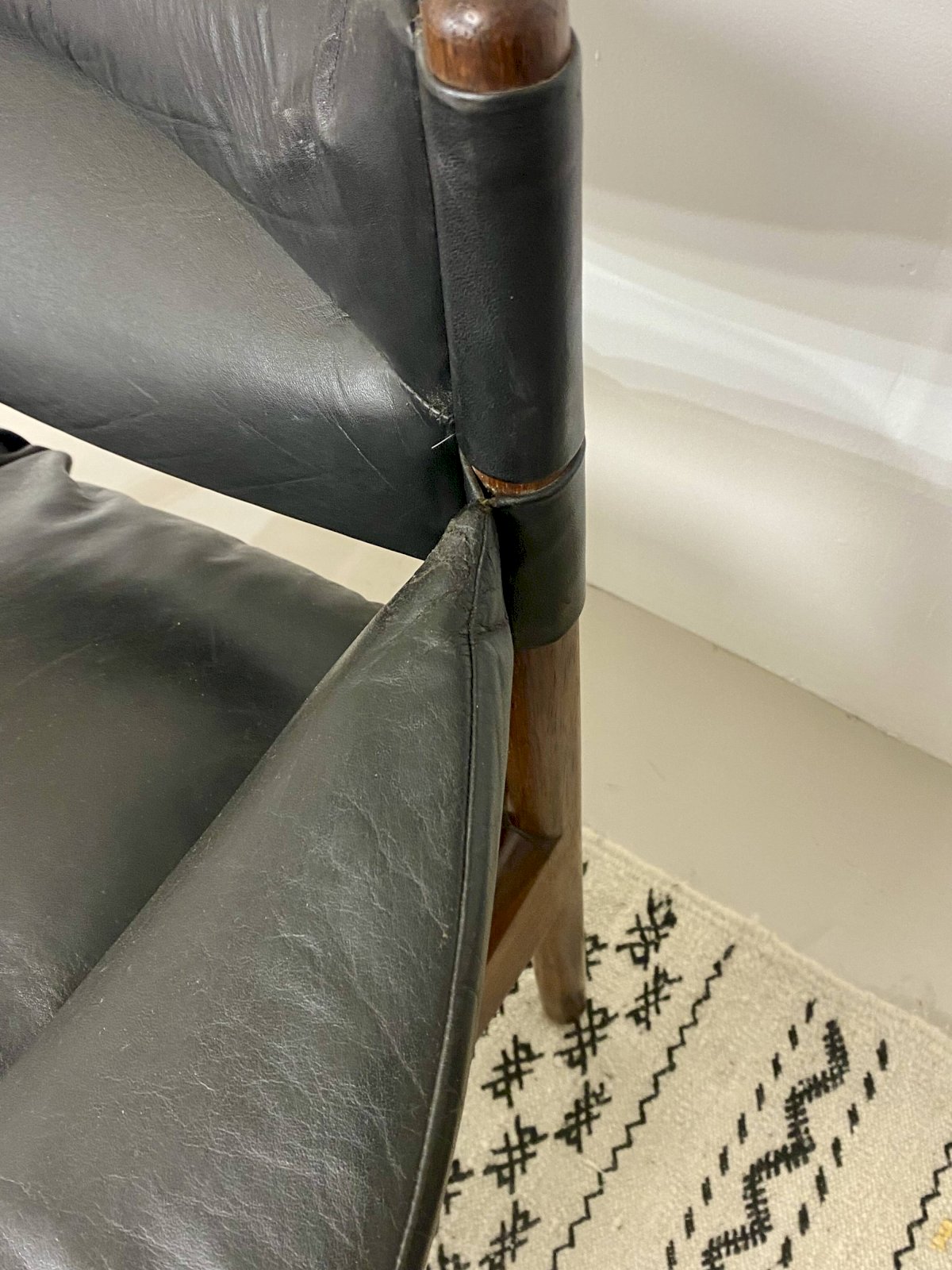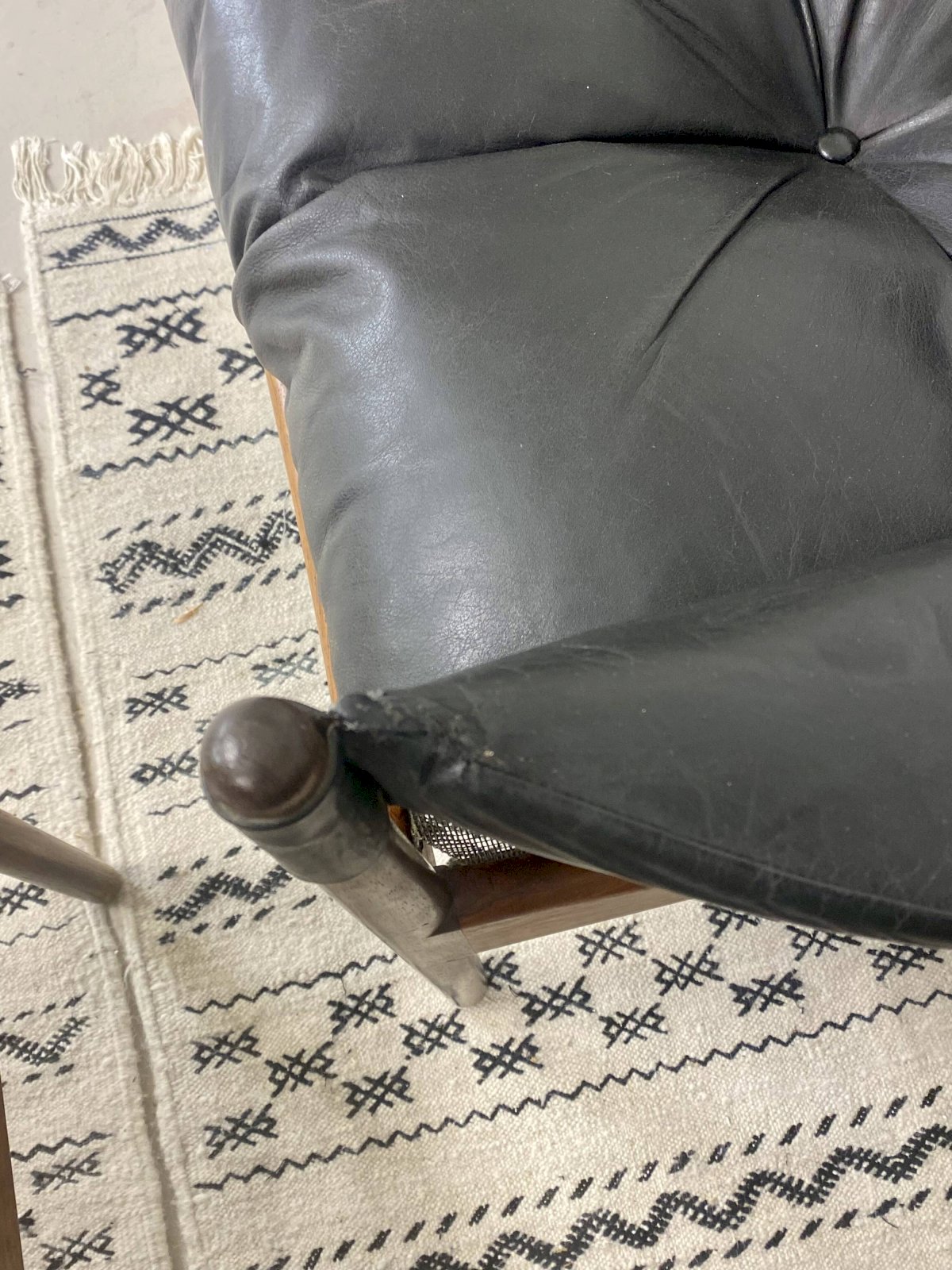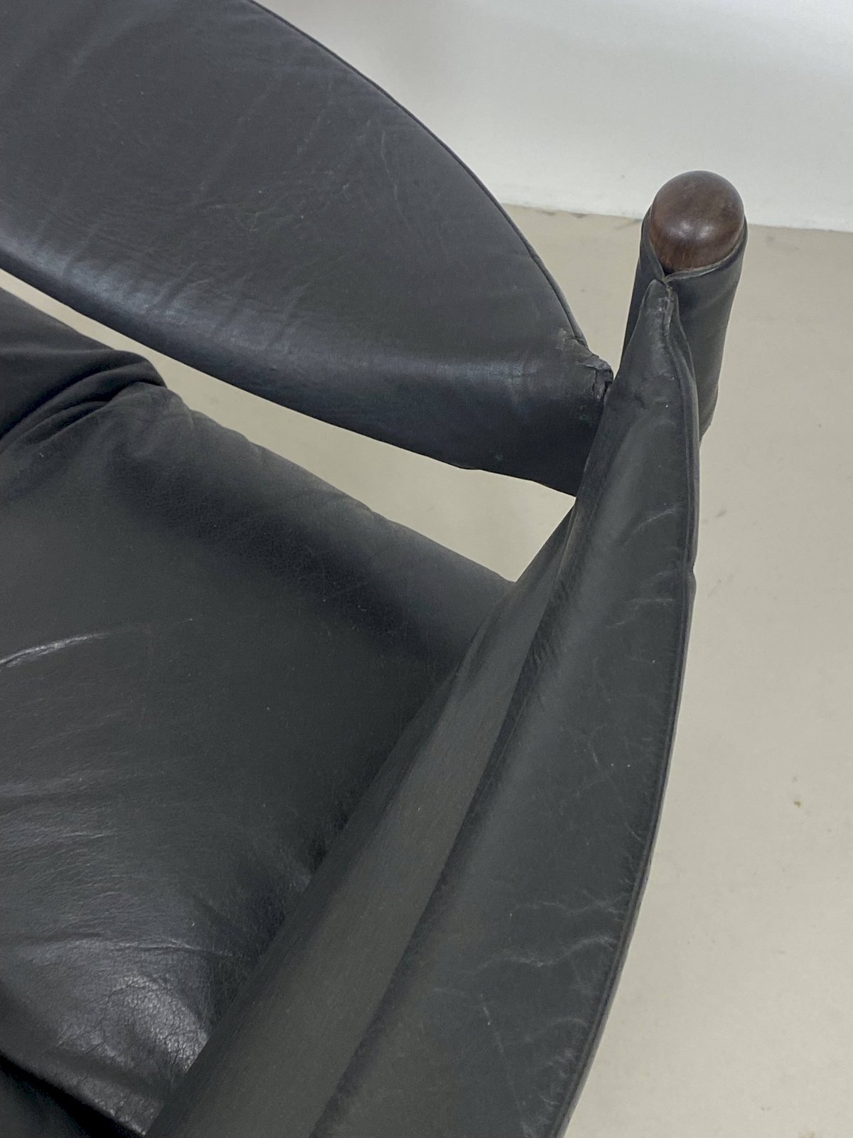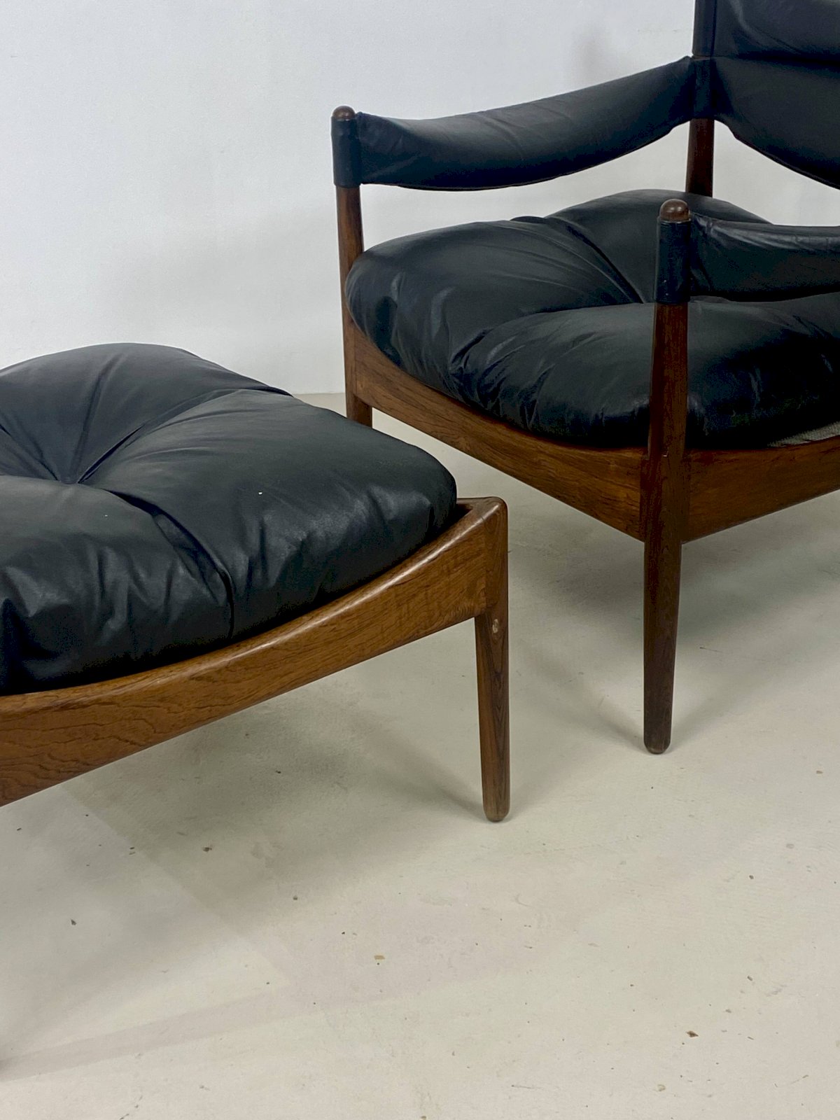 Pair of Modus armchairs, in black leather and rosewood, designed by Kristian Vedel for Søren Willadsen Møbelfabrik. Made in the 1960s in Denmark, these armchairs perfectly embody mid-century modern Scandinavian design. The rosewood frame is in very good condition. The seats and backs are original; the leather shows some minor age-related imperfections, visible in the photos. Materials: leather, rosewood. Color: black. Armchair dimensions: • Width: 55cm. • Depth: 60cm. • Total height: 66cm. Seat height: 39cm. Table dimensions 54/54/32cm. L: 55 W: 60 H: 66