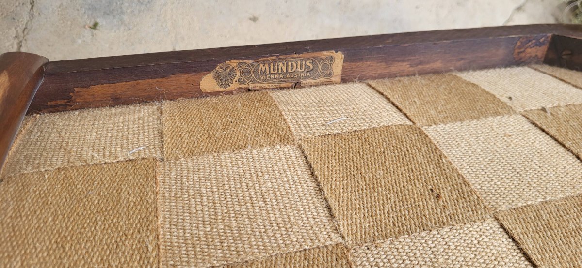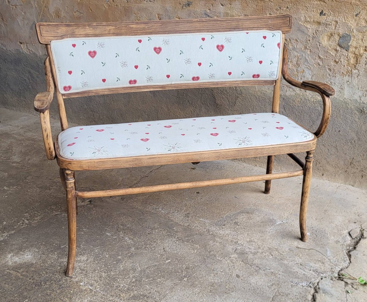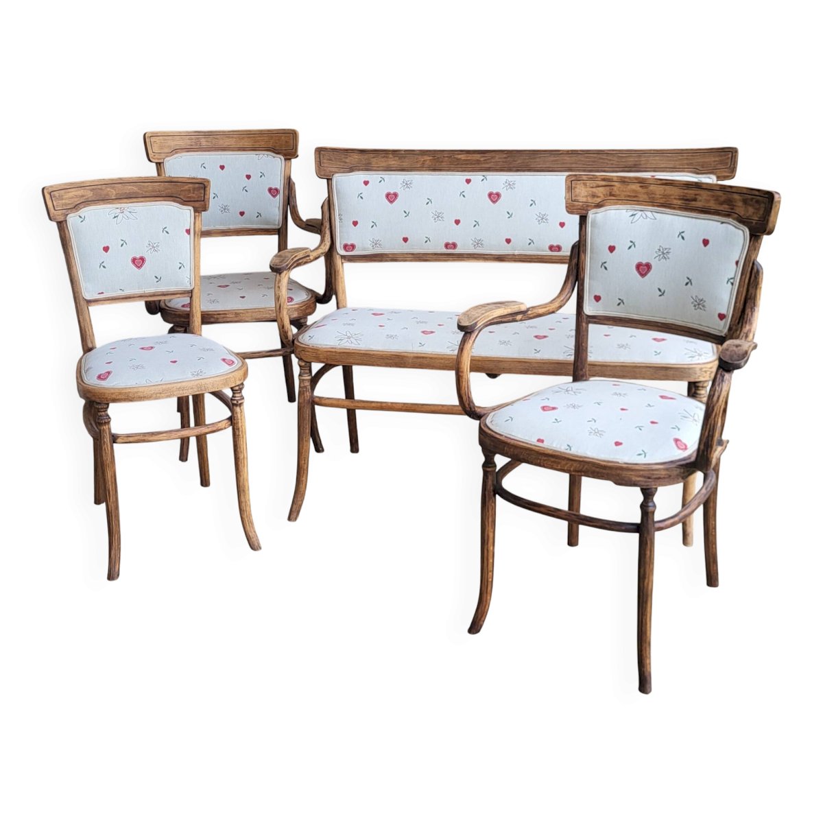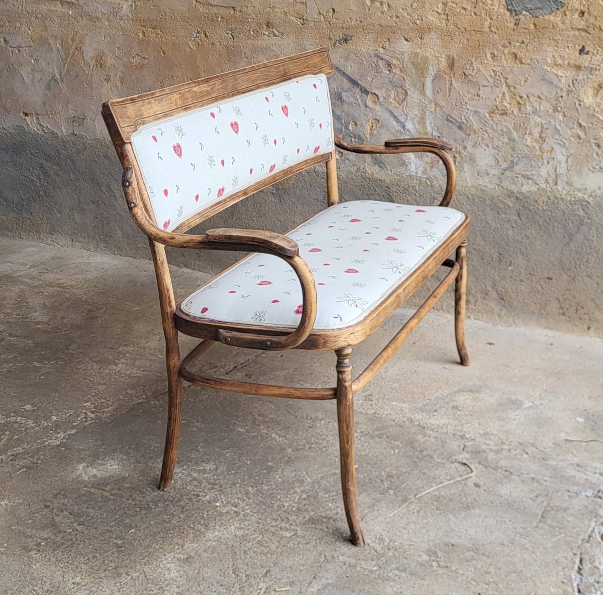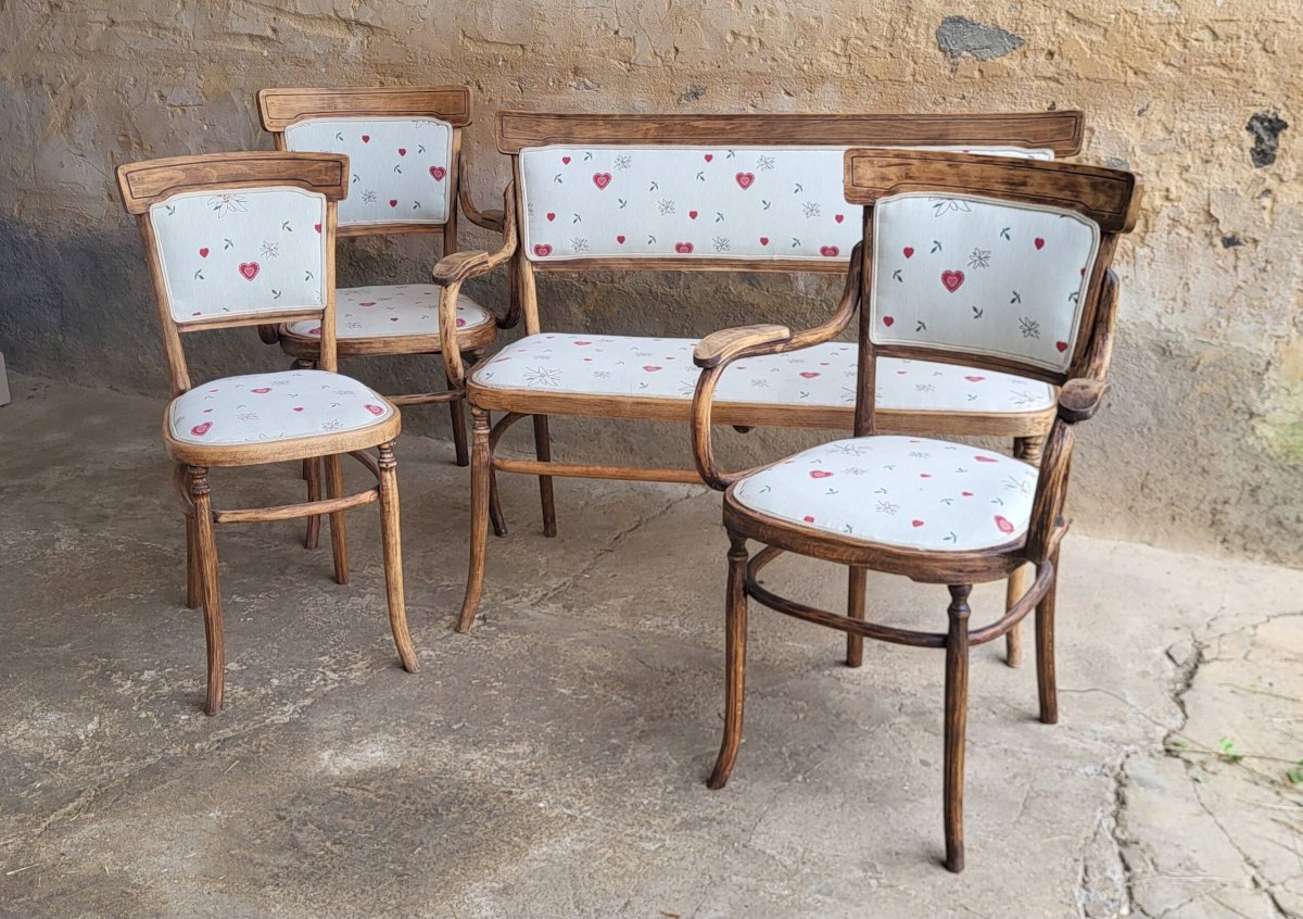 Curved wood salon Mundus Vienna Austria 1900, comprising 1 bench, 2 armchairs, and a chair. New upholstery and modern fabric.