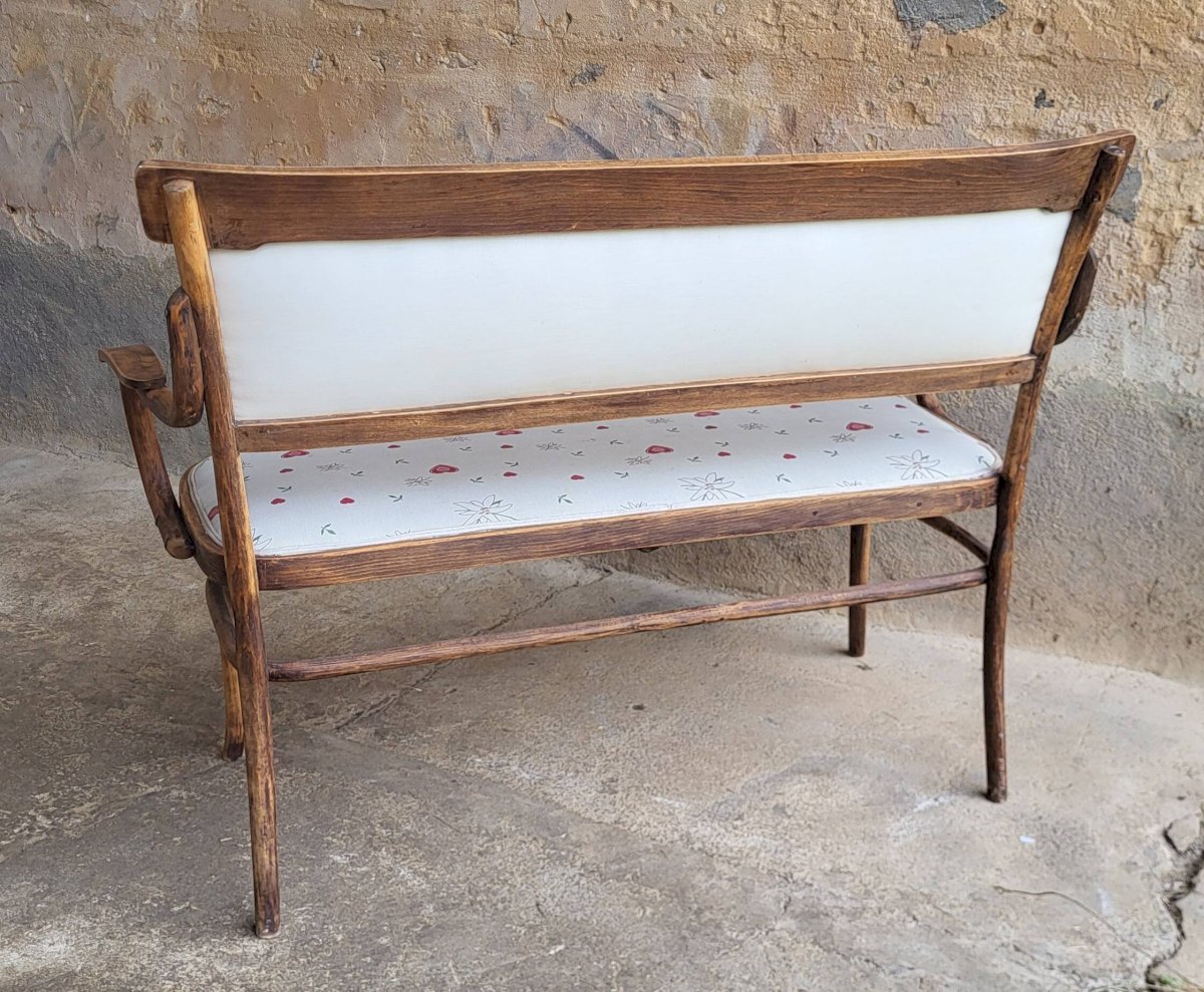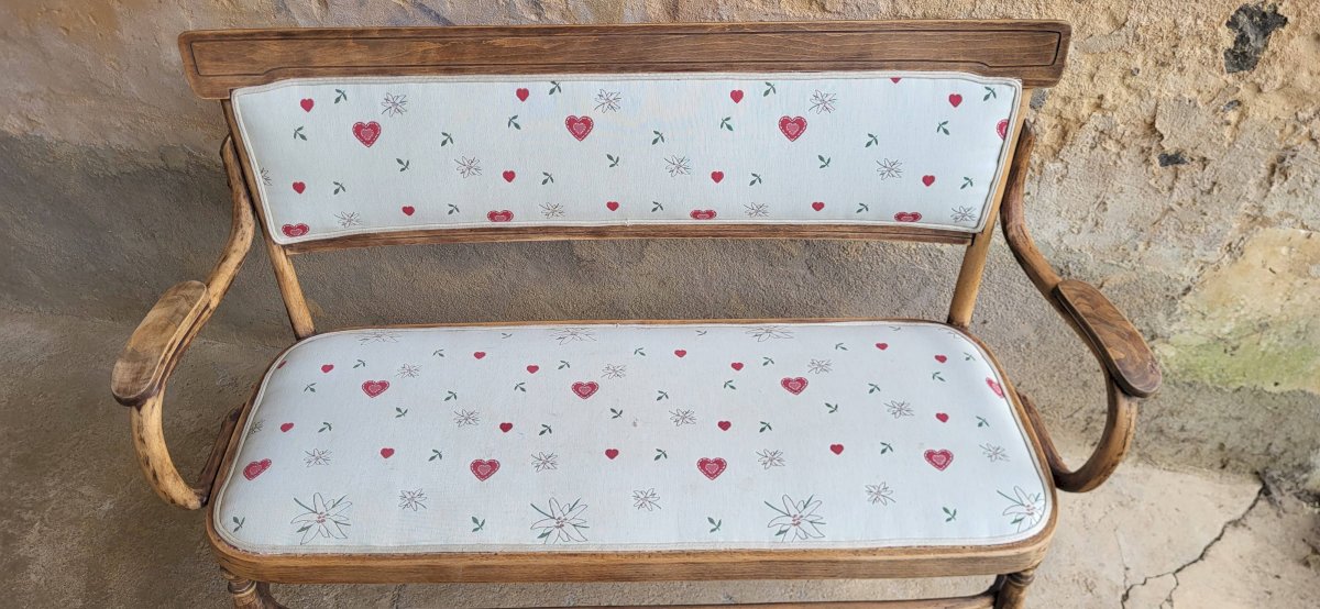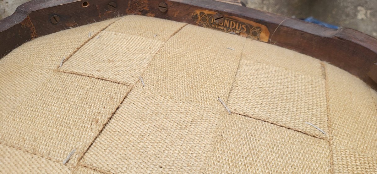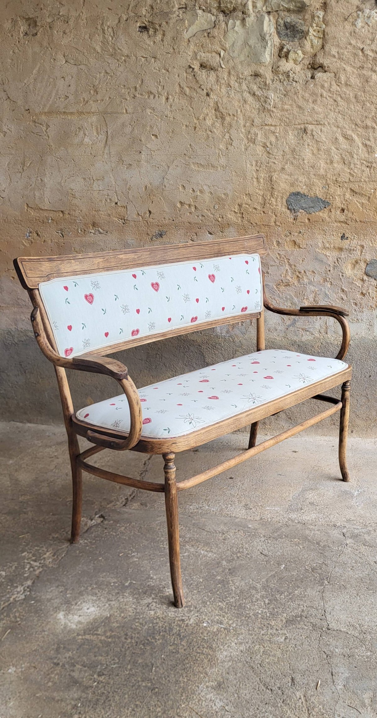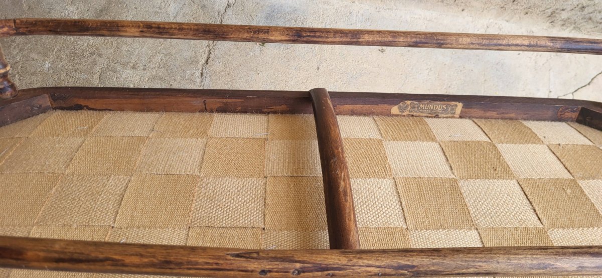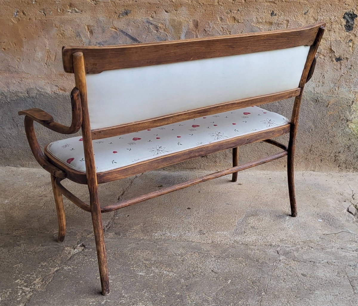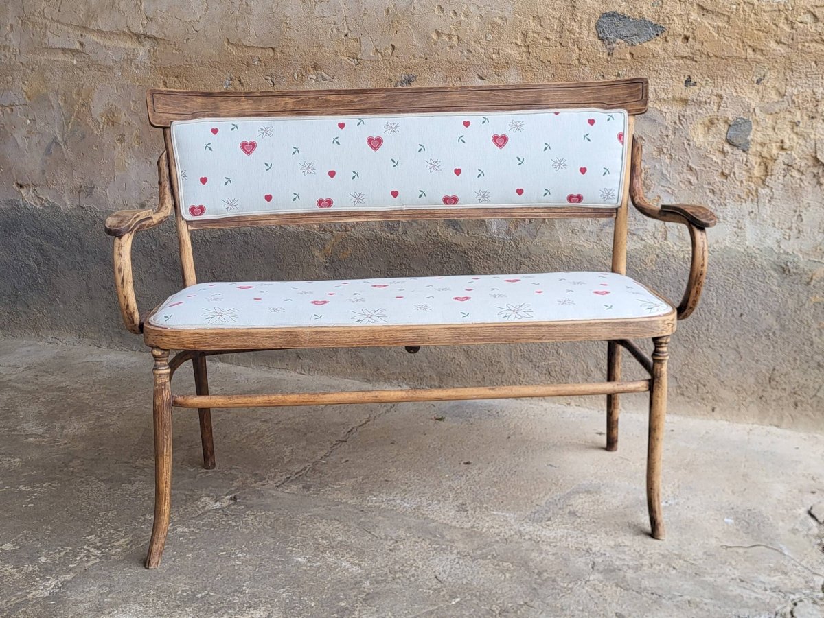 Curved wood salon Mundus Vienna Austria 1900, comprising 1 bench, 2 armchairs, and a chair. New upholstery and modern fabric.