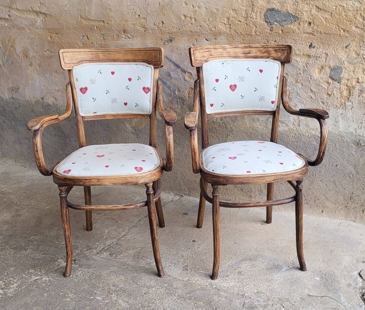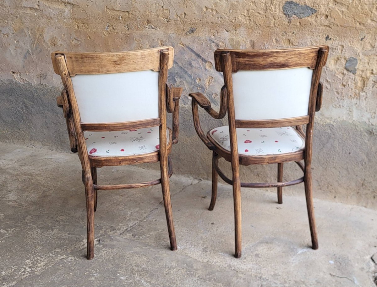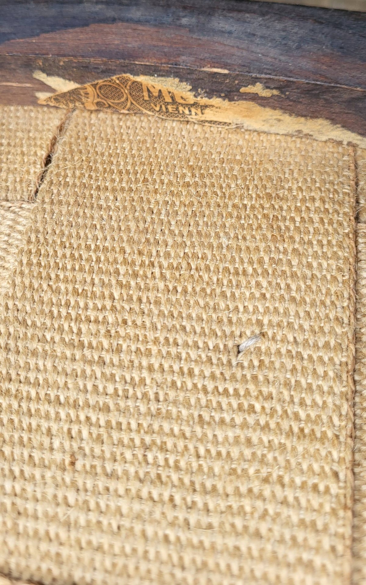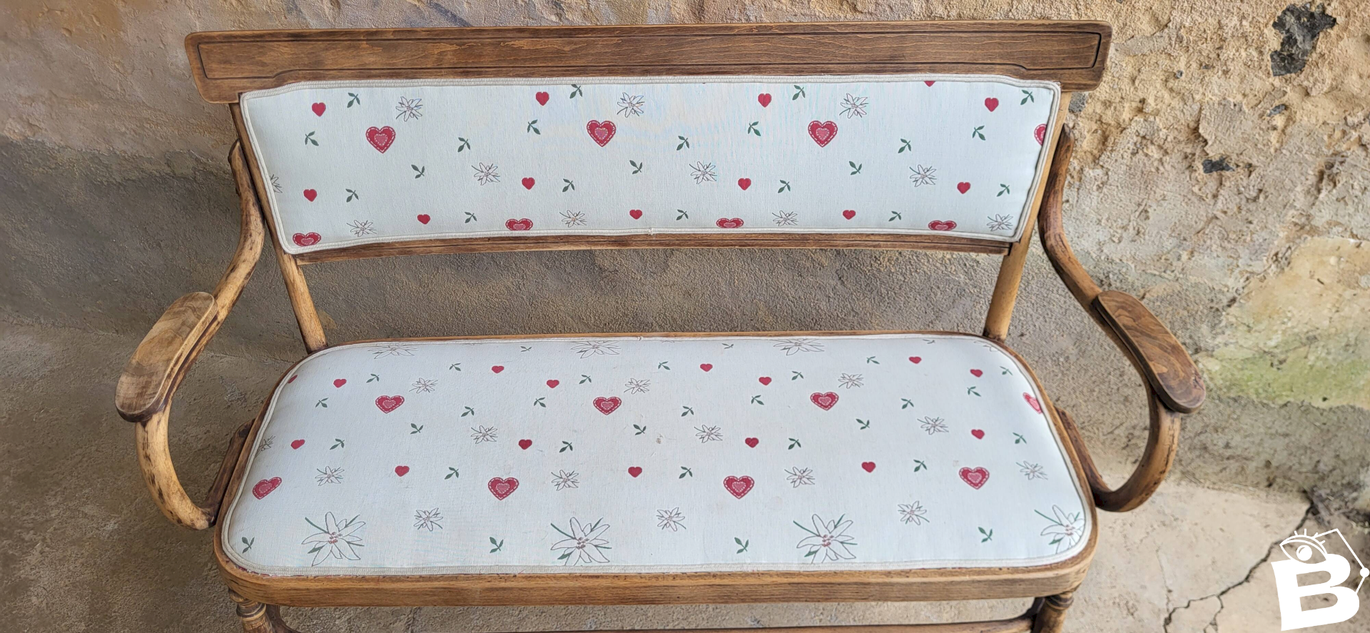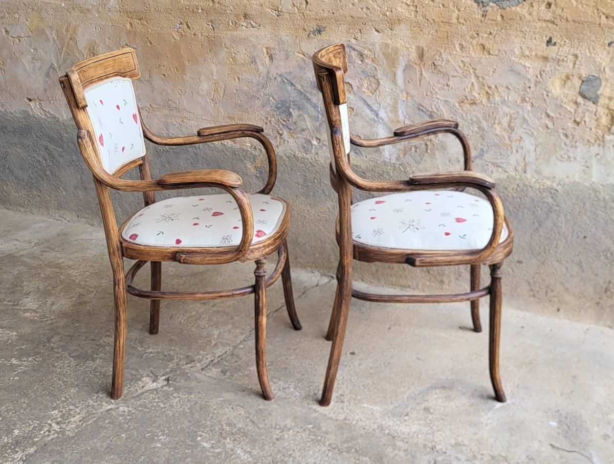 Curved wood salon Mundus Vienna Austria 1900, comprising 1 bench, 2 armchairs, and a chair. New upholstery and modern fabric.