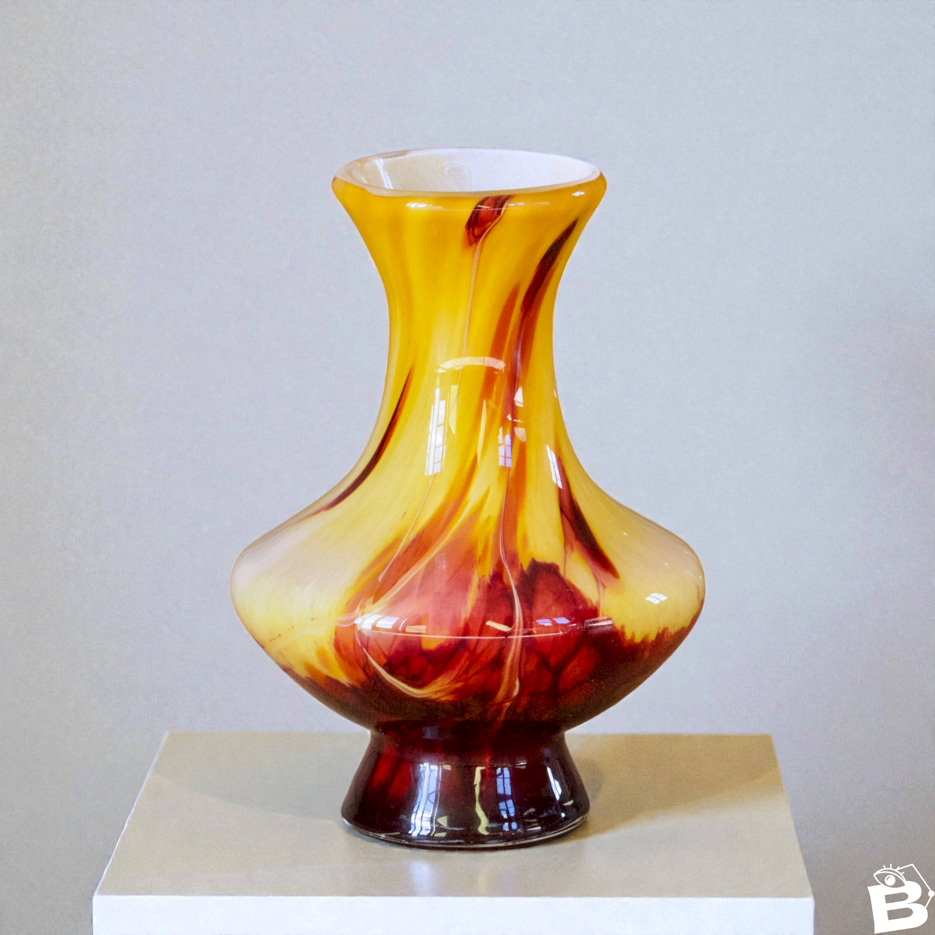 Stunning mouth-blown opaline glass vase from Murano, with a particularly warm and luminous flamed decoration, circa 1960. The decor features a gradient of golden yellows, oranges, and deep reds. The hand-blown glass showcases beautiful internal movements and vibrant shades, characteristic of handcrafted work. Generous and curved body, elongated and flared neck, circular base. It is in very good condition. ? 24 X 16 cm. ✨ Carefully packaged for shipping. ✨ Professional shop. ✨ You will receive an invoice and benefit from customer service after each purchase. ✨ We have other listings online, feel free to take a look. 01/26. L: 16 W: 24 H: 24
