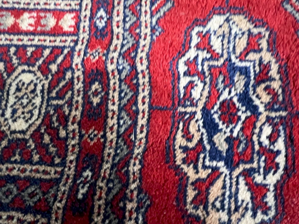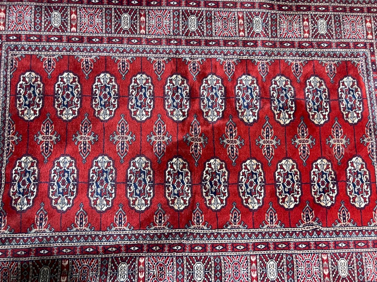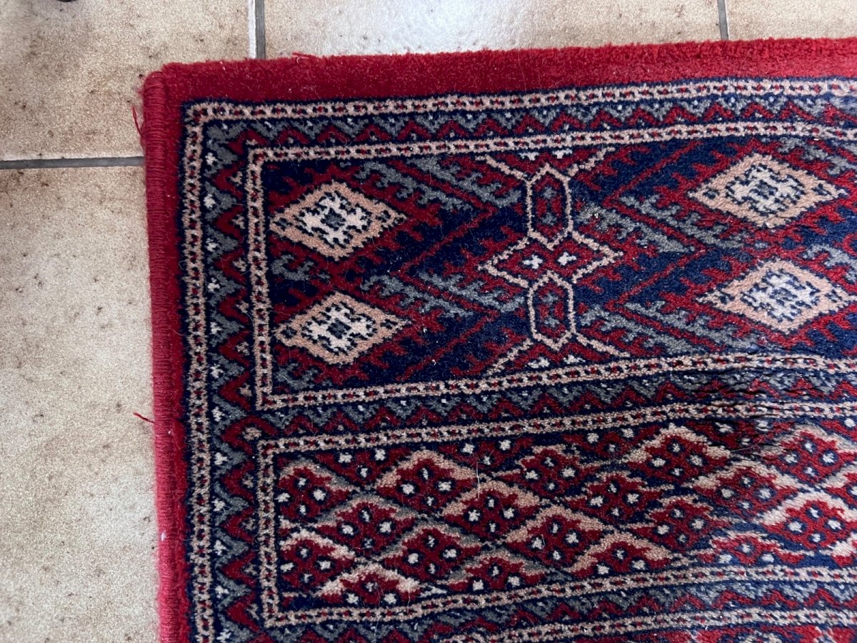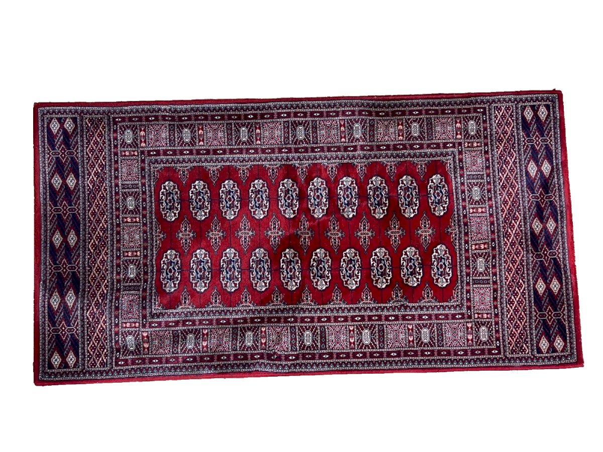 Mykene wool rug – Belgian manufacturing – Traditional oriental pattern Elegant rug by Mykene (Decorwool Rugs), made in Belgium by Kennedy Carpets. High-quality model made of 100% New Zealand wool, high density (1,200,000 points/m²), designed for intensive use. Its decor inspired by the East, featuring deep red tones and geometric patterns, brings warmth and character to an entryway, hallway, or at the foot of a bed. Dimensions: 83 cm x 160 cm (32.7 x 63 inches) Material: 100% New Zealand virgin wool Brand: Mykene – Decorwool Rugs Belgian manufacture Condition: Very good overall condition. Colors still vibrant. Original label preserved. This rug offers the visual appeal of a classic oriental piece with the durability of modern Belgian craftsmanship. Ideal for structuring a space while maintaining timeless elegance. Careful and protected shipping. Condition: Used: Item has been worn. ...Used: Item has been worn. any potential imperfections. Color: Red Type: Decorative rug Brand: Decor wool Country of origin: Belgium Material: Wool Length: 83 cm Width: 160 cm