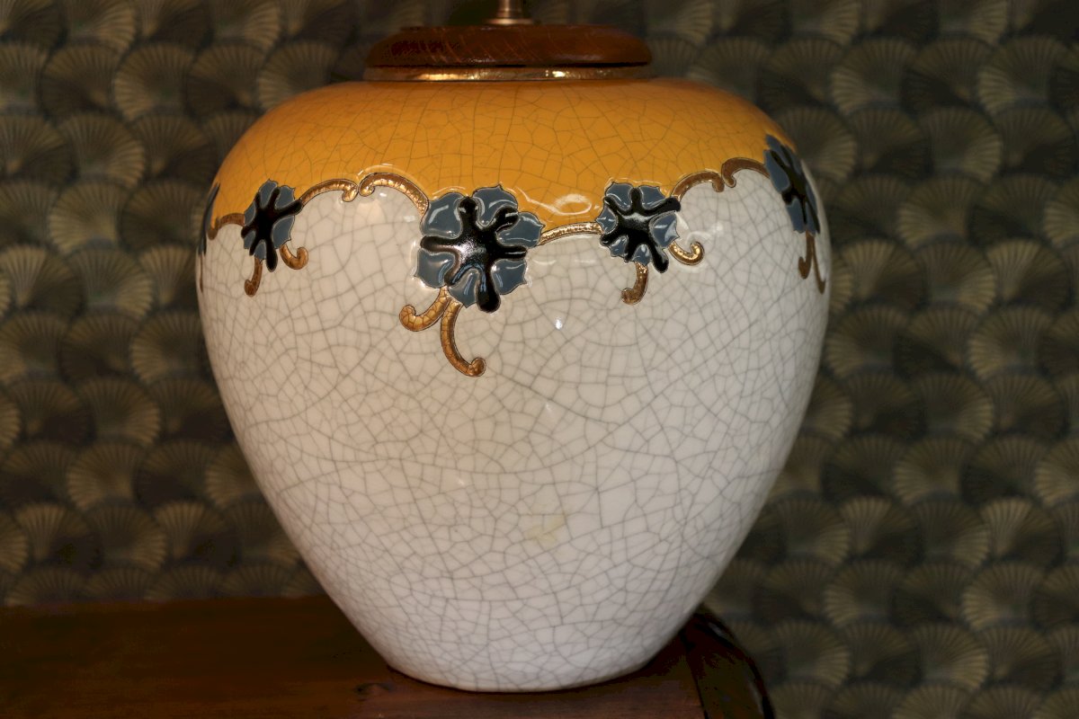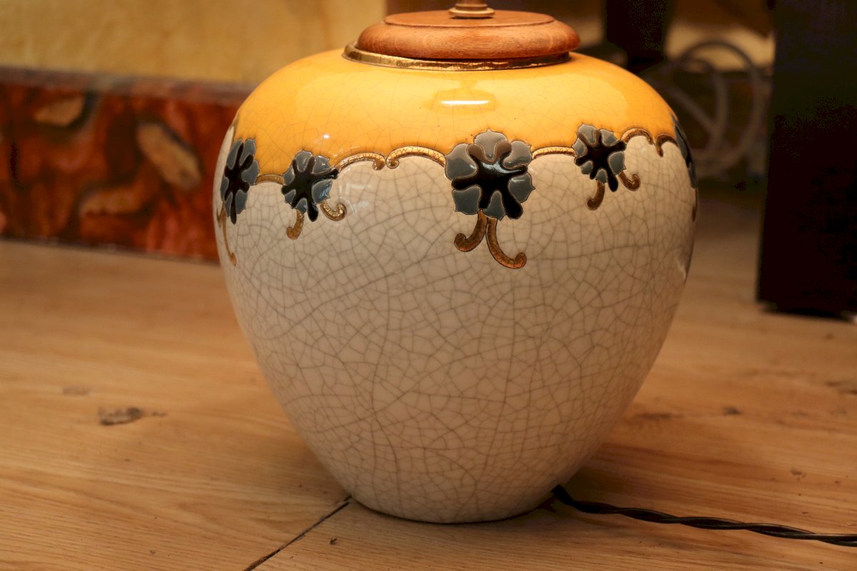 Table lamp in Nancy enamel. Label present as well as a stamp underneath the lamp. Very similar to Longwy enamel. Fully functional lamp. Cream-colored shade.