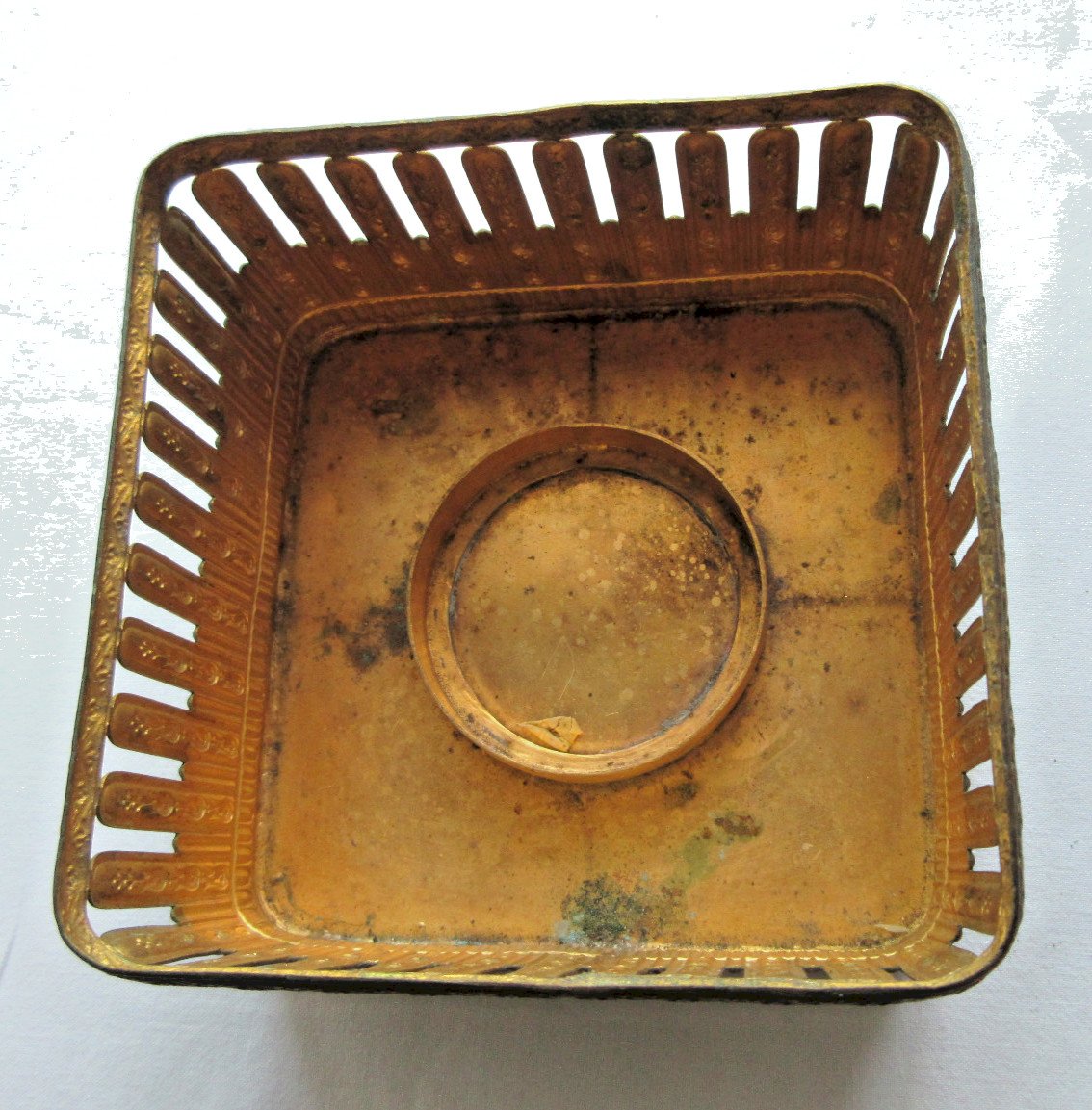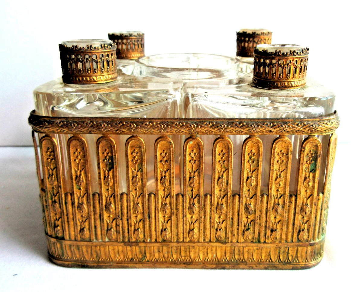 Worldwide sale. Napoleon III perfume cave. Antique perfume cave consisting of 4 bottles around another round bottle. The stopper and the lid are missing on each glass. The set is in a square openwork gilded brass "cave." Dimensions: 11 cm on each side, height: 9 cm. The central round bottle measures 5.7 cm in diameter. Good condition, no defects, except that it is incomplete. Beautiful perfume cave for collection. The photos complement the description. Authenticity: Original Type: Showcase item, Decorative Origin: France Subtype: Glass Style: Napoleon III Material: Brass