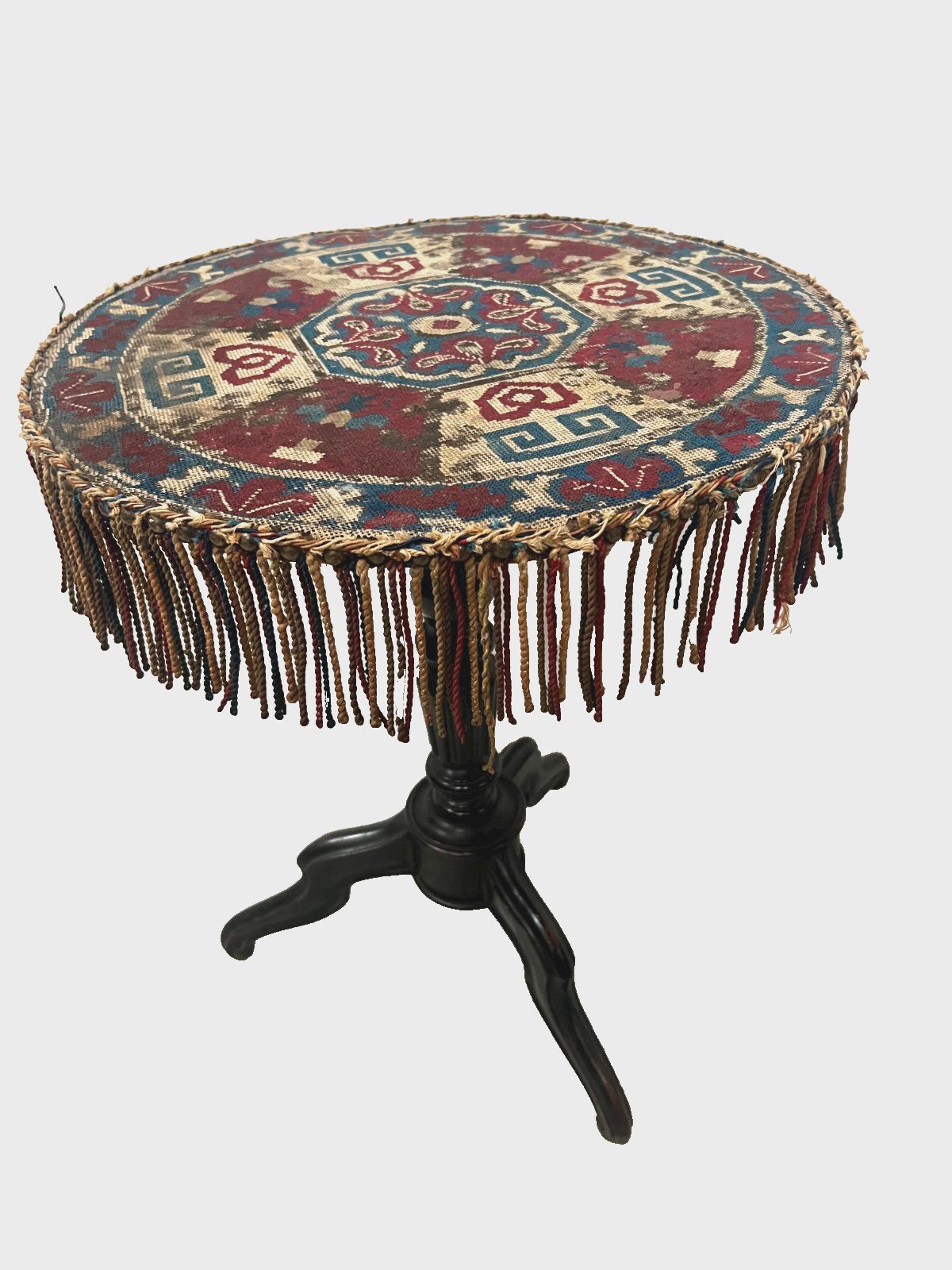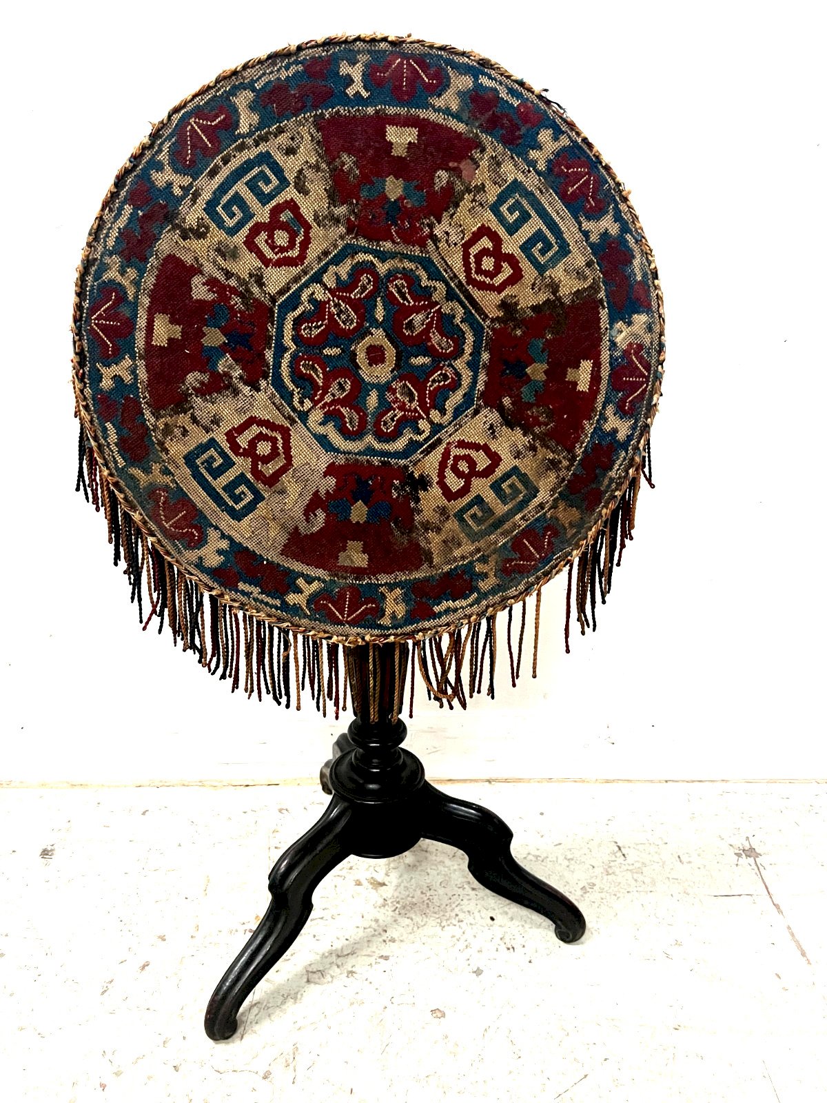 Napoleon III period tilting side table, tripod base in blackened wood, top covered with a dotted upholstery (needs cleaning). Good condition. Dimensions H 69 x 55 cm in diameter. 19th century. Type: Table, Subtype: Side Table, Height: 69, Style: Napoleon III, Length: 55, Width: 55, Shape: Round.