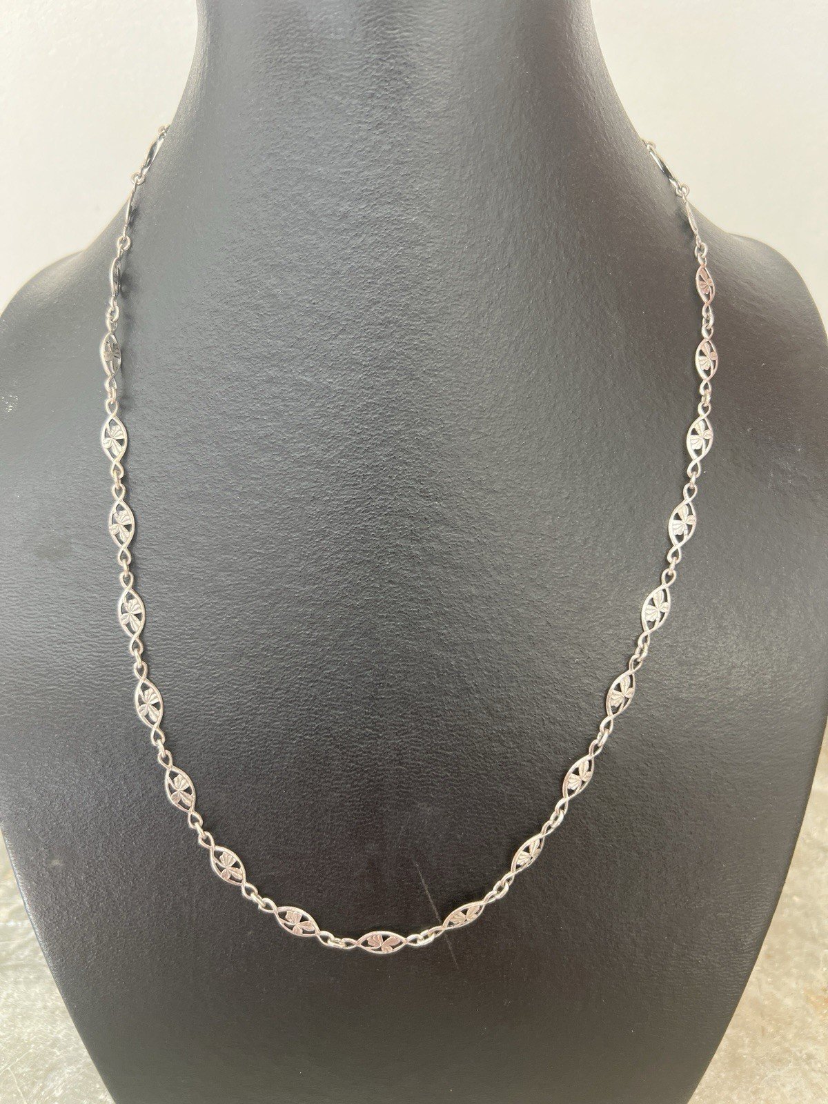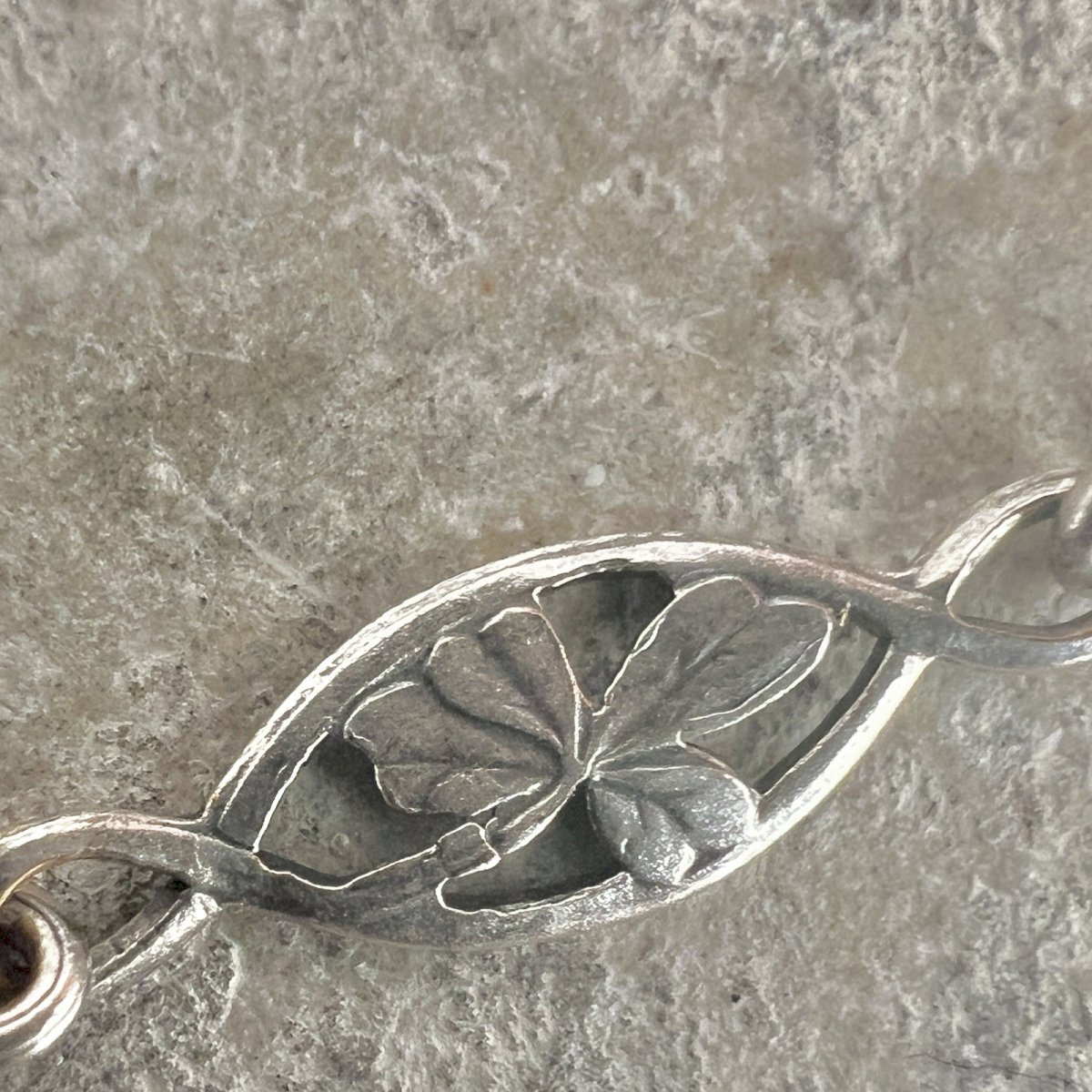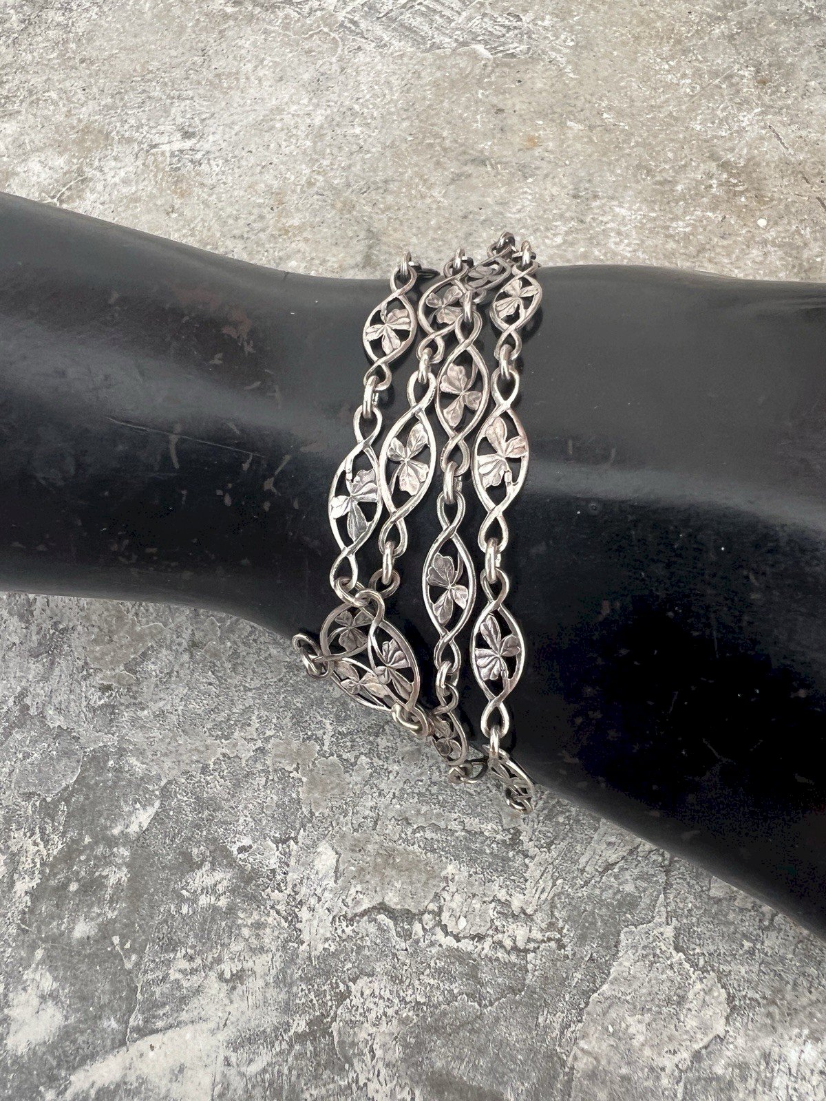 Rare chain, Art Nouveau period (1890/1910) in metal, silver-plated, with a solid silver clasp representing a clover. Minor signs of wear. Dimensions approximately 63.5 cm in total length and about 0.5 cm in width. Condition: Pre-owned: Item that has been worn. ... Pre-owned: Item that has been worn. any possible imperfections. Dominant stone: None Stone Brand: Art Nouveau 1890/1910 Type: Chain Dominant color: Silver-plated Material: N Theme: Lucky clover Pendant shape: Clover