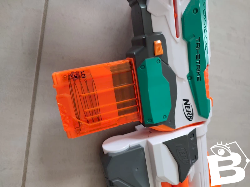 Nerf Tri Strike gun in good condition. Only signs of wear from use but works well. Comes with a magazine of 10 darts.