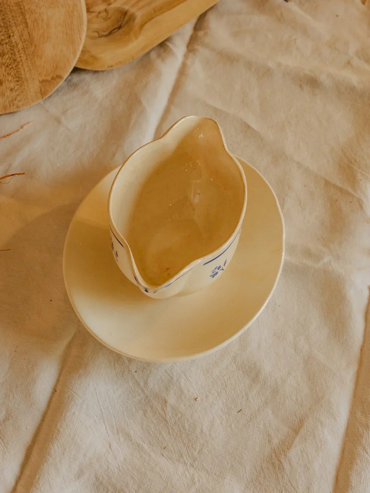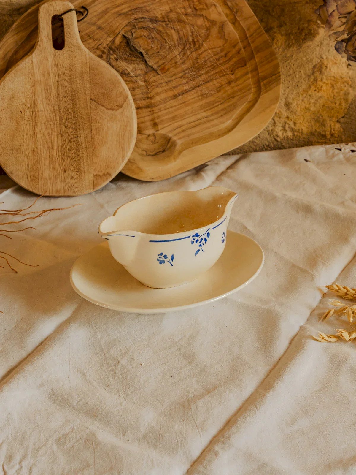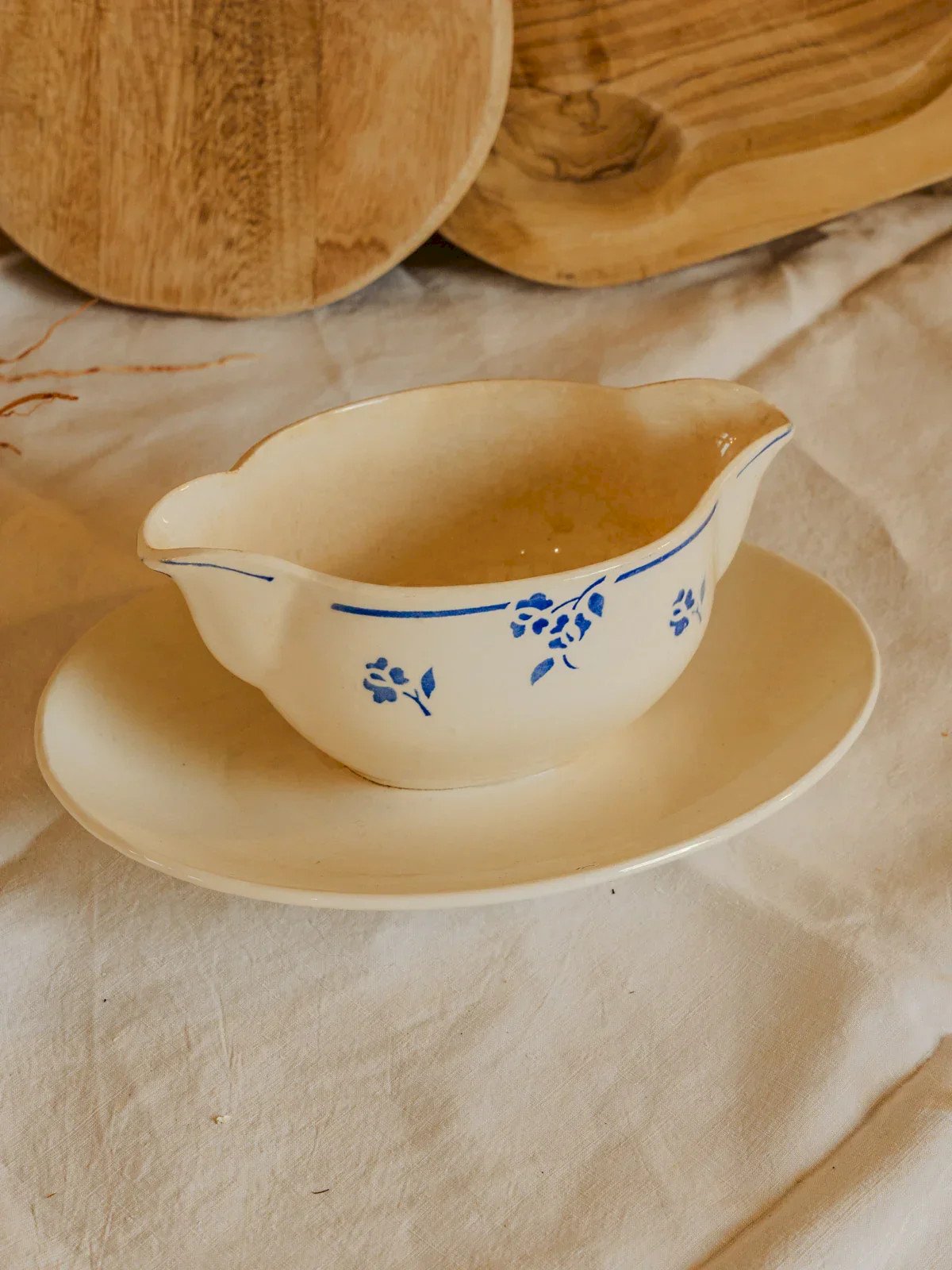 Enhance your table with this Digoin Sarreguemines sauce boat made of earthenware, delicately adorned with a pattern of small blue flowers. Its size and balanced proportions make it ideal for presenting sauces, condiments, or small preparations during a convivial meal. The material and fine glaze reflect traditional craftsmanship, bringing an authentic and rustic touch to your table settings. Perfect for a French ambiance, from a simple lunch to an elegant dinner. Length: 16 cm Width with saucer: 17 cm Height: 8.5 cm Width: 9 cm Condition: Used item. Item showing some signs of superficial wear,... Used item. Item showing some signs of superficial wear, fully operational and functioning correctly. It may be a demonstration model or an item returned to the store after a short period of use. Possible imperfections. Brand: Debongout Type: Vintage product Material: Earthenware Style: Country.