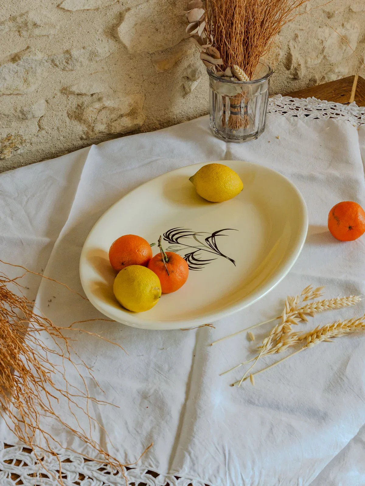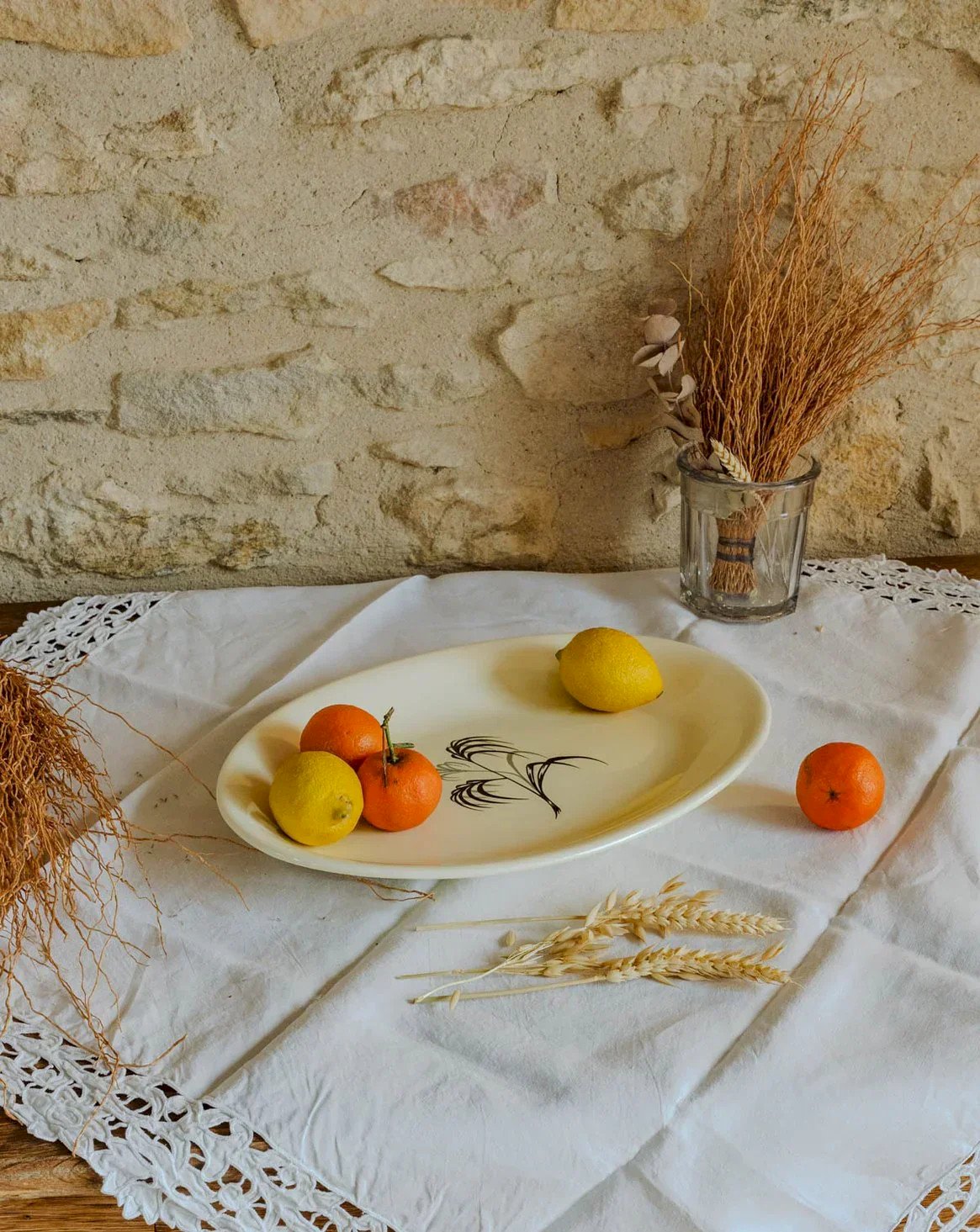 Enhance your table with this earthenware serving dish, Las Palmas model from Faïencerie Salins. Its elongated and shallow shape offers a great capacity to present fish, antipasti, or cheese assortments, and fits well with both everyday meals and guest tables. The natural-toned glazing and the simple line of the model bring a warm and Mediterranean touch, perfect for a friendly and elegant atmosphere. Length: 36 cm Width: 25 cm Height: 3 cm Condition: Used: Item that has been used. Item showing some signs of superficial wear, fully operational and functioning correctly. It may be a demonstration model or an item returned to the store after a short period of use. Any imperfections. Brand: Debongout Type: Thrifted product Material: Earthenware Style: Country