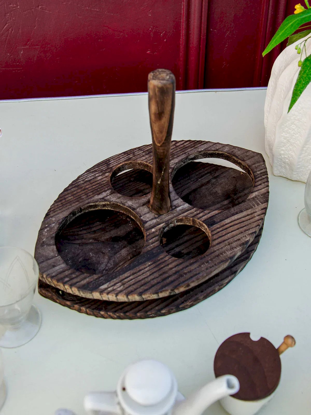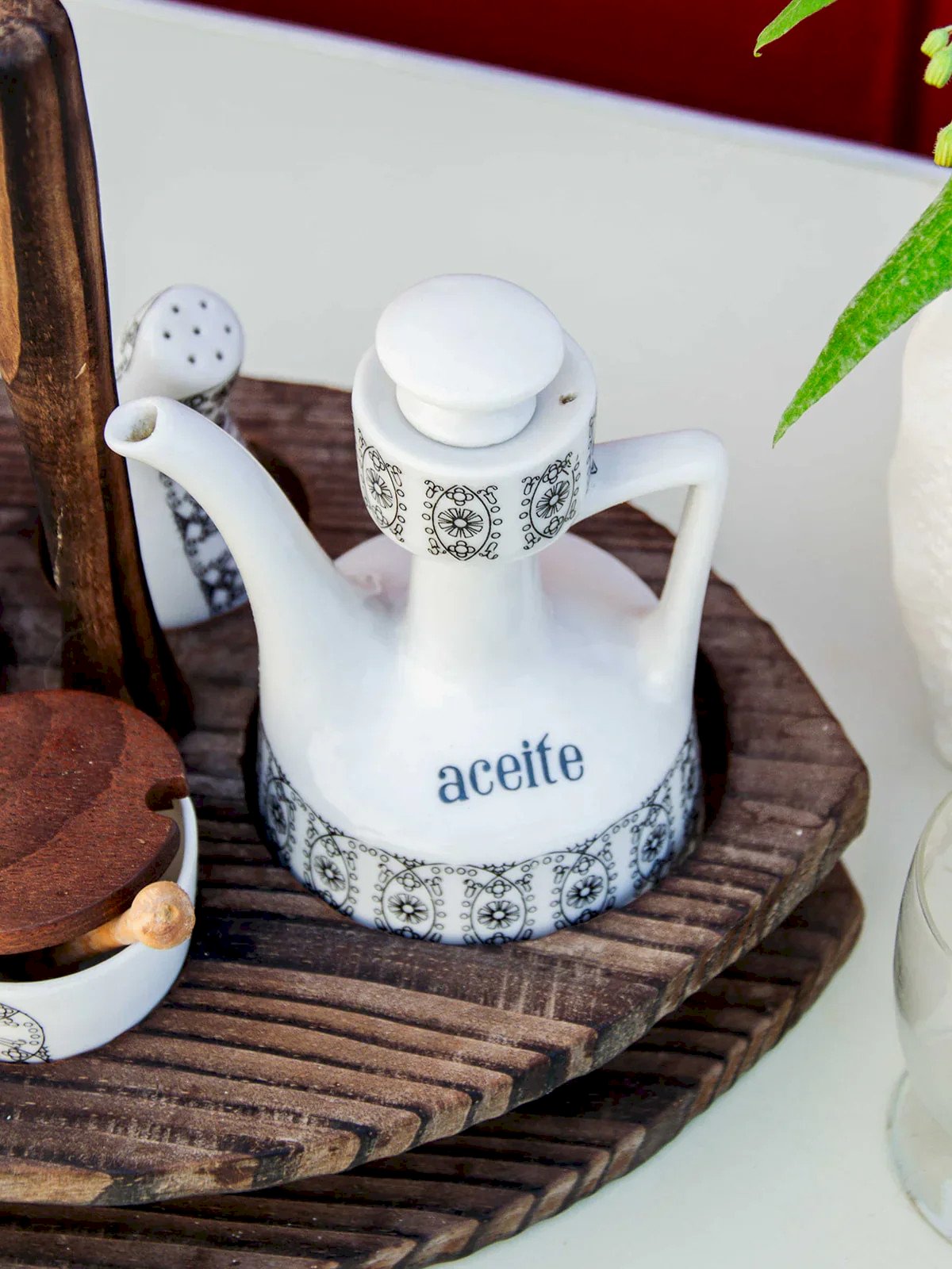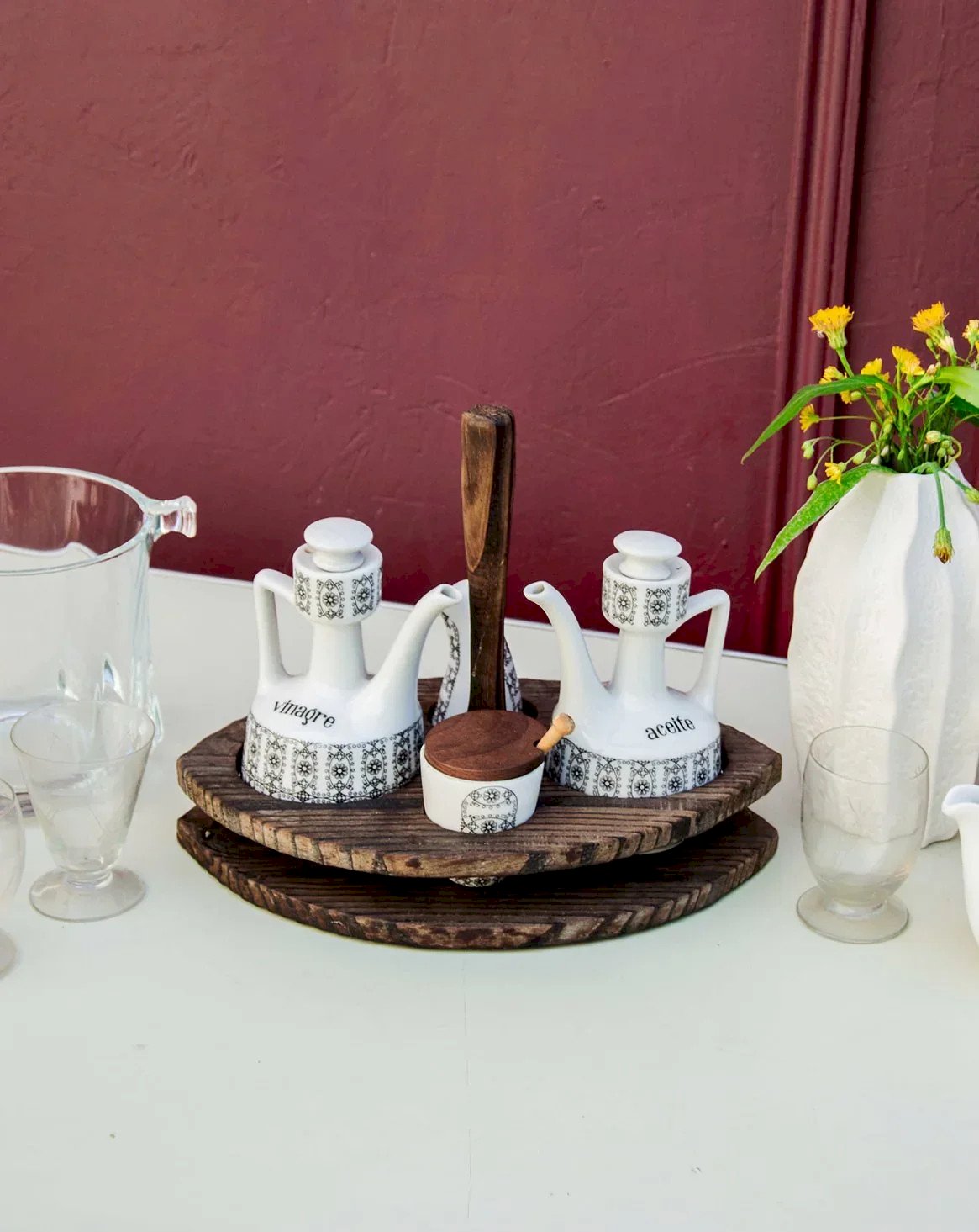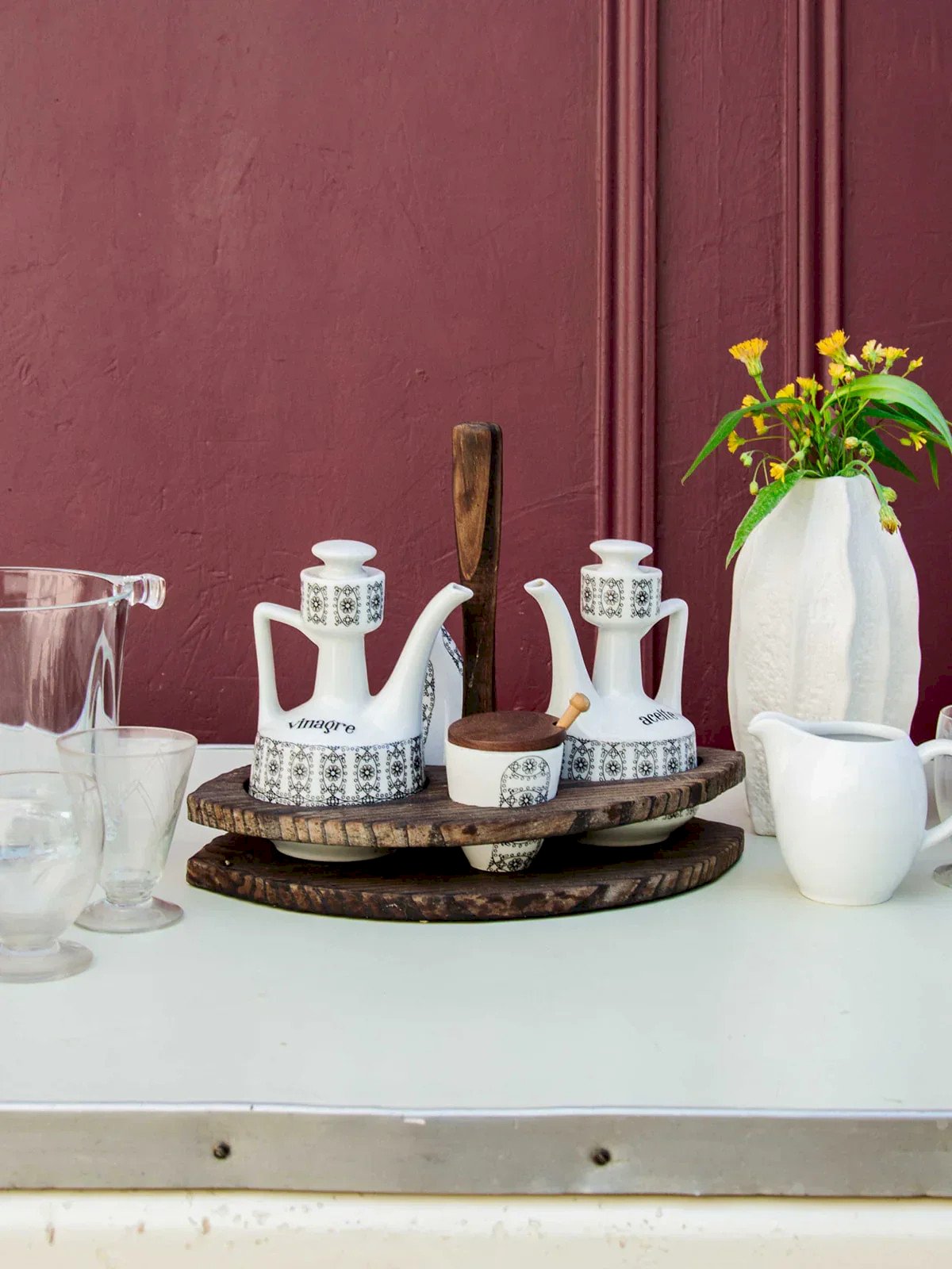 Discover this elegant condiment dish set, consisting of two ceramic pitchers, a salt shaker, and a small copper pot, all gathered on a naturally charming wooden tray. Combining functionality and aesthetics, this refined piece adds a warm touch to your table. Perfect for stylishly presenting your spices and oils, this set invites conviviality and enhances every meal with a delicate note. Length: 27 cm Width: 18 cm Height: 22 cm Condition: Used item: Item has been used. Item shows some signs of superficial wear... Used item: Item has been used. Item shows some signs of superficial wear, fully operational and functioning correctly. It may be a demonstration model or an item returned to the store after a short period of use, including possible imperfections. Brand: Debongout Type: Vintage product Material: Wood Style: Country.
