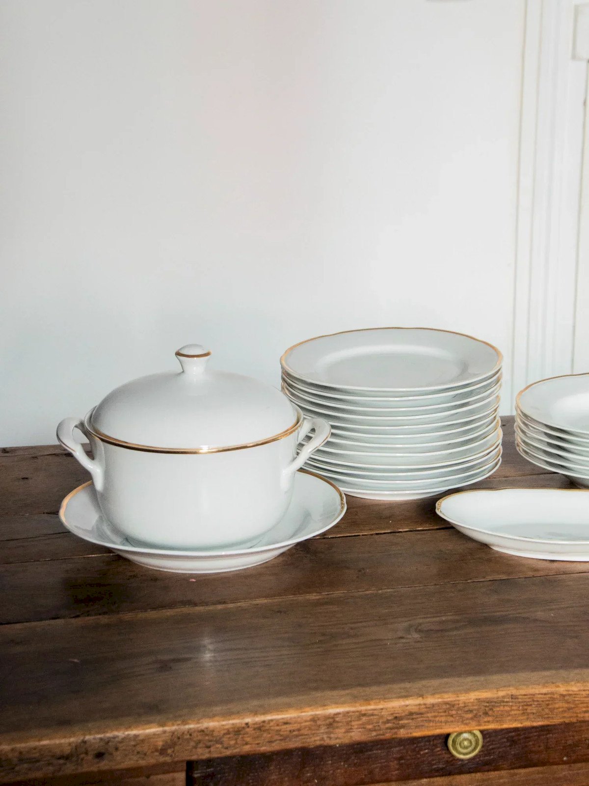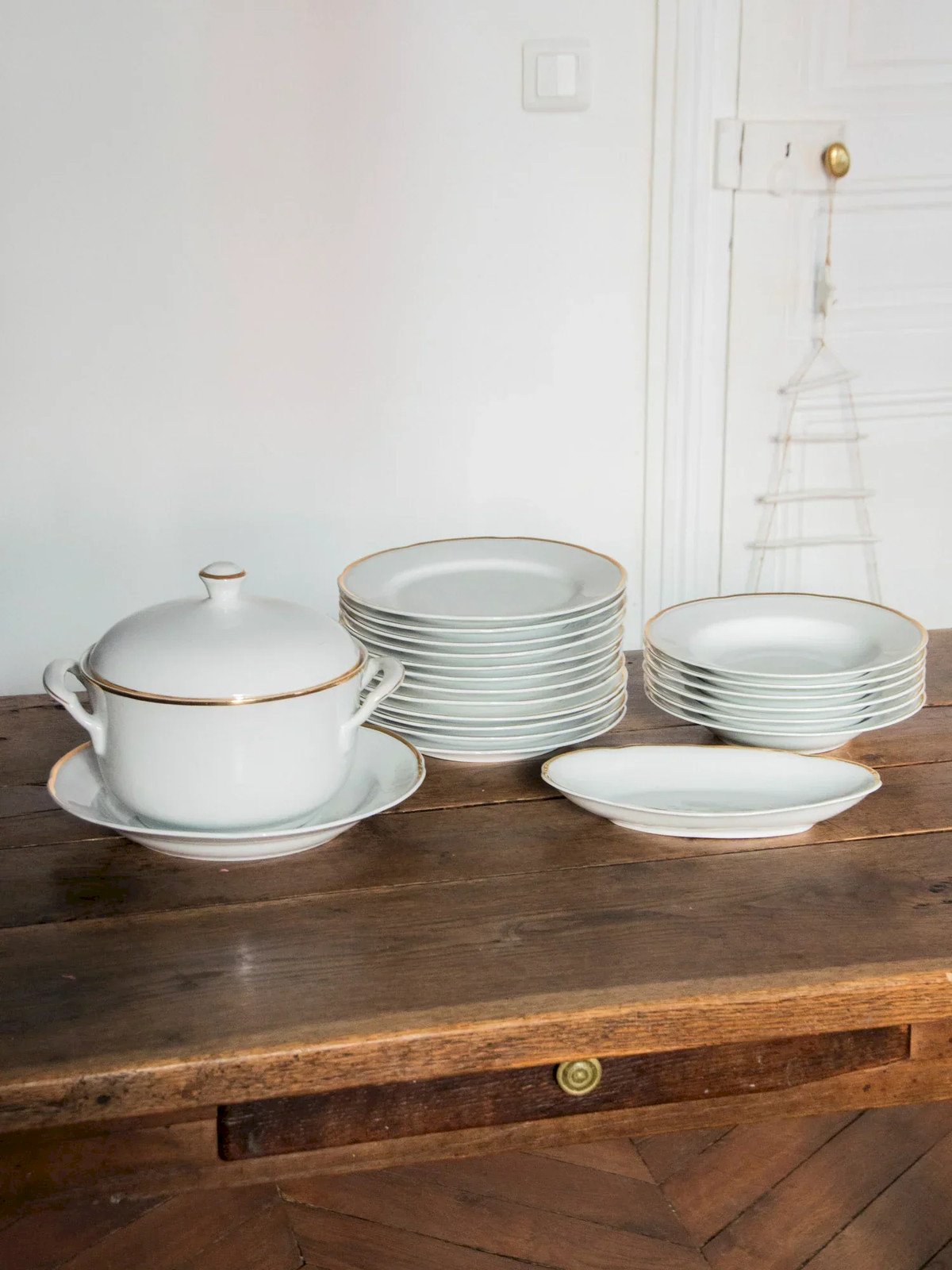 Elevate your table with this white earthenware service delicately highlighted by a golden trim, showcasing a classic and elegant style. Comprising twelve dinner plates, six deep plates, and serving pieces (large and small platters, soup tureen), it allows for a neat presentation for your meals and receptions. The finesse of the porcelain and the proportions of the pieces create a refined and warm atmosphere, perfect for formal dinners as well as casual gatherings. 12 dinner plates: Height: 3 cm Diameter: 24 cm 6 deep plates: Height: 4 cm Diameter: 23 cm 1 large serving platter: Height: 4 cm Diameter: 28 cm 1 small serving dish: Length: 25 cm Width: 15 cm Height: 4 cm 1 soup tureen: Length: 26 cm Width: 22 cm Height: 23 cm Condition: Used item. Item showing some superficial signs of wear, fully operational and functioning correctly. It may be a demonstration model or an item returned to the store after a short period of use, with possible imperfections. Brand: Debongout Type: Thrifted product Material: Earthenware Style: Country