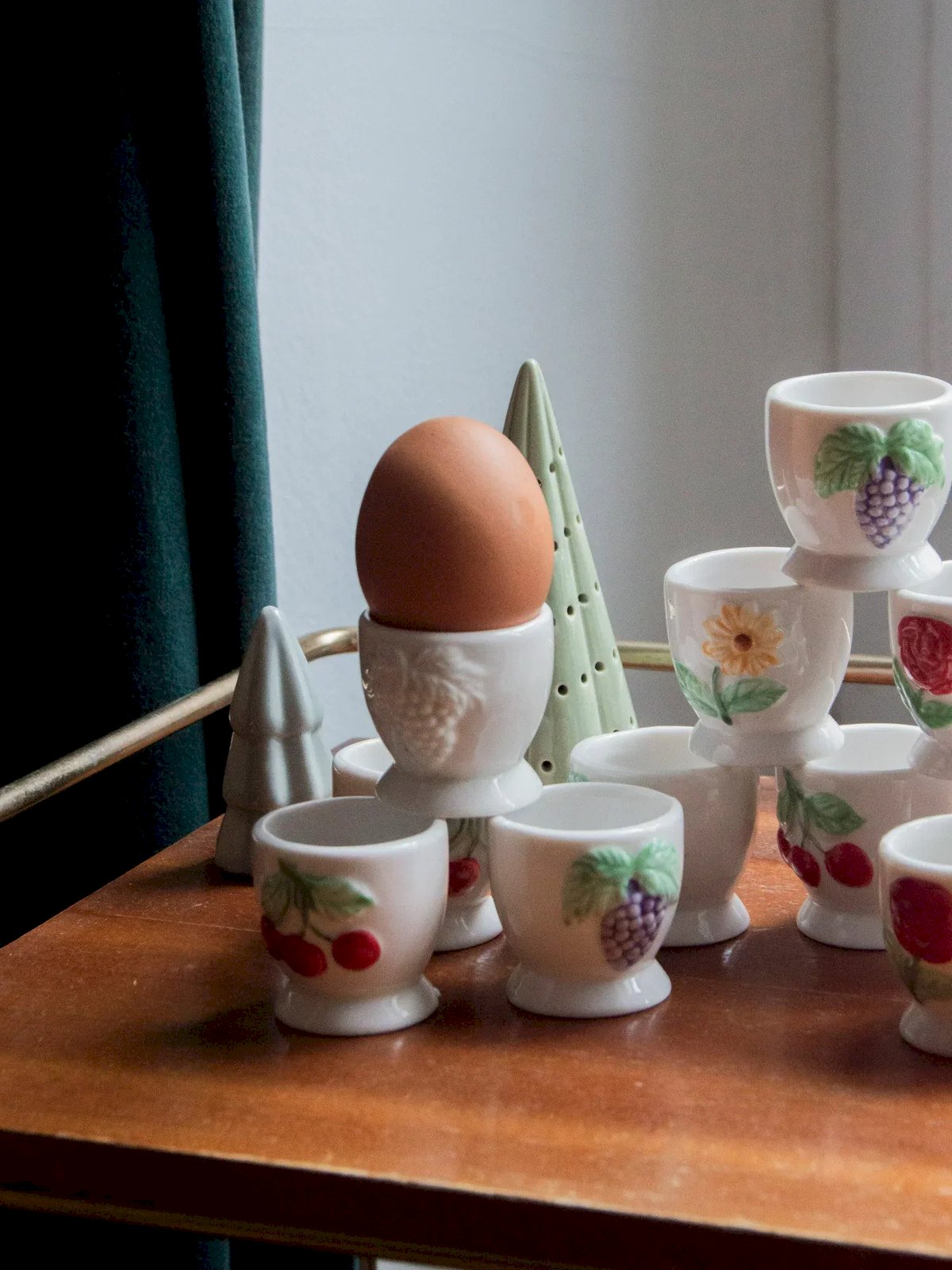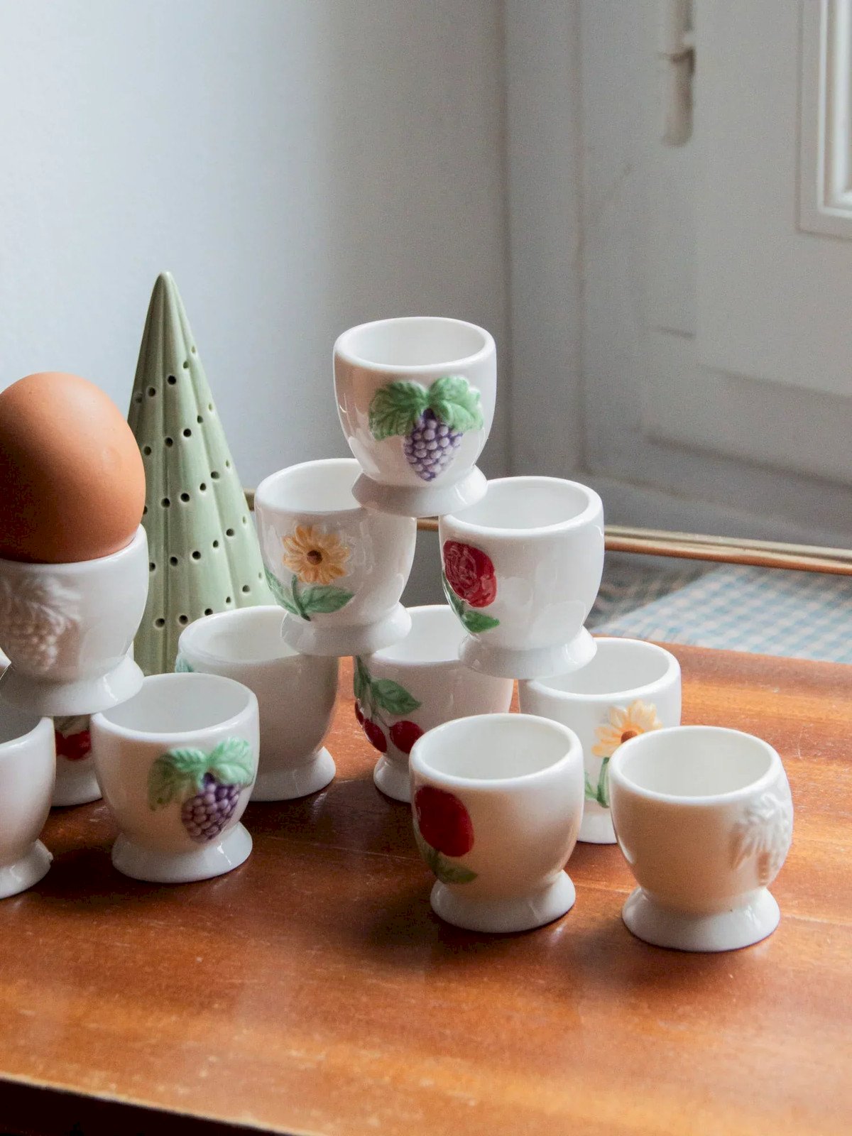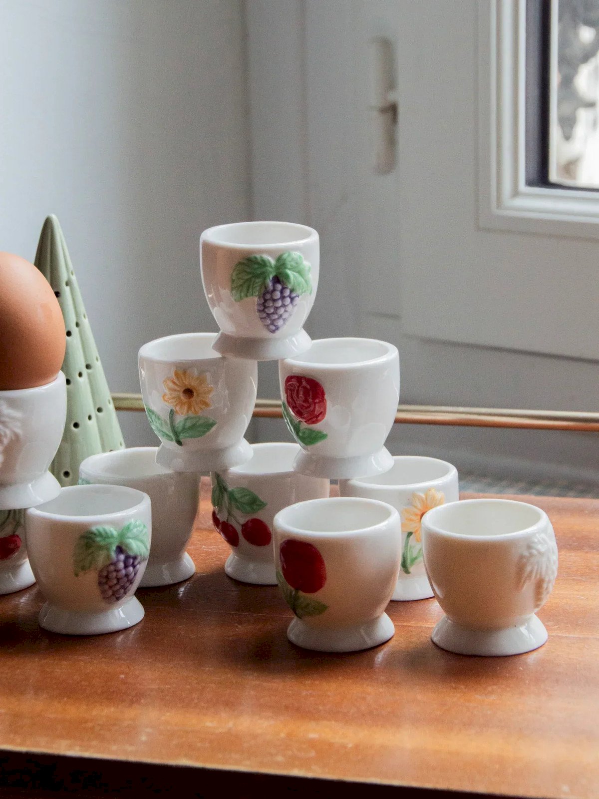 Add these white ceramic egg cups to your table for a breakfast filled with sweetness. Their compact size perfectly holds a soft-boiled egg, while the understated edge highlights colorful decorations — sunflowers, grapes, cherries, and pink — adding a rustic and gourmet touch. Easy to match with neutral tableware, they create a friendly and refined atmosphere. A charming detail to brighten your mornings. Height: 4.5 cm Diameter: 4.5 cm Condition: Used: Item has been used. Item showing some superficial signs of wear, fully functional and operating correctly. It may be a display model or an item returned to the store after a short period of use. Possible imperfections. Brand: Debongout Type: Vintage product Material: Earthenware, Enamel Style: Country
