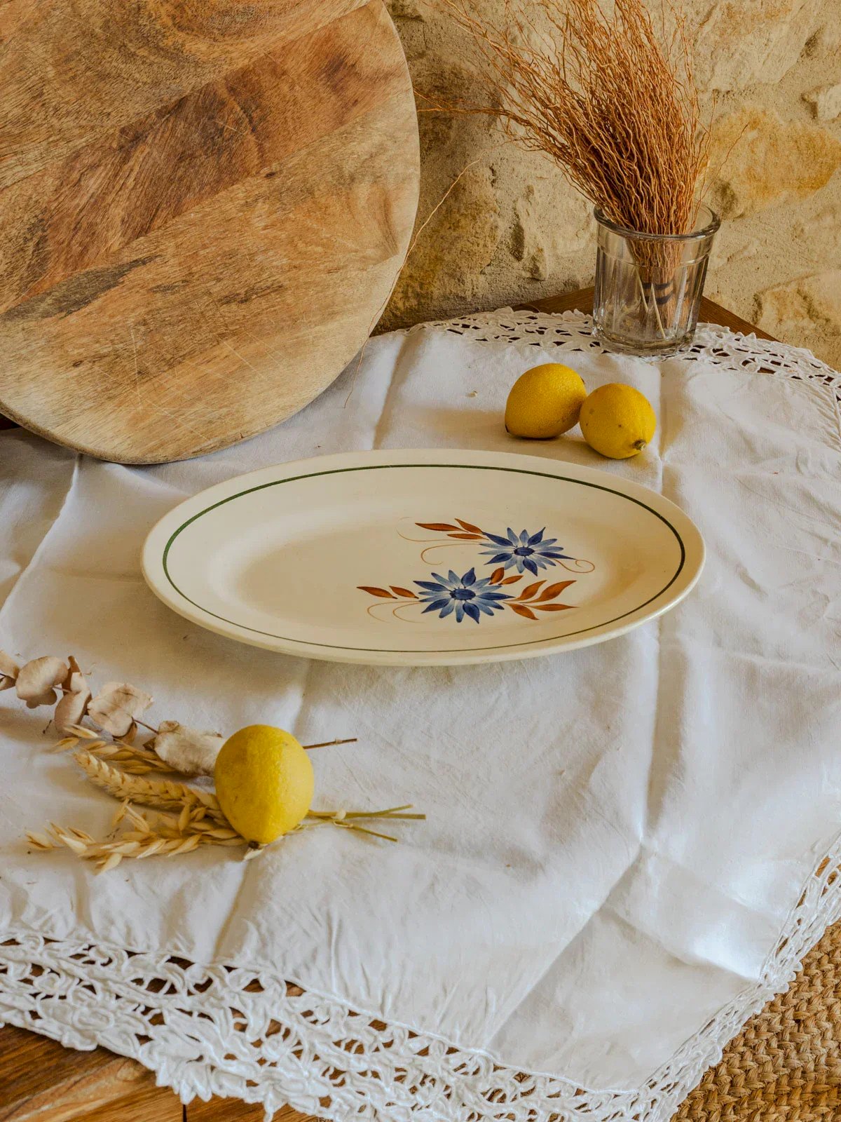 Discover this Reine HBCM France serving platter in earthenware, featuring a bright glaze and a simple design that invites a table full of character. Its elongated and shallow shape offers a beautiful presentation tray, ideal for tarts, roasted fish, or assortments of antipasti, and fits perfectly into both a friendly dinner and an elegant buffet. The material reflects artisanal craftsmanship and adds a discreet elegance to your arrangements. Length: 35 cm Width: 25 cm Height: 2.5 cm Condition: Second-hand: Item has been used. Item shows some superficial signs of wear... Second-hand: Item has been used. Item shows some superficial signs of wear, fully operational and functioning correctly. It may be a demonstration model or an item returned to the store after a short period of use, including any possible imperfections. Brand: Debongout Type: Thrifted Product Material: Earthenware Style: Country