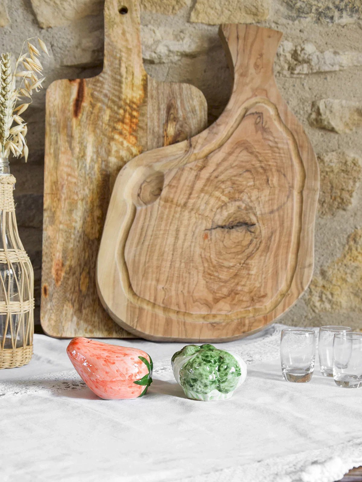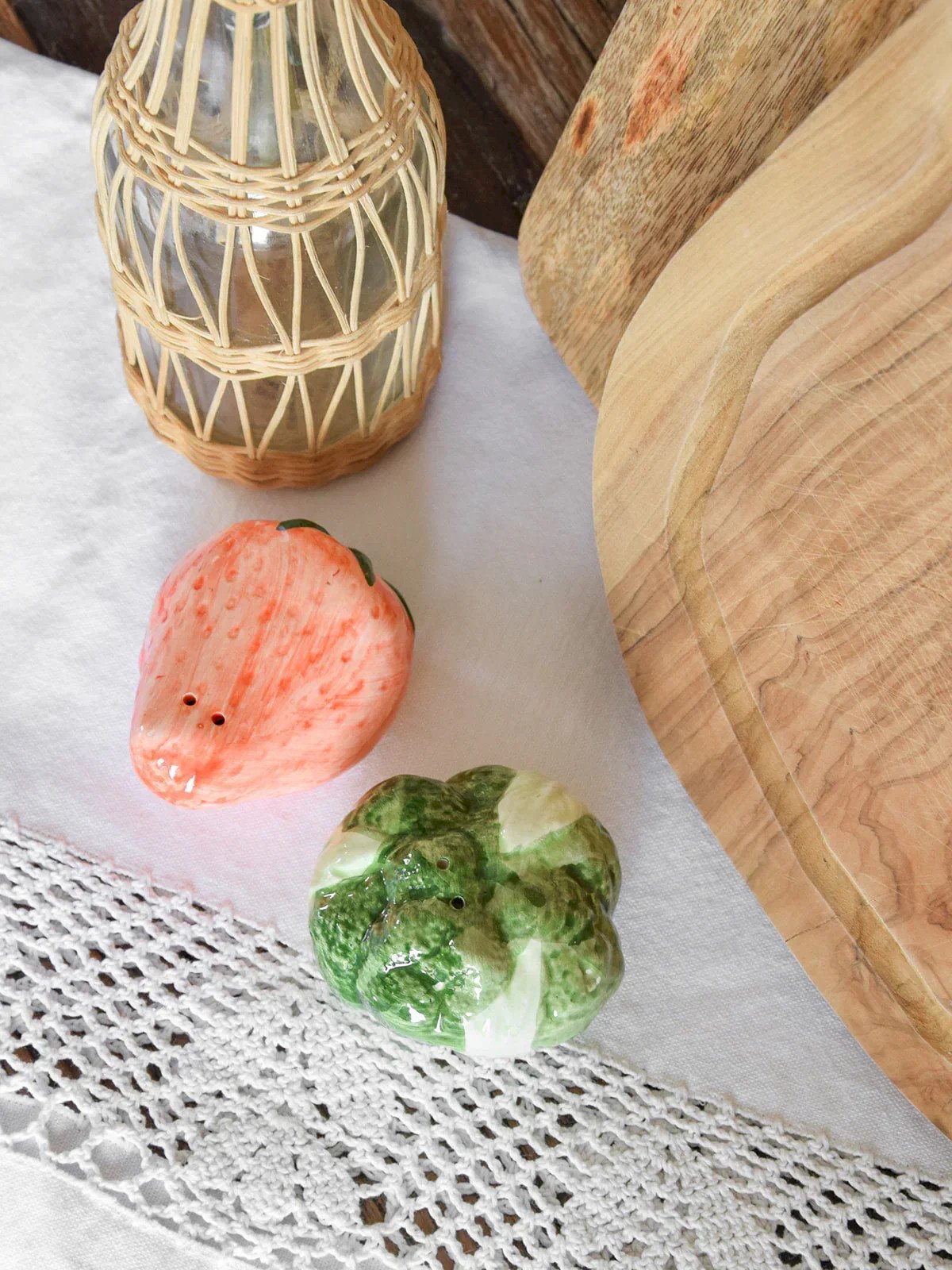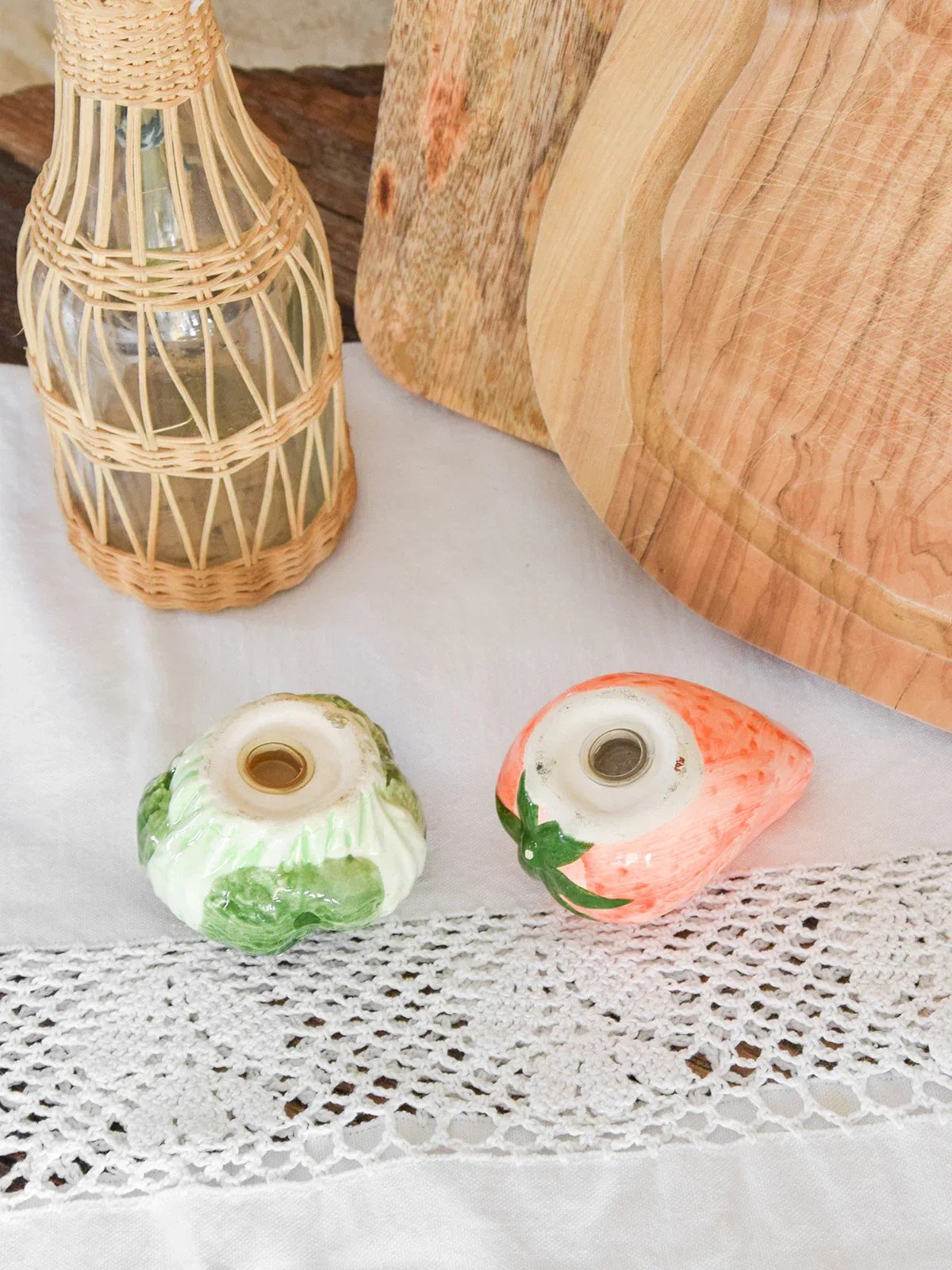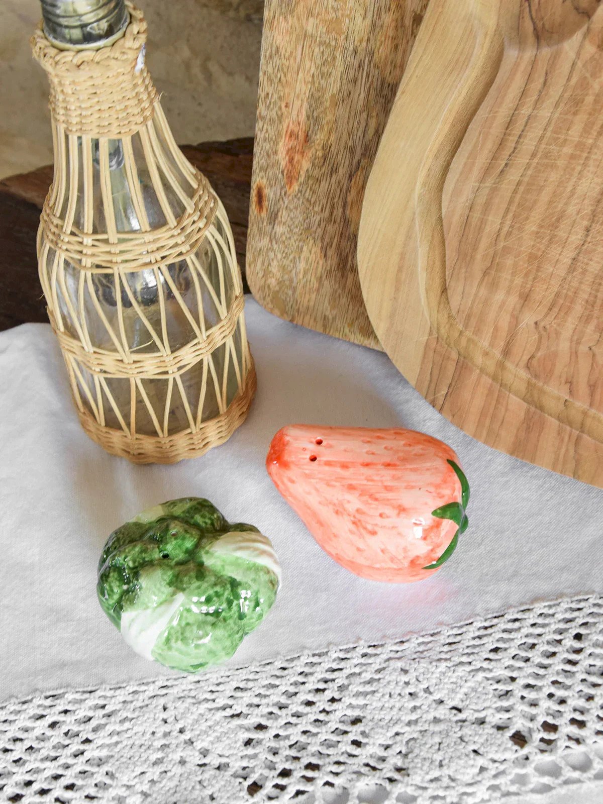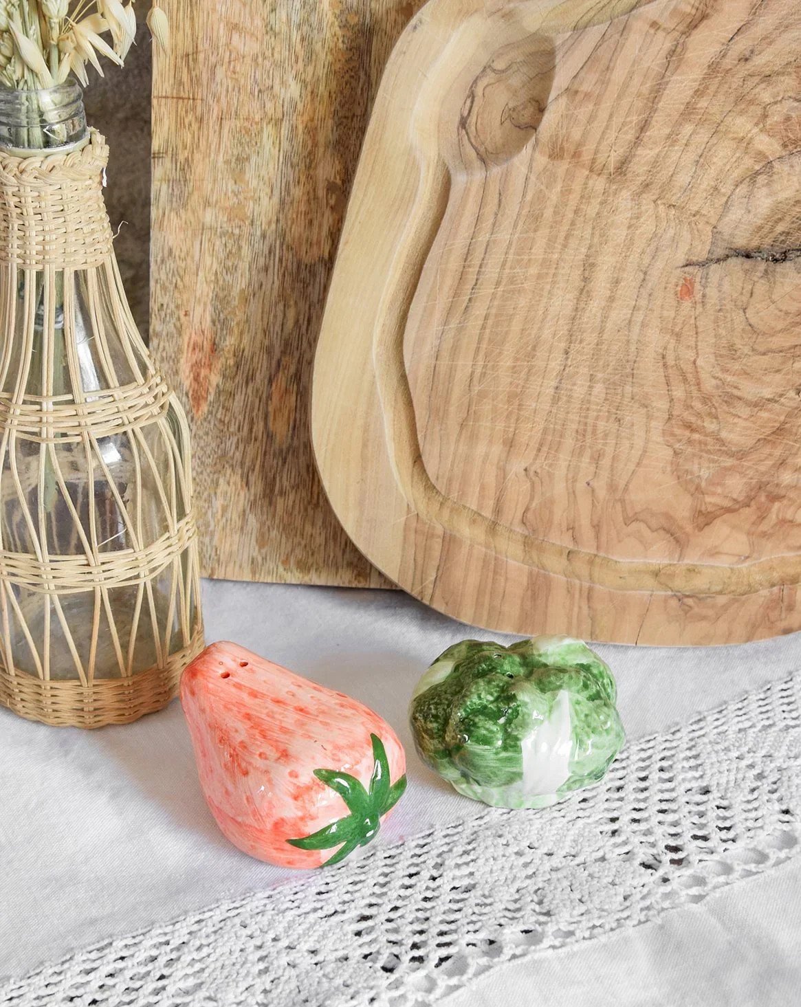 Add a playful touch to your table with this strawberry and cabbage salt & pepper set. The strawberry will bring a colorful and cheerful note, while the cabbage will add a touch of delicate elegance. Carefully crafted, these accessories combine functionality and design, making every meal a delightful and aesthetic moment. Perfect for brightening up your meals with family or friends! Web exclusive, the meeting will take place at your home! Strawberry Length: 8 cm Height: 4.5 cm Cabbage Height: 4.5 cm Diameter: 7 cm Condition: Used: Item has been used. Item shows some superficial signs of wear... Used: Item has been used. Item shows some superficial signs of wear, fully operational and functioning correctly. It may be a demonstration model or an item returned to the store after a short period of use. any imperfections. Brand: Debongout Type: Thrifted Product Material: Earthenware Style: Country.