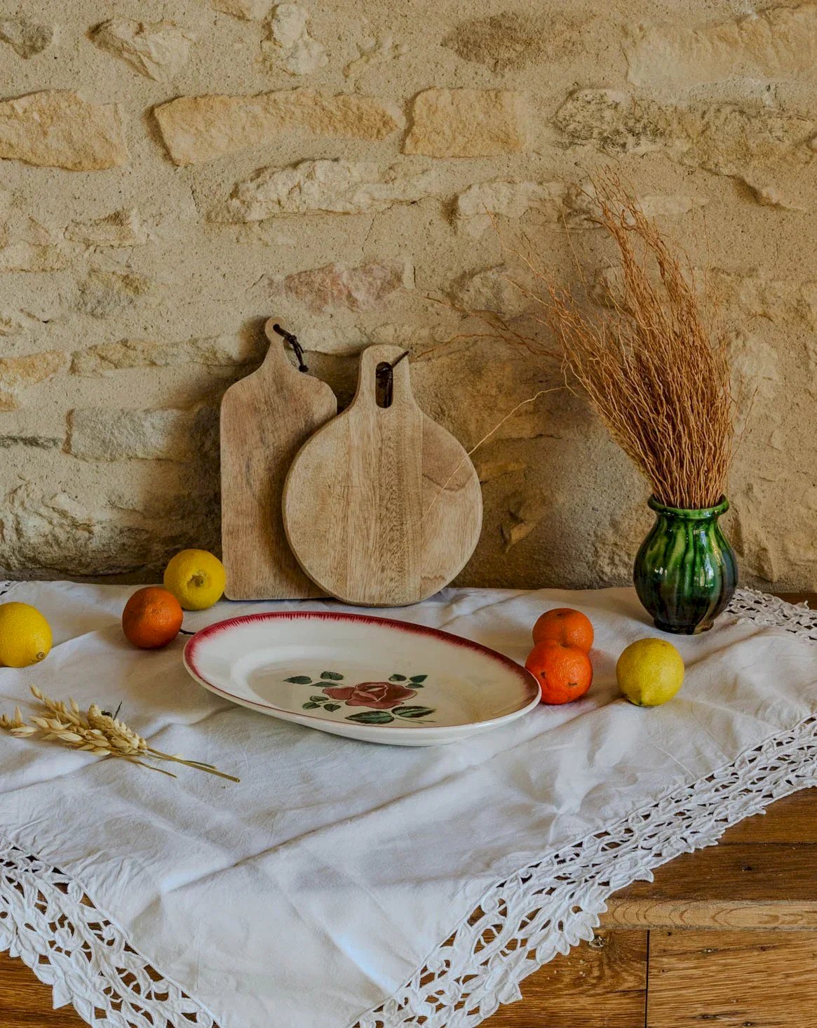 Bring this oval Digoin Sarreguemines ceramic dish, Bagatelle model, delicately highlighted with a pink border and adorned with a floral design. Its generous shape allows for serving tarts and sharing dishes while adding a retro and refined touch to the table. The floral pattern and soft glaze create a spring-like atmosphere, perfect for a cozy brunch or a country dinner. Versatile and decorative, it easily fits into contemporary tables as well as vintage setups. Length: 31 cm Width: 22 cm Height: 3 cm Condition: Used item showing some superficial wear marks, fully operational and functioning correctly. It may be a demonstration model or an item returned to the store after a short period of use. Any potential imperfections. Brand: Debongout Type: Thrifted product Material: Ceramics Style: Country