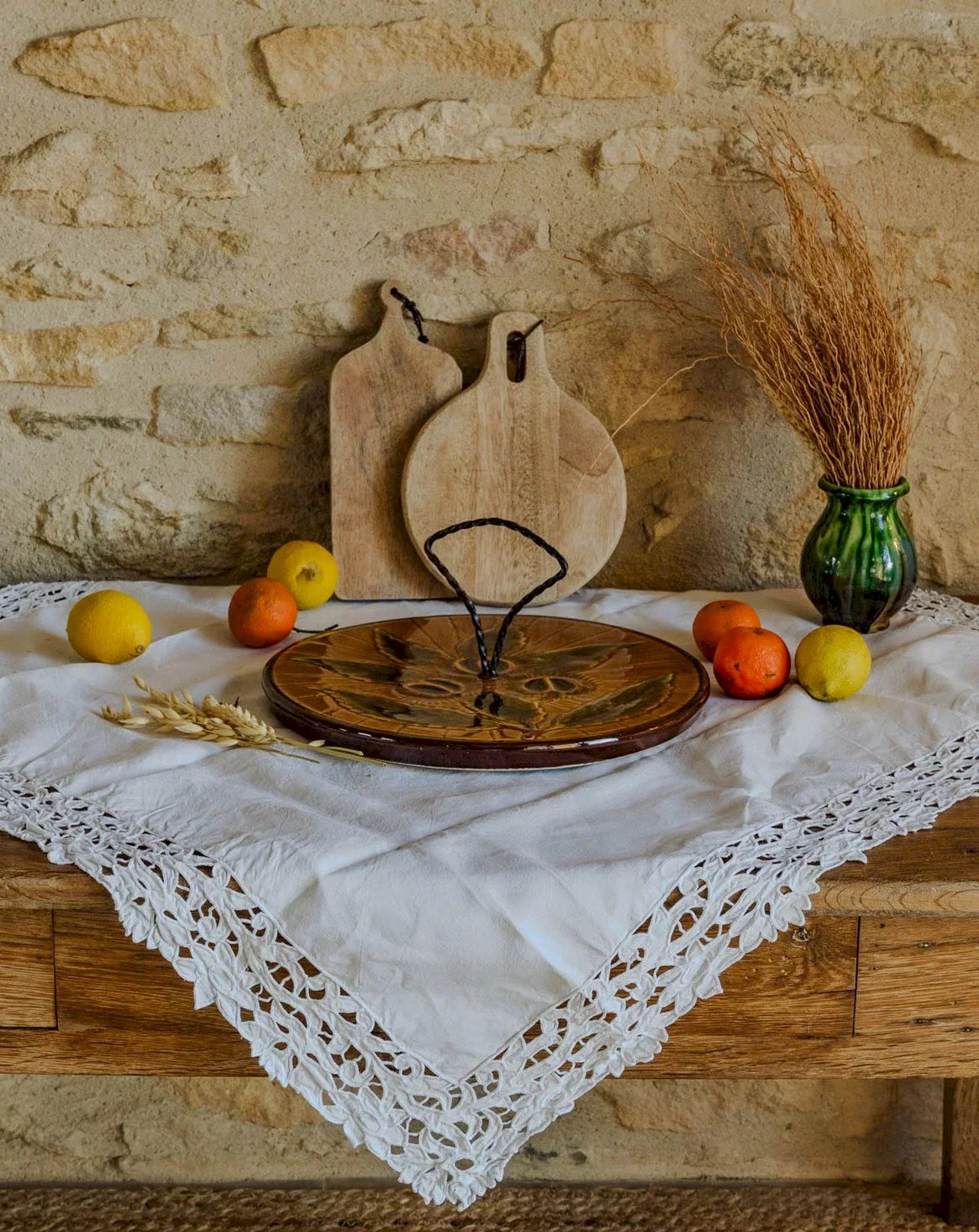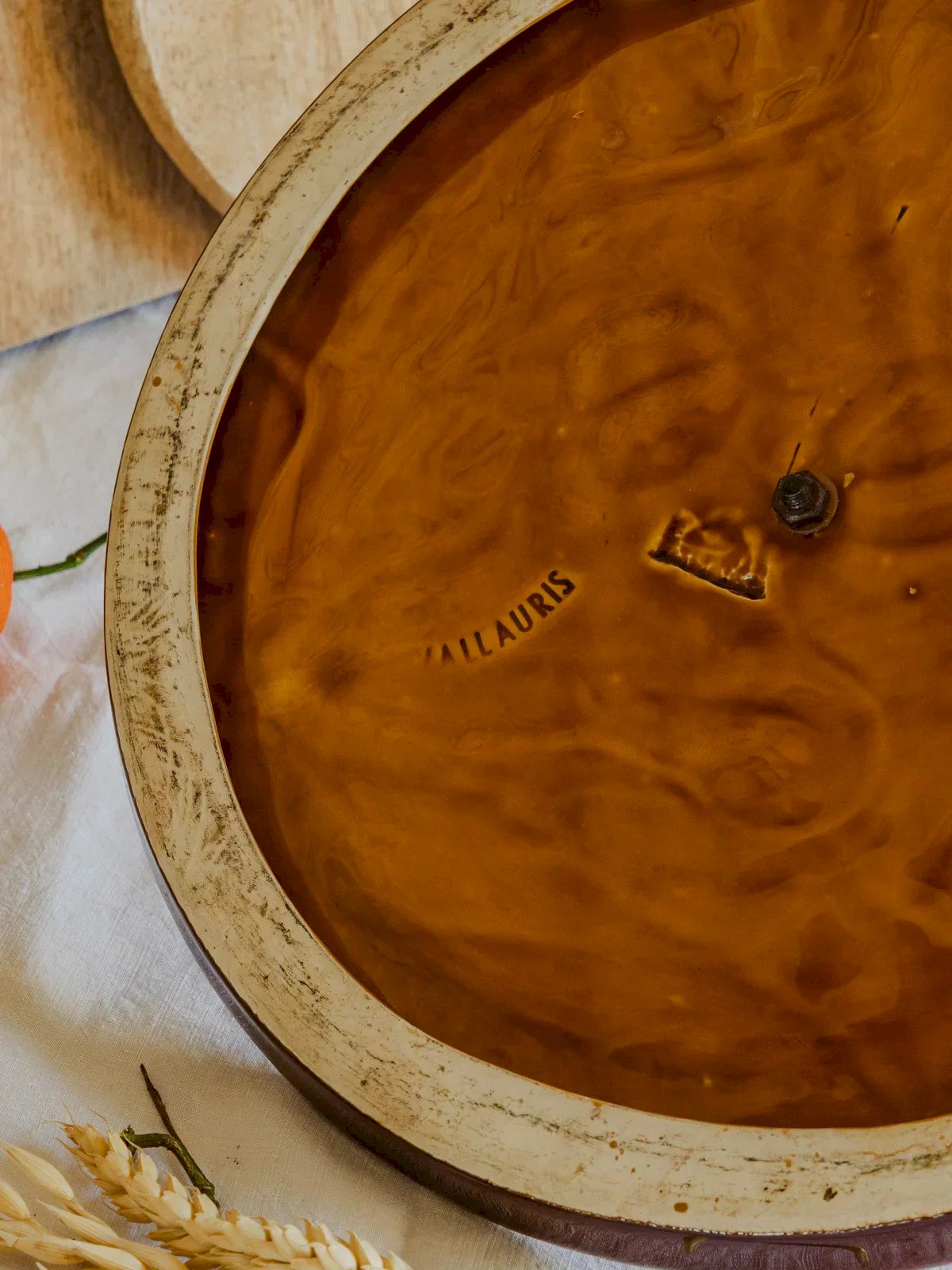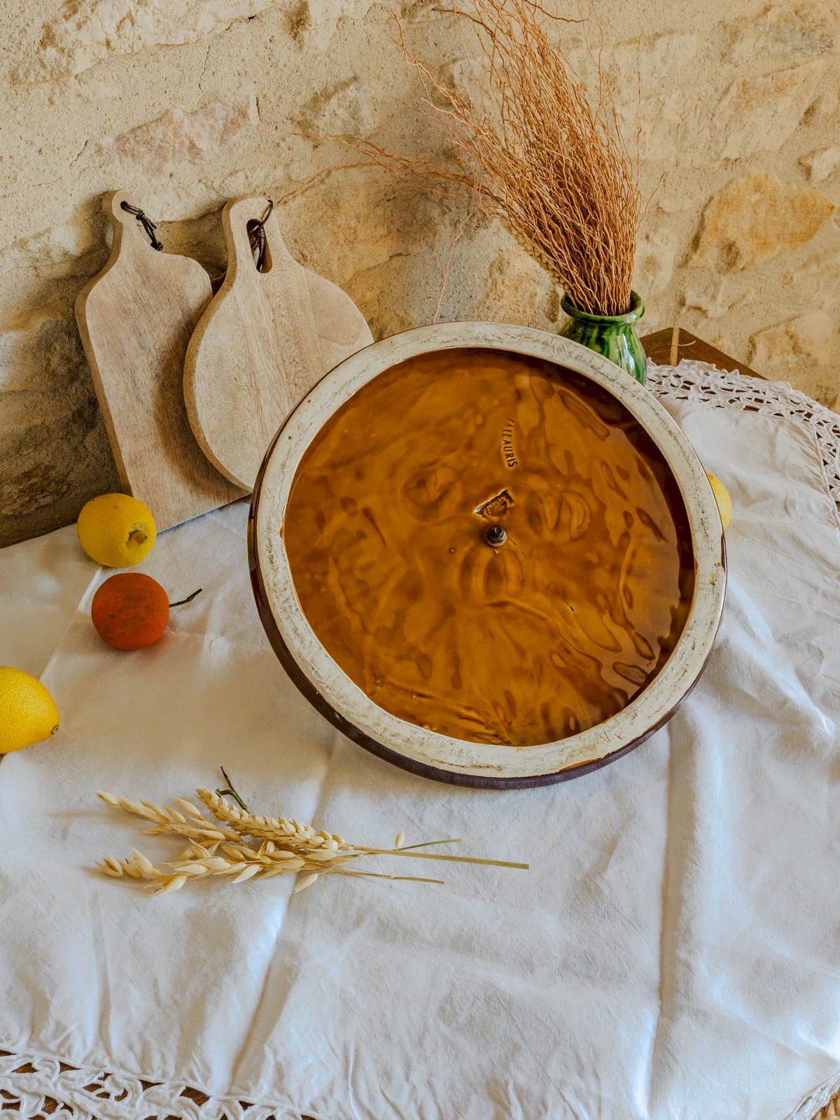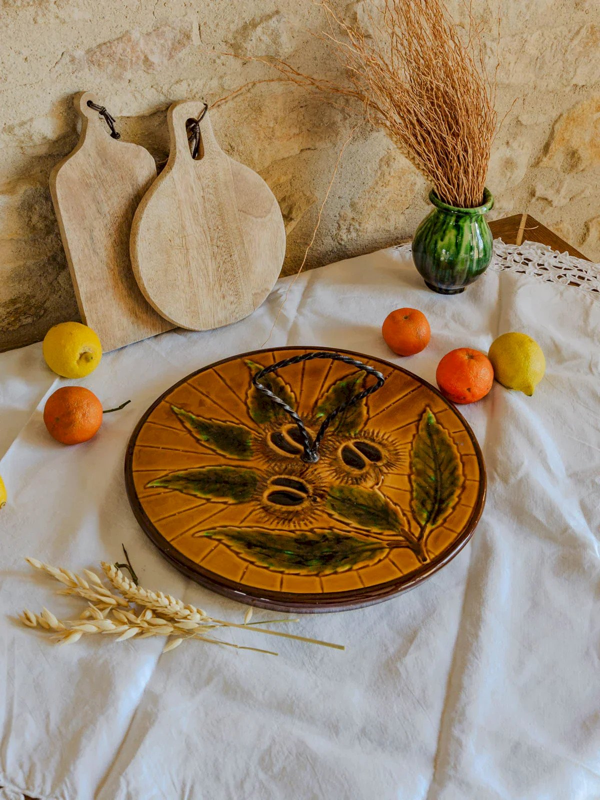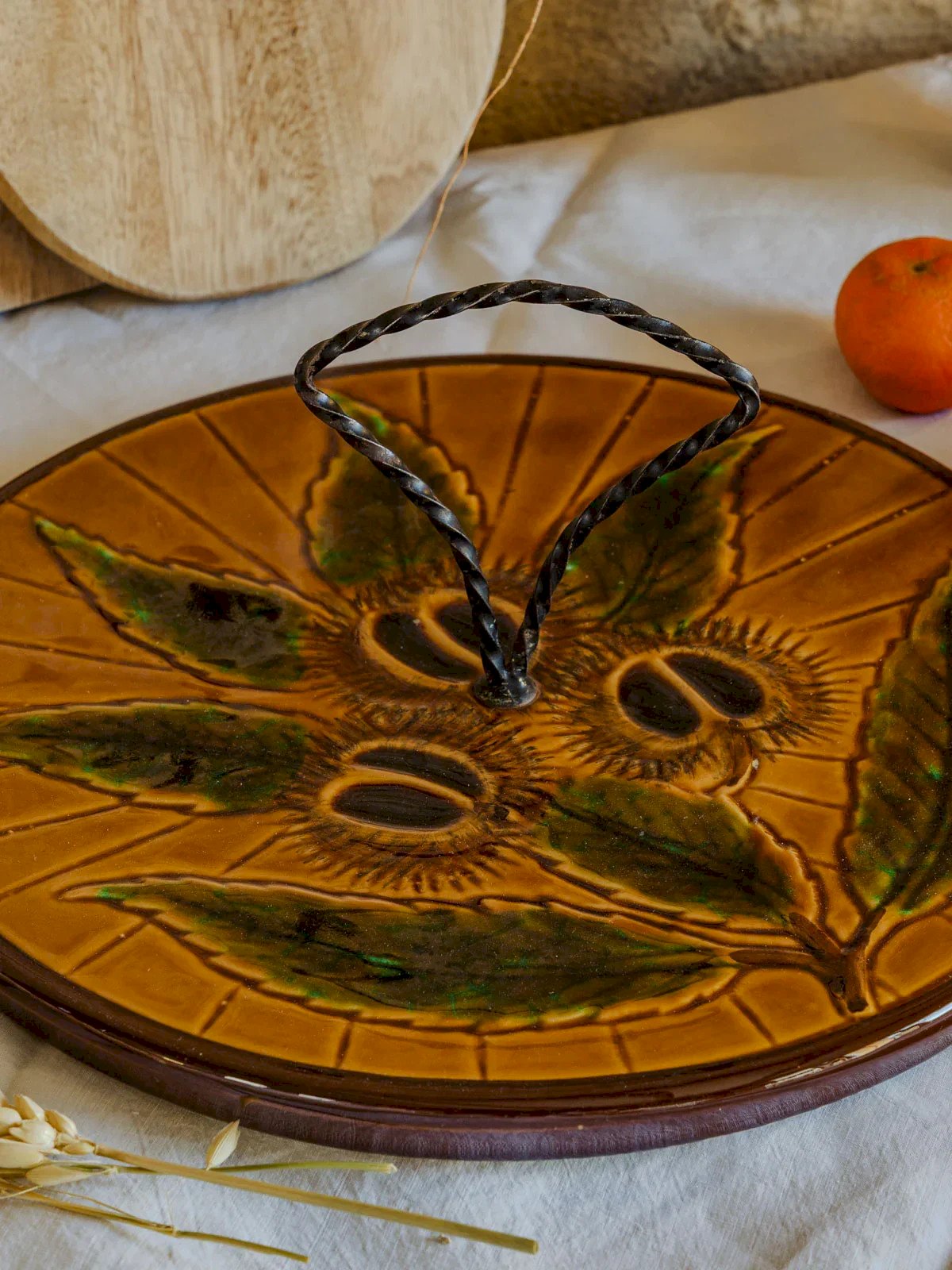 Enhance your sharing moments with this cheese platter signed Vallauris, combining the softness of handmade ceramics with the raw elegance of a wrought-iron handle. Its generous proportion allows you to present a selection of cheeses and accompaniments for a friendly aperitif, perfect for creating an intimate and refined atmosphere in both contemporary and countryside interiors. Height: 12 cm Diameter: 30 cm Condition: Used: Item has been used. Item shows some superficial signs of wear... Used: Item has been used. Item shows some superficial signs of wear, fully operational and functioning properly. It may be a demonstration model or an item returned to the store after a short period of use. possible imperfections. Brand: Debongout Type: Vintage product Material: Faience, Iron Style: Country