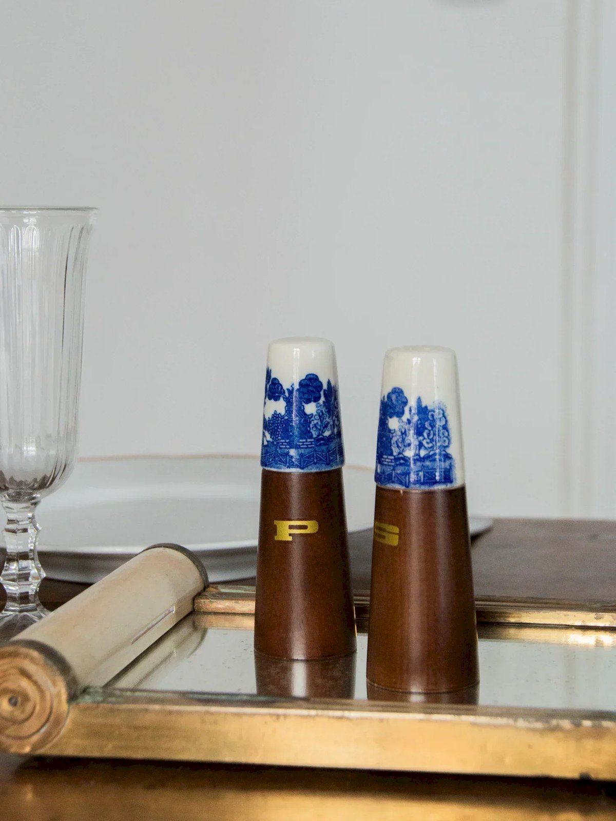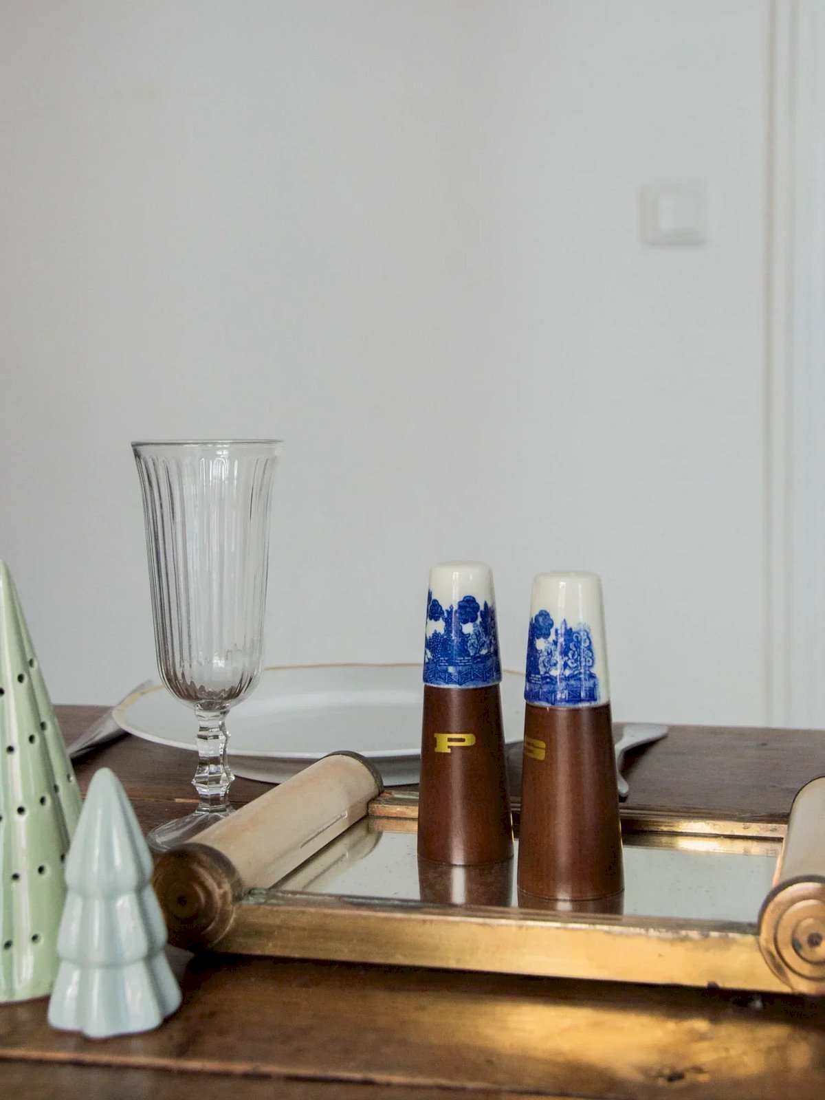 Adopt this salt and pepper set made of earthenware and wood, featuring tall and slender silhouettes accented with handwritten letters that tell a story of craftsmanship. The bright earthenware contrasts with the warmth of the wood for a table service that is both understated and poetic; their size allows for a good grip and is suitable for everyday meals as well as for guest tables. Ideal for a friendly and refined atmosphere, it adds a touch of written authenticity to your kitchen. Height: 10 cm Diameter: 3 cm Condition: Used: Item has been used. Item shows some signs of superficial wear... Used: Item has been used. Item shows some signs of superficial wear, fully operational and functioning correctly. It may be a demonstration model or an item returned to the store after a short period of use. Any possible imperfections. Brand: Debongout Type: Vintage product Material: Earthenware, Wood Style: Country