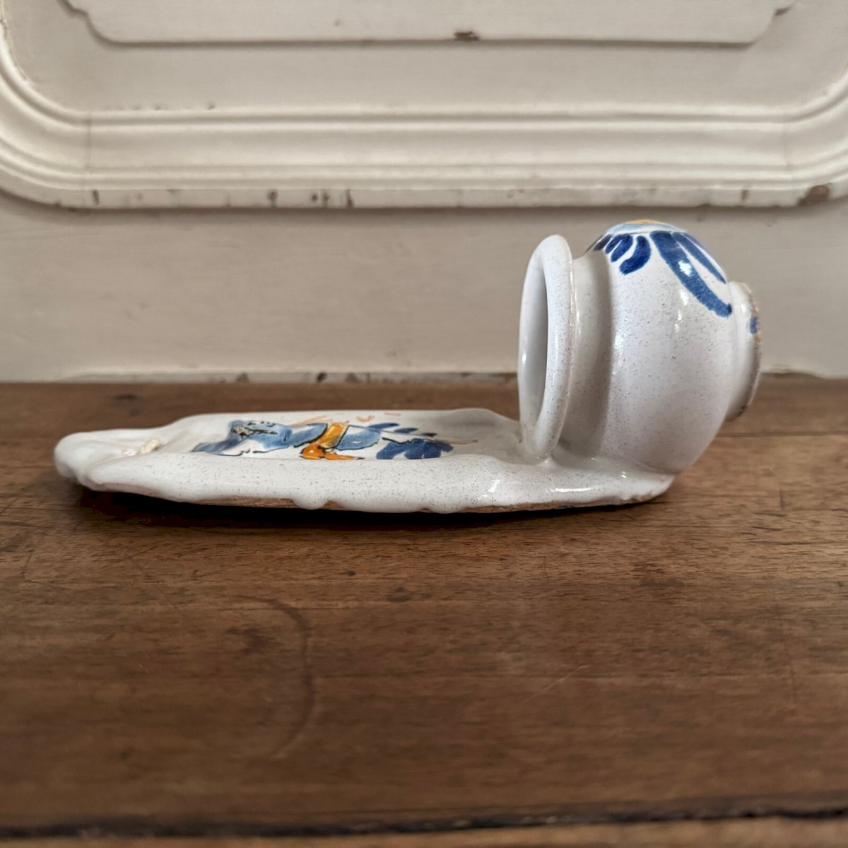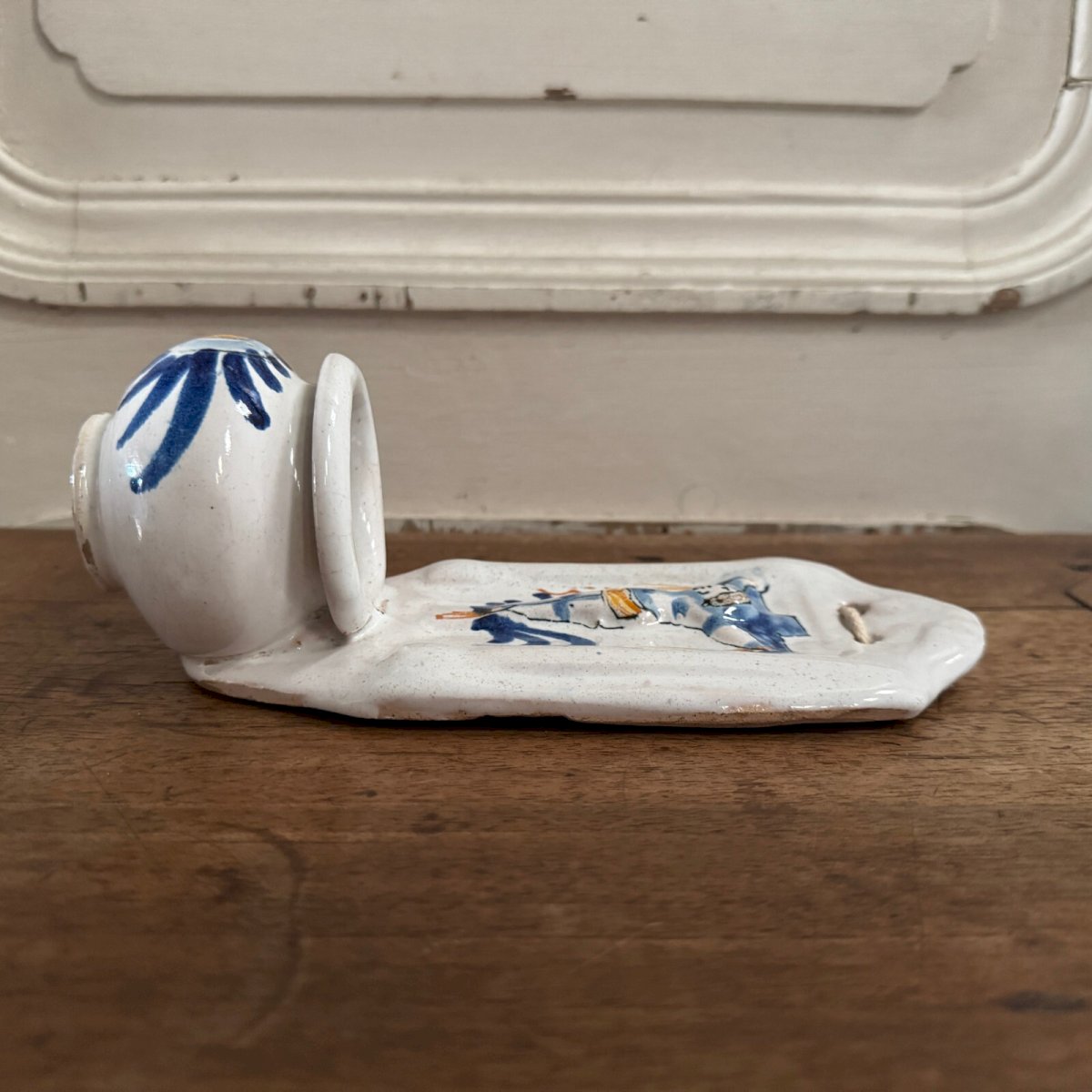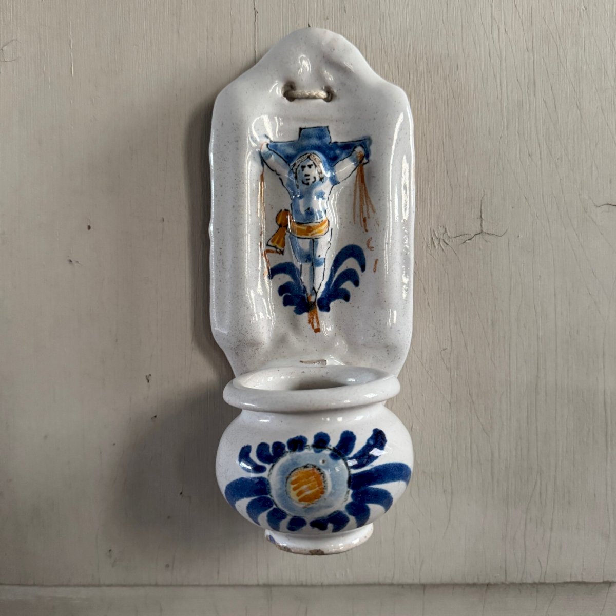 Nevers faience holy water font 18th century round sculpture M3610 This holy water font with a white background features a Christ on the cross in high relief. The lower part with a speckled decoration strongly suggests Nevers. The whole piece is from the 18th century. We note some typical wear. Our photos allow you to appreciate the quality of the object. For the condition, please refer to the detailed photos. Feel free to zoom in. The photos are an integral part of the description. Dimensions: Height: 21 cm Width: 9 cm Diameter: 7 cm I remain at your disposal for any questions. Type: Showcase object, Decorative Origin: France Subtype: Holy water font Height: 21 cm Material: Faience Length: cm Width: 9 cm