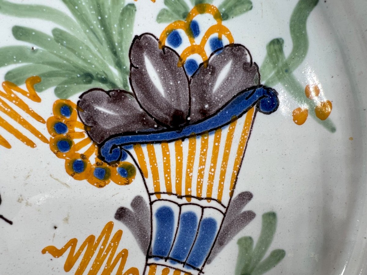 Old faience plate from Auxerre or Nevers decorated with birds and cornucopia, mid-19th century, diameter: 22cm, height: 3.5cm, country of origin: France.