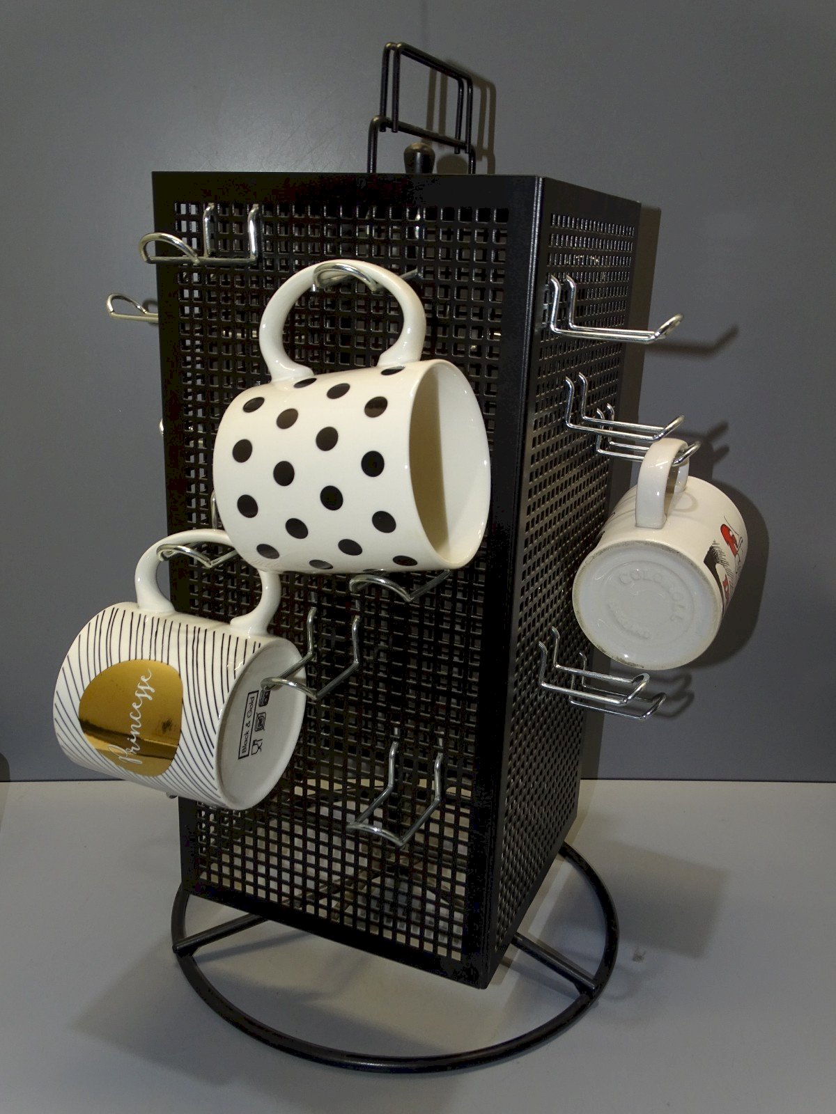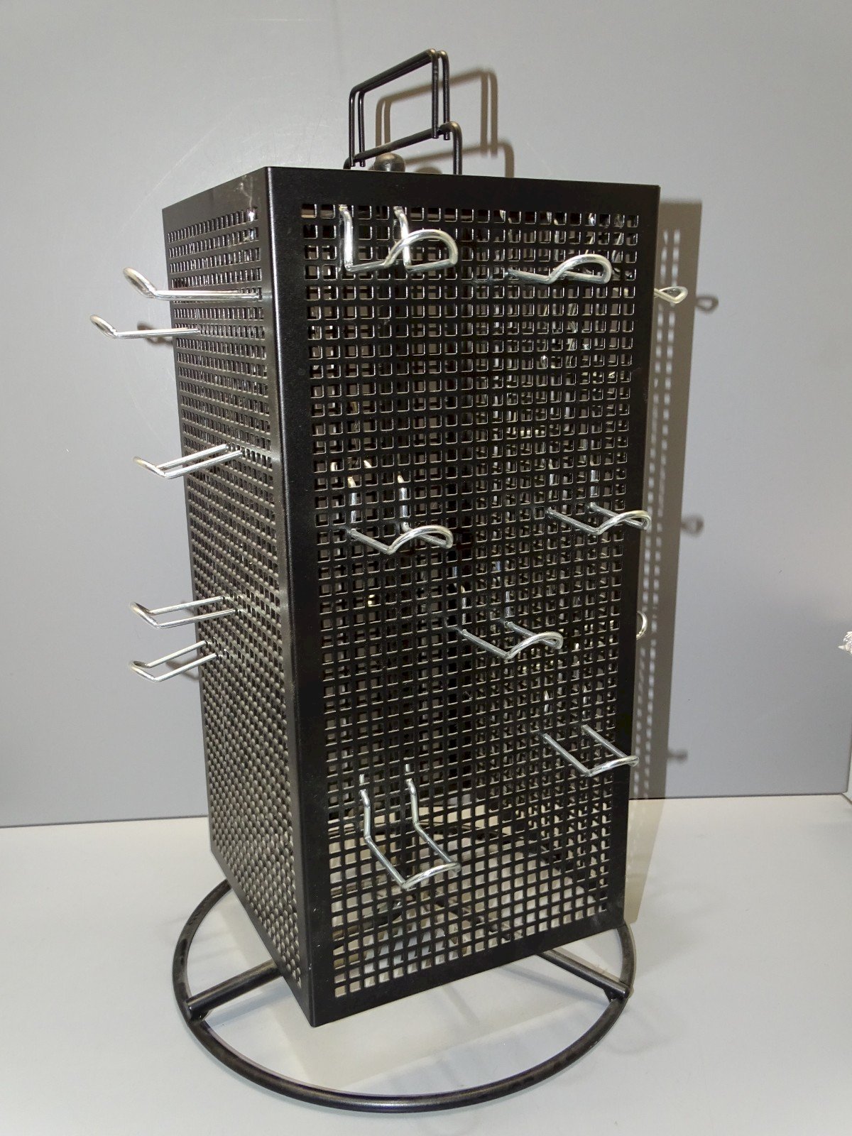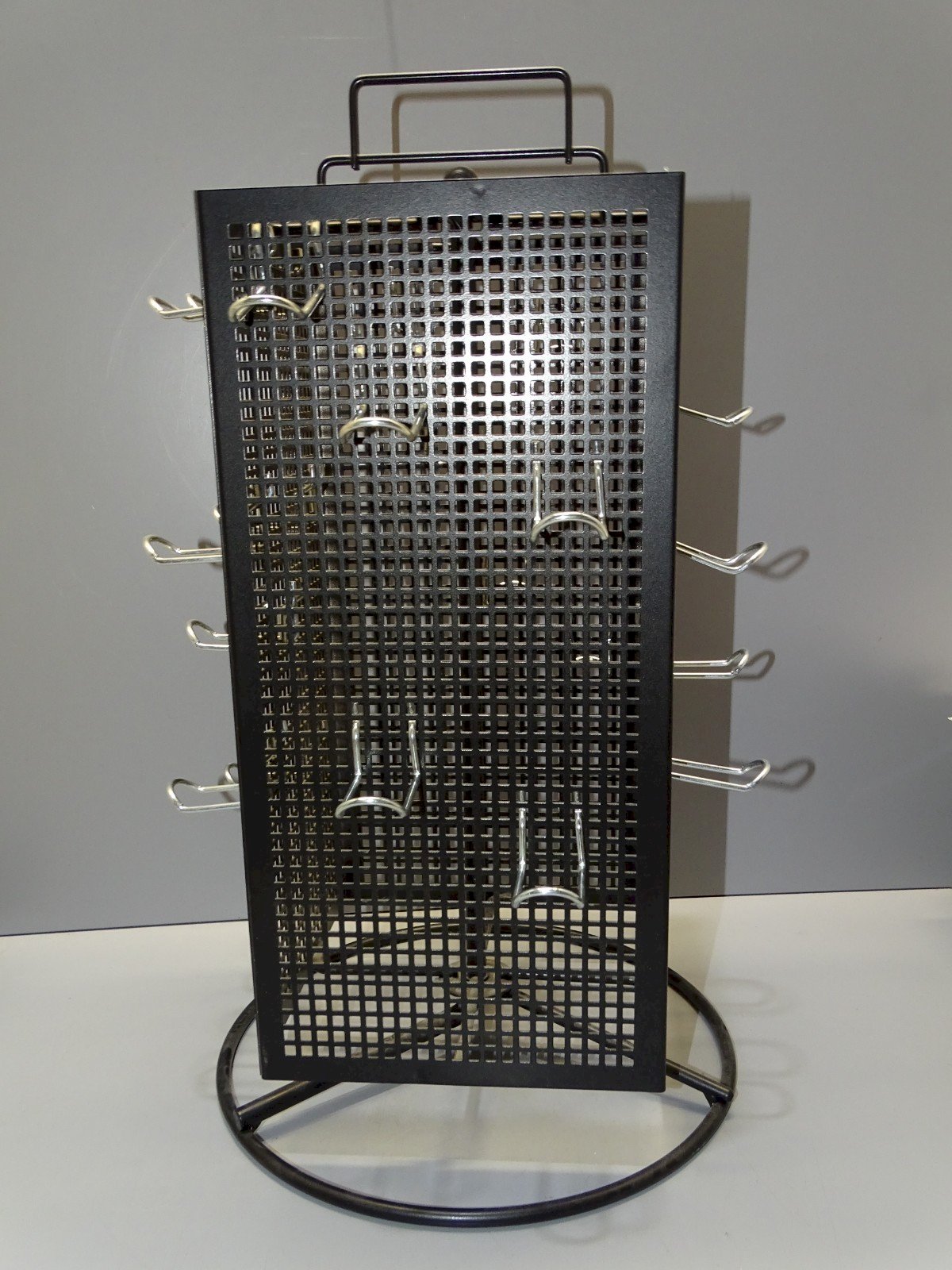 Nice black perforated metal rotating display stand with 21 hooks for hanging various small items such as mugs or others (see photos) - treasure finds, attic release - in very good usable condition - Ref.42141025/110 - 18.1 x 18 cm Height 47.2 cm - Base diameter 27 cm - Weight 2.6 kg - To contact me, my email address: SHIPPING via Mondial Relay OR Colissimo available upon request GUARANTEED packaging very protective THANK YOU for LOOKING AT ALL the PHOTOS as THEY ARE AN INTEGRAL PART of the DESCRIPTION and HELP SEE the ITEM at its BEST - Material: Metal