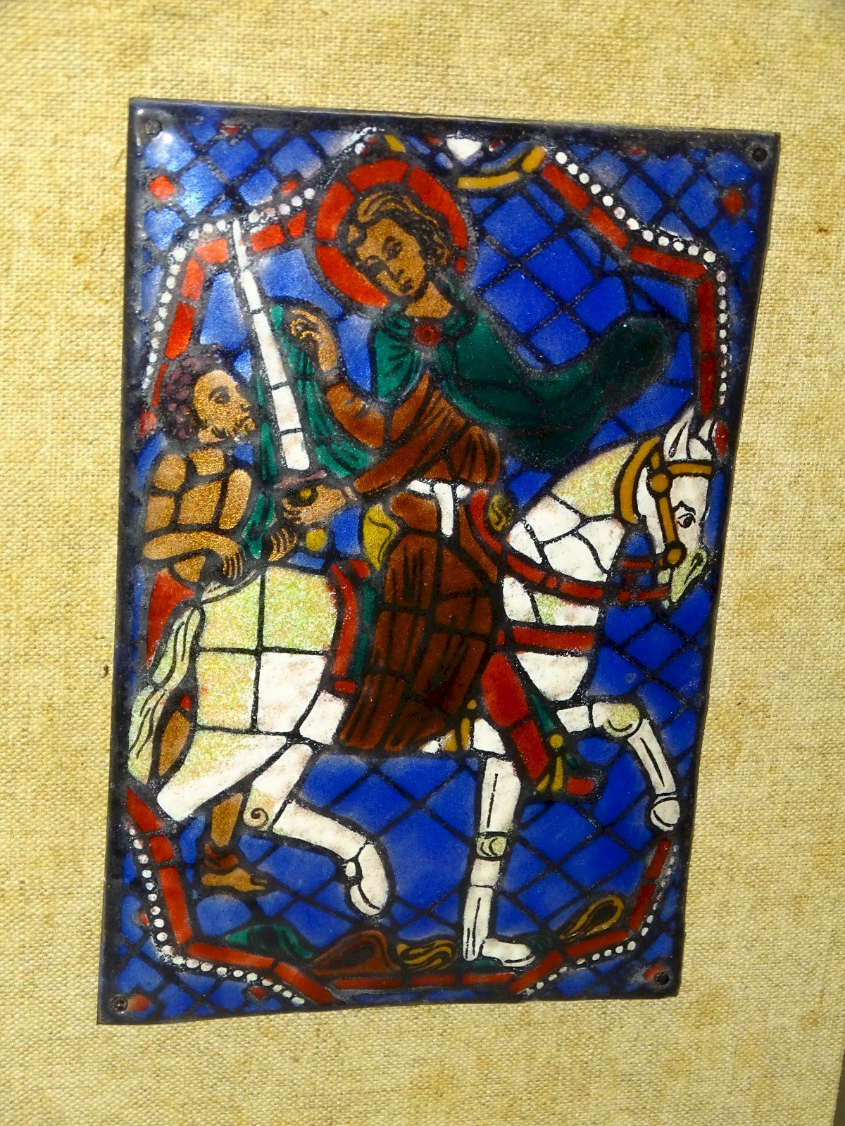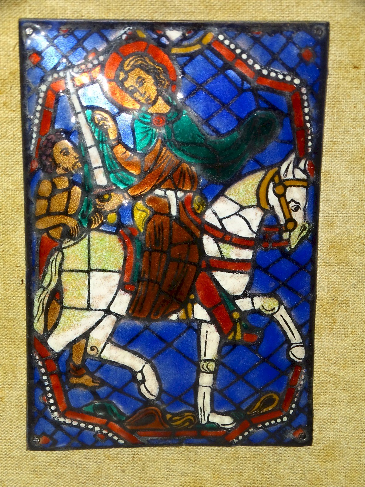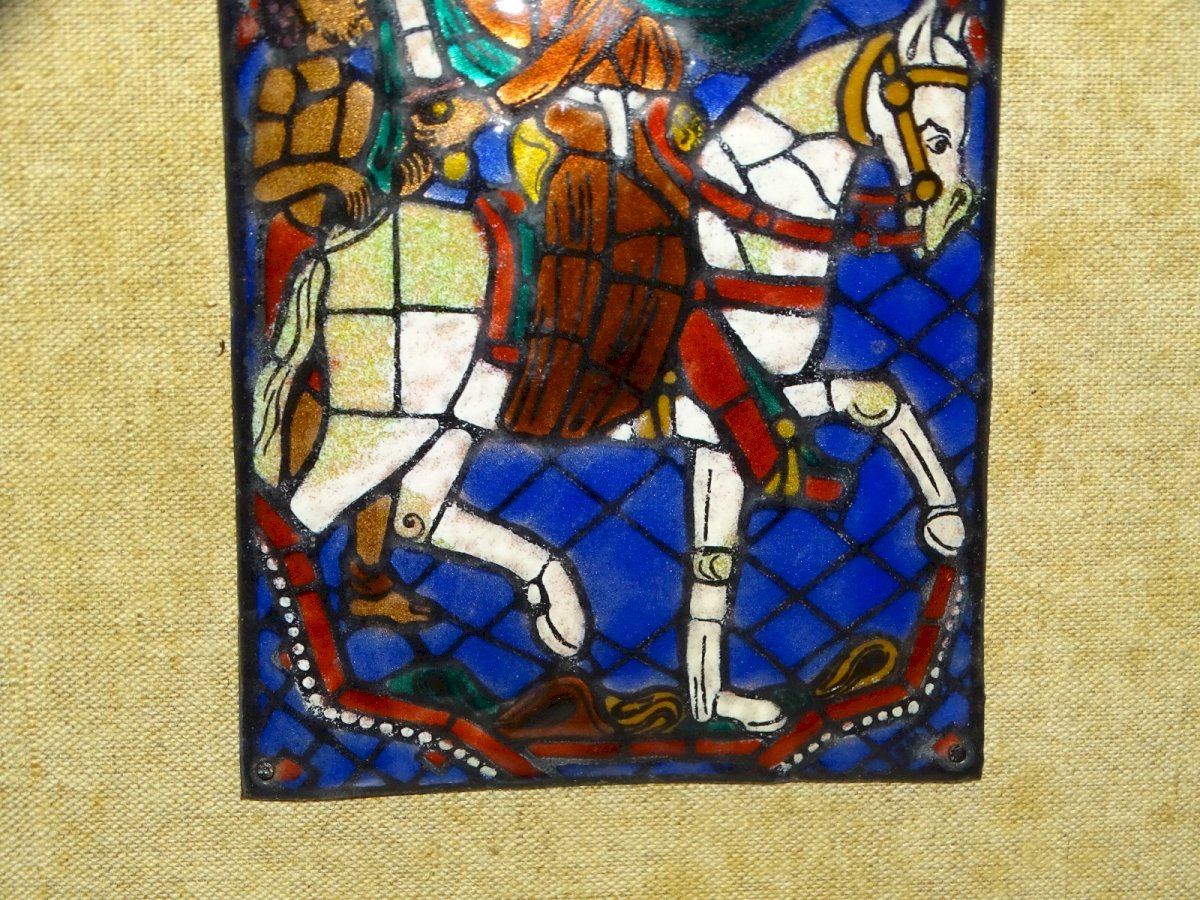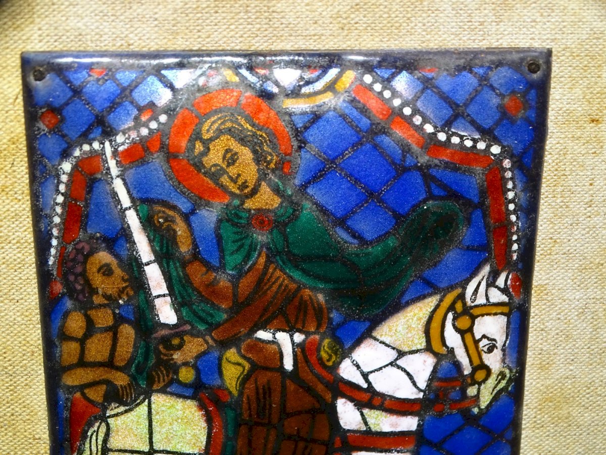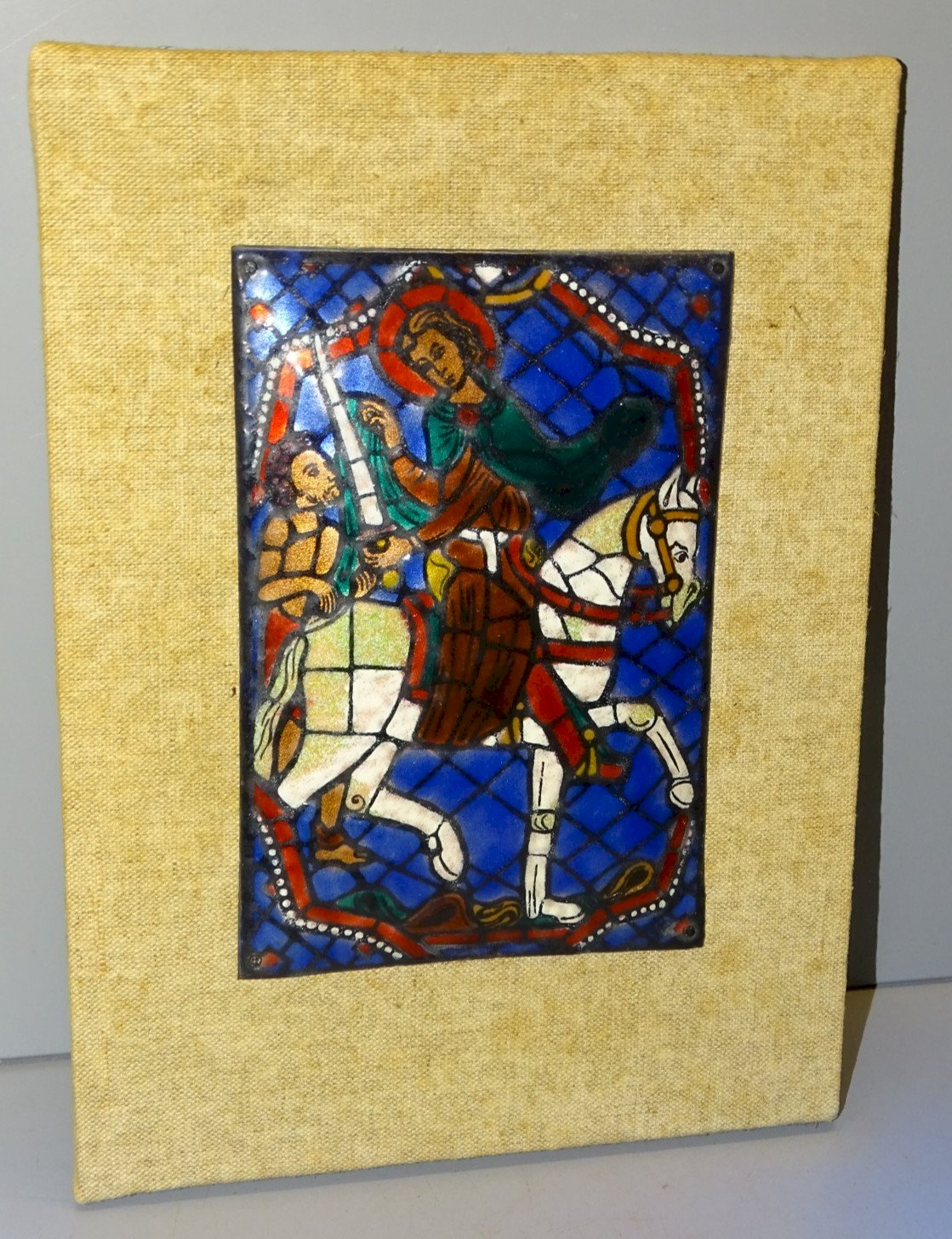 Beautiful enamel from Ligugé Saint Martin (stained glass from Chartres 13th century) published for the Abbey - nailed to a wooden plaque covered with a beige fabric resembling burlap (with small signs of dirt) (see photos) - juice of finds - out of the attic - Ref. 1V240718/324 Support 26 x 19.1 cm - Enamel 11.2 x 16.2 cm - Weight 550 g - SHIPPING POSSIBLE BY MONDIAL RELAY or COLISSIMO upon request VERY GOOD PACKAGING GUARANTEED THANK YOU for CAREFULLY LOOKING AT ALL the PHOTOS as THEY ARE AN INTEGRAL PART of the DESCRIPTION and ALLOW you to SEE the OBJECT BEST with ITS POSSIBLE SMALL DEFECTS -