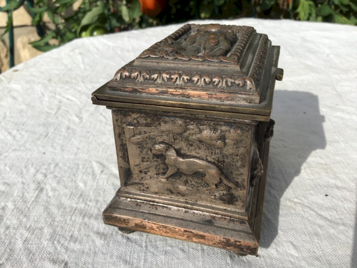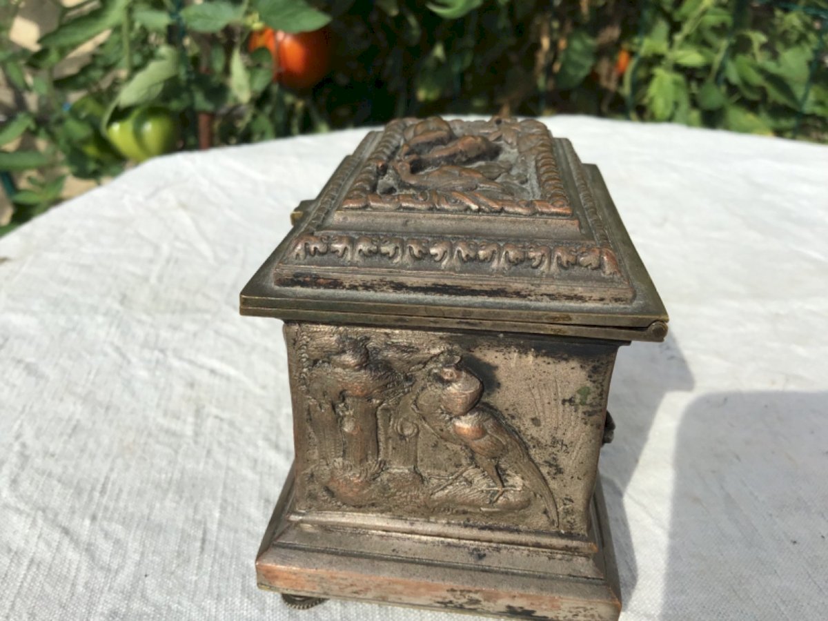 Adorable little jewelry box in brass or silver-plated metal NAPOLEON III 19th century. Different animal decorations on all sides. Hinge works, closure works. In great condition. Length 9 cm, height 7 cm with feet. Just the interior upholstery is worn. Closes very well. Authenticity: Original Type: Showcase item, Decorative Origin: France Subtype: Box Material: Silver-plated metal Style: Napoleon III