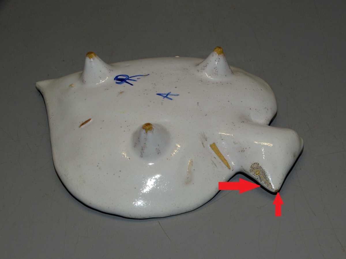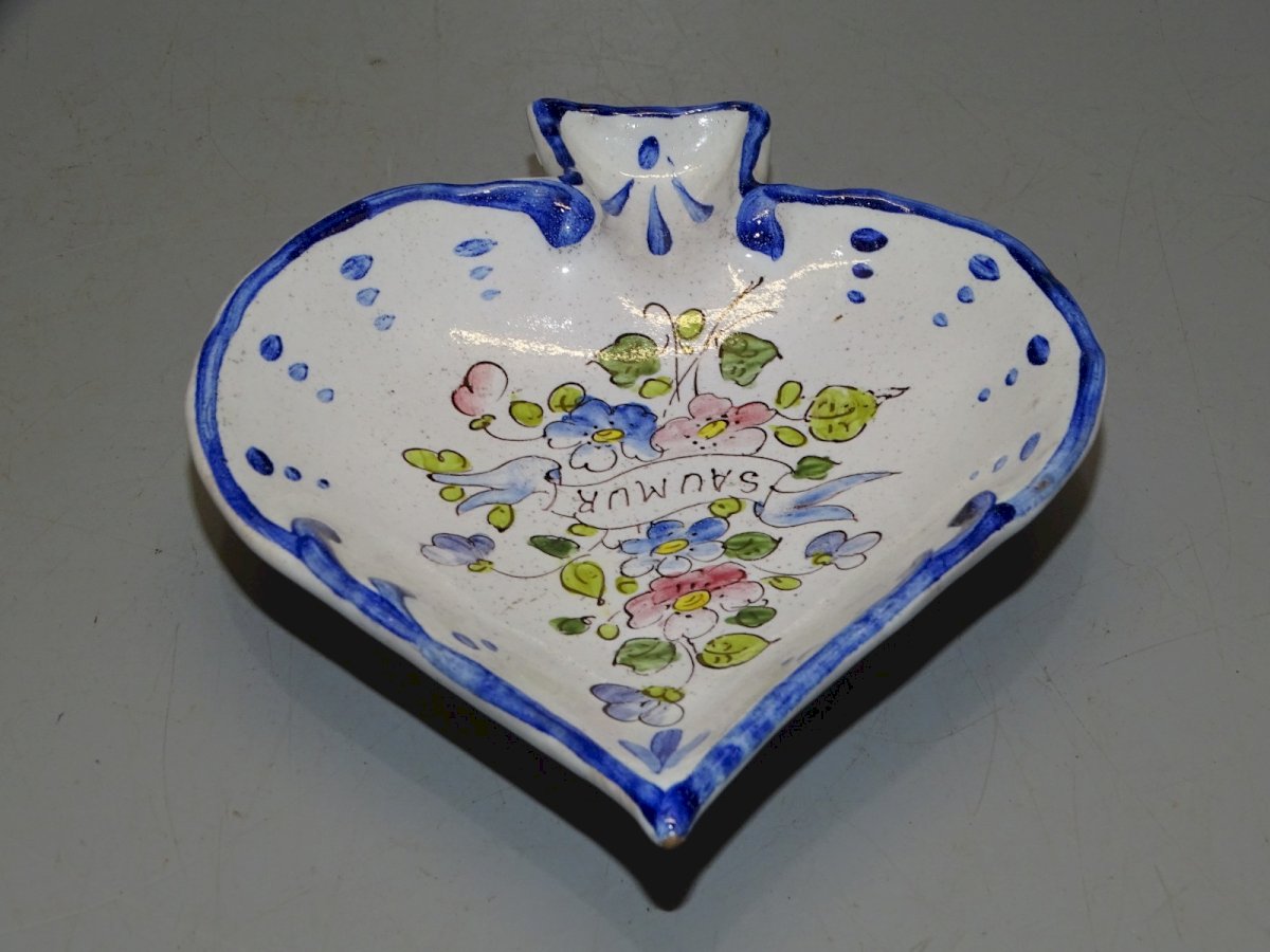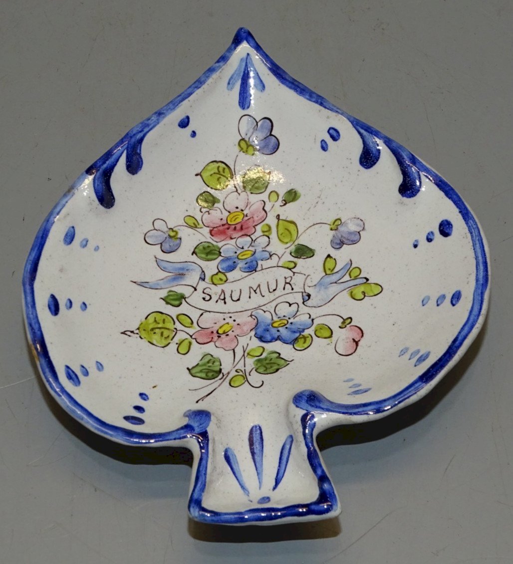old small glazed terracotta pocket ashtray signed AR.A. for Alfred Renoleau in the shape of a spike and marked Saumur in the center - note some minor wear on the glaze at the tip and a glazing defect on the handle's edge underneath and a small chip in the glaze on the tip of the handle (see photos) - discovered finds - taken from an attic - Ref. 1V240718/320 13.4 x 11 cm - Height approx. 3 cm - Weight 88 g - SHIPPING POSSIBLE VIA MONDIAL RELAY or COLISSIMO upon request VERY GOOD PACKAGING GUARANTEED THANK YOU for CAREFULLY LOOKING at ALL the PHOTOS as THEY ARE AN INTEGRAL PART of the DESCRIPTION and ALLOW YOU TO SEE the ITEM AS BEST AS POSSIBLE along with ITS POSSIBLE MINOR DEFECTS -