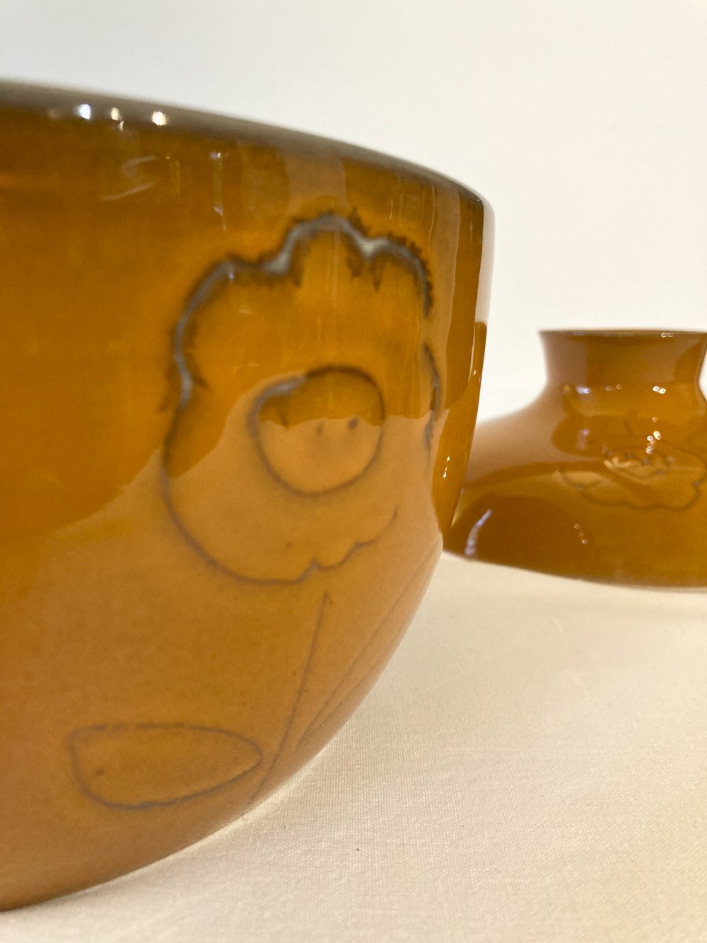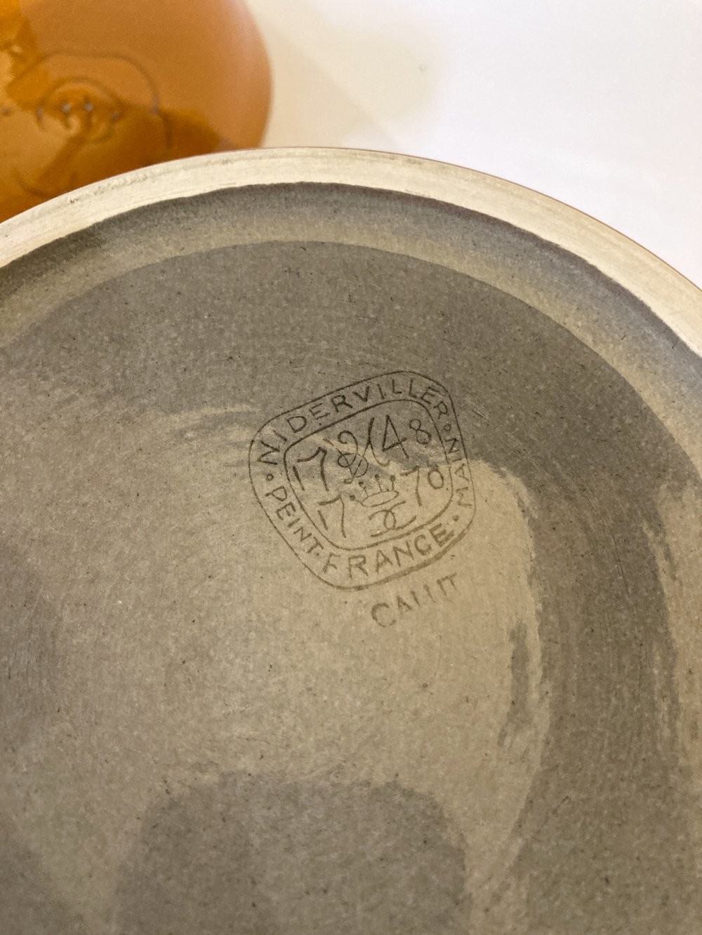 Beautiful lines and a very unique design for this soup tureen signed Niederviller. Calut model featuring a hand-engraved flower in the ceramic, which is subsequently glazed. A lovely autumn orange-ochre color that perfectly suits the season of soups with multiple vegetable tones. The lines of the lid are also of great beauty and resemble those of tagines and other oriental serving dishes.