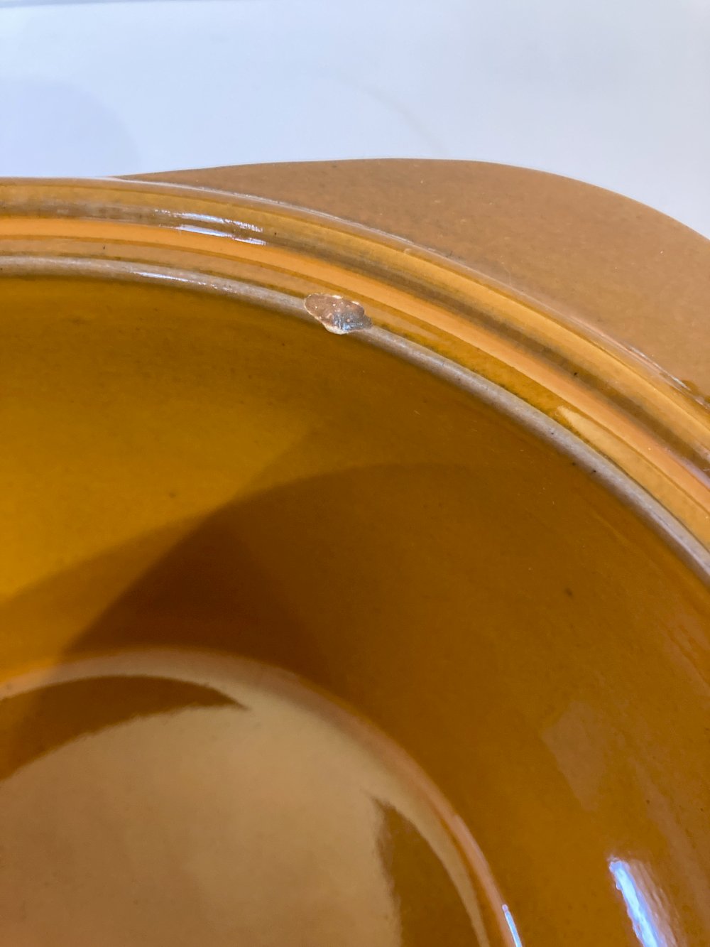 It is in very good overall condition, with a manufacturing glaze chip on top and a small recent chip on the lid.