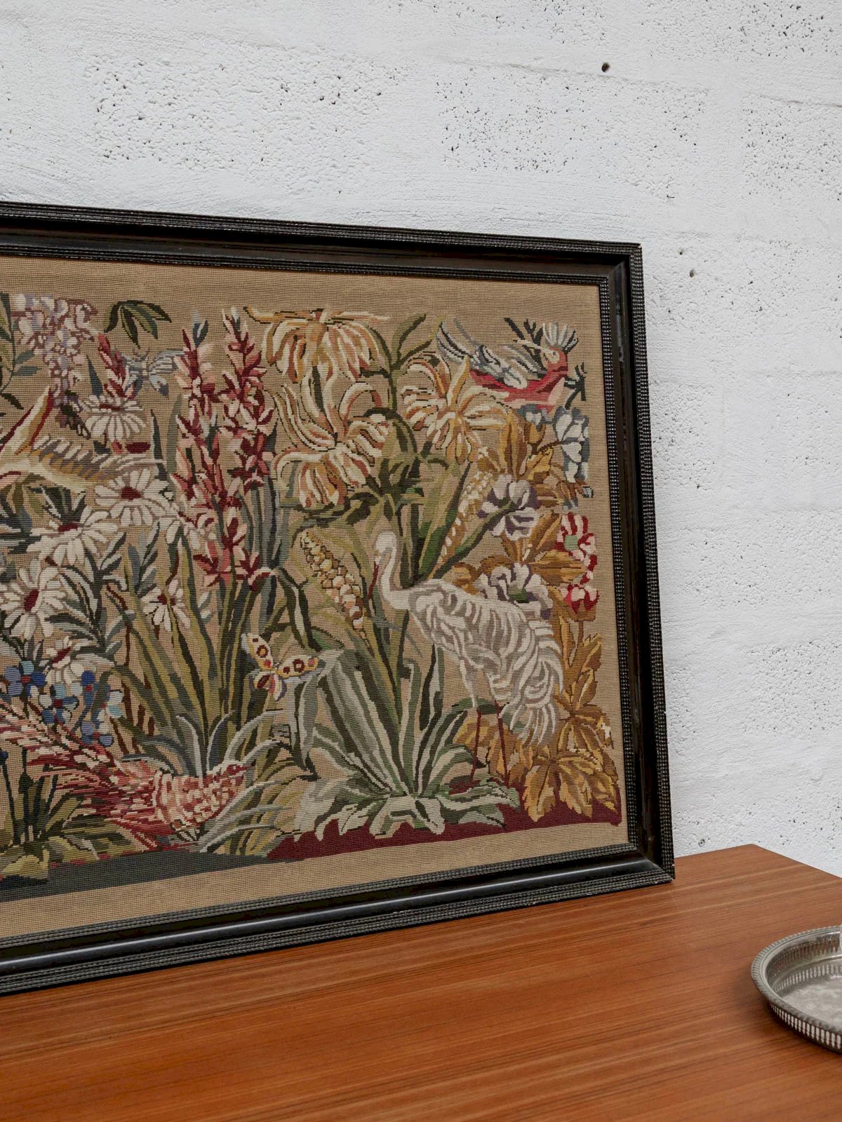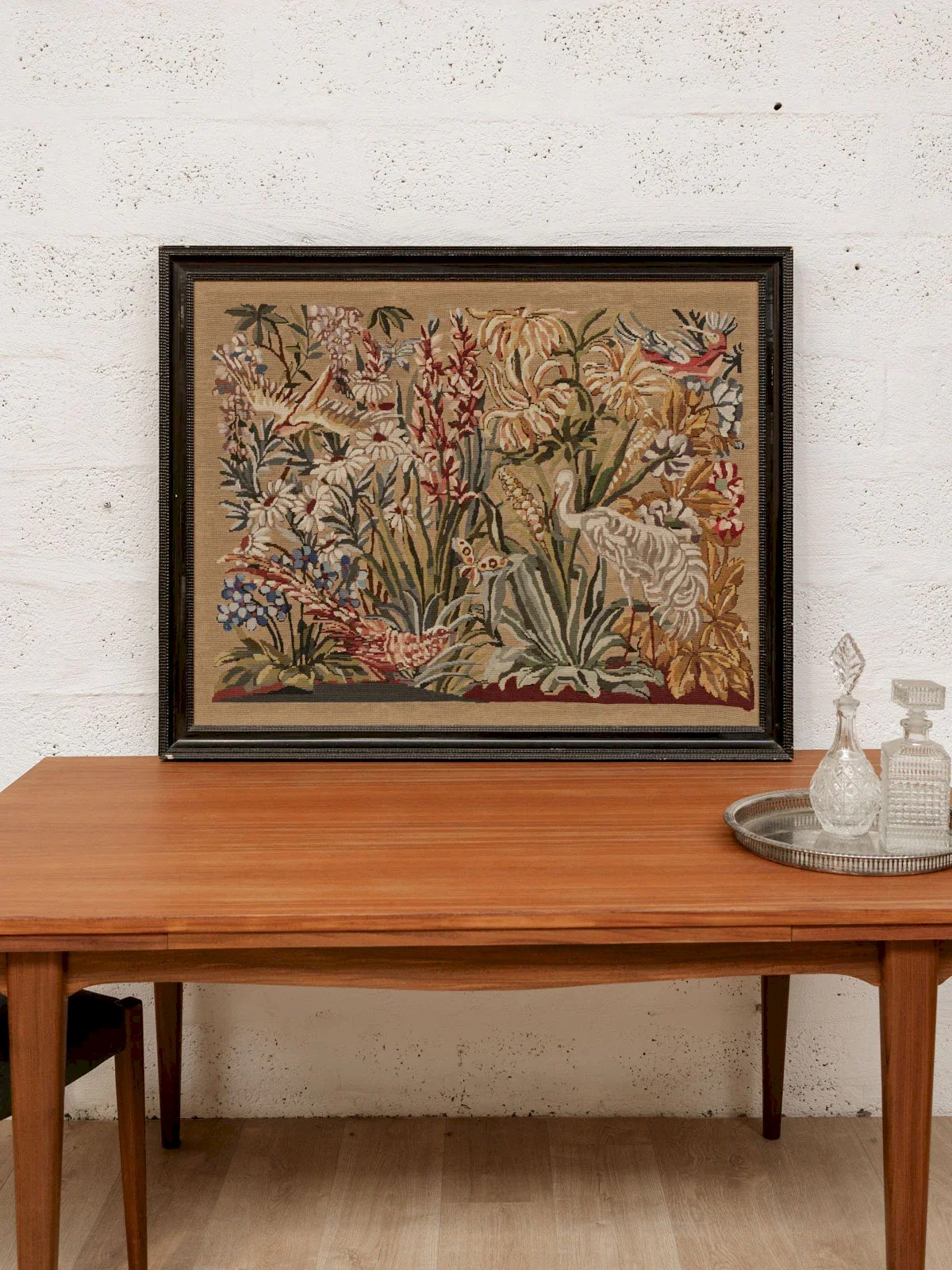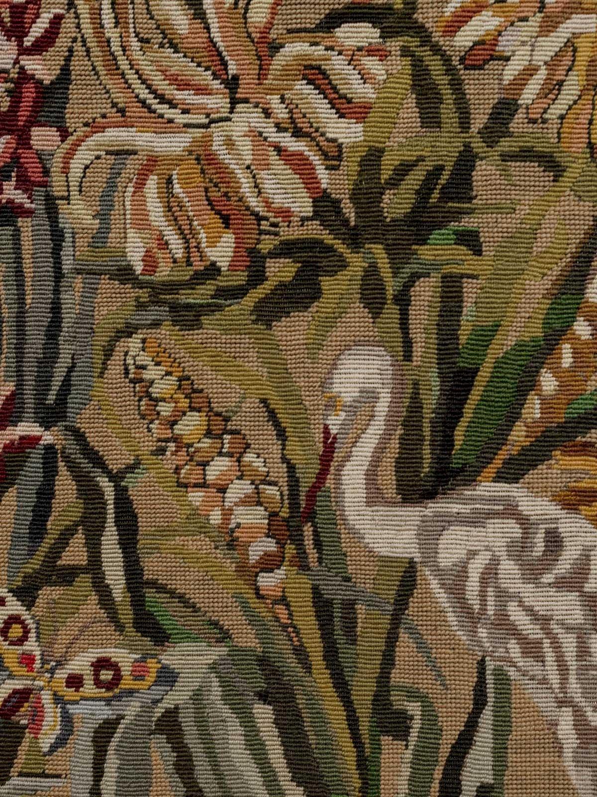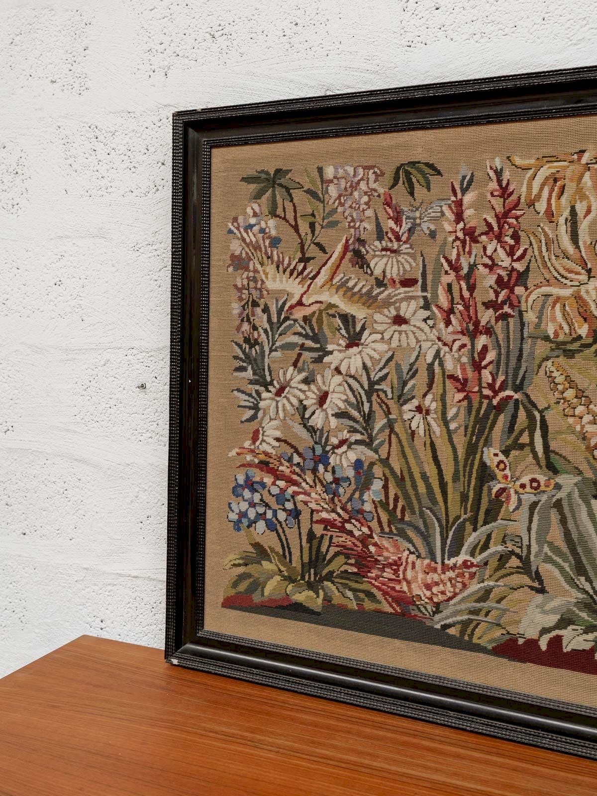 Add a touch of retro charm to your interior with this vintage green tapestry adorned with delicate patterns of butterflies, animals, flowers, and lovely vegetation. The elegant black frame highlights the richness of the details, making this piece a true focal point in your decor. Perfect for a living room or bedroom, it will enhance your space while evoking a bucolic and soothing atmosphere. Ideal for nature lovers and vintage style enthusiasts. Online exclusive, the meeting will take place at your home! Length: 116 cm Width: 94 cm Condition: Used: Item that has been used. Item showing some superficial signs of wear... Used: Item that has been used. Item showing some superficial signs of wear, fully operational and functioning properly. It may be a demonstration model or an item returned to the store after a short period of use. potential imperfections. Brand: Debongout Type: Thrifted product Material: Fabric, Wood Style: Contemporary