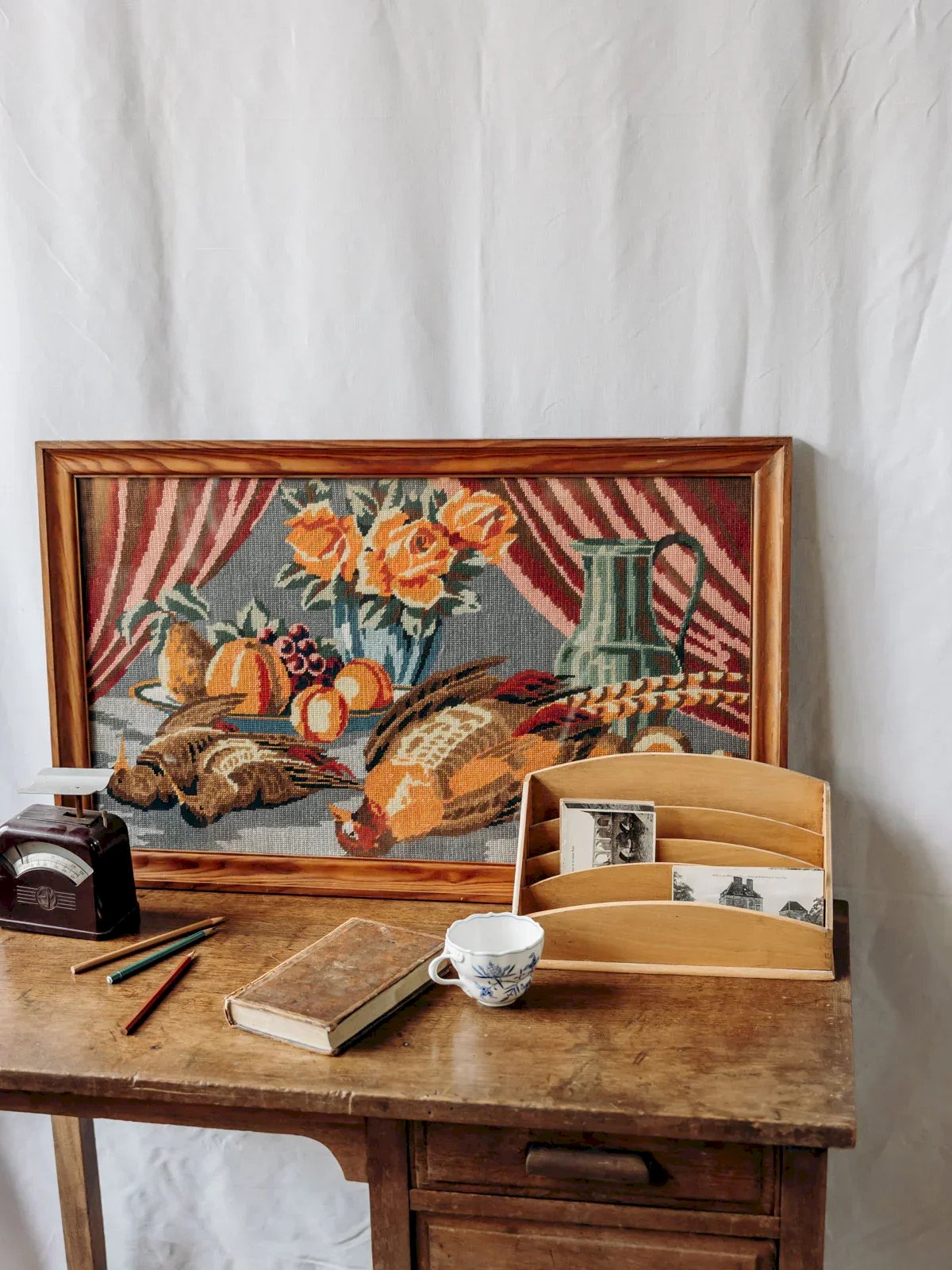 Discover this framed canvas in light wood, a colorful still life dated March 1970 that invites a contemplative pause. The shimmering hues and the texture of the canvas bring warmth and depth, while the simple frame emphasizes its presence without being imposing. Perfect for hanging in a kitchen, living room, or reading nook, it creates a retro and bright atmosphere, ideal for adding a unique artistic touch to a wall. Length: 78 cm Width: 2 cm Height: 48 cm Condition: Used: Item that has been used. Item showing some superficial wear marks,... Used: Item that has been used. Item showing some superficial wear marks, fully operational and functioning correctly. It may be a demonstration model or a returned item after a short period of use. Possible imperfections. Brand: Debongout Type: Thrifted product Material: Wood, Fabric Style: Contemporary