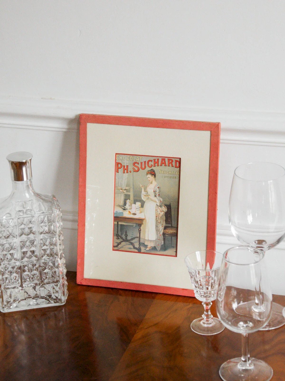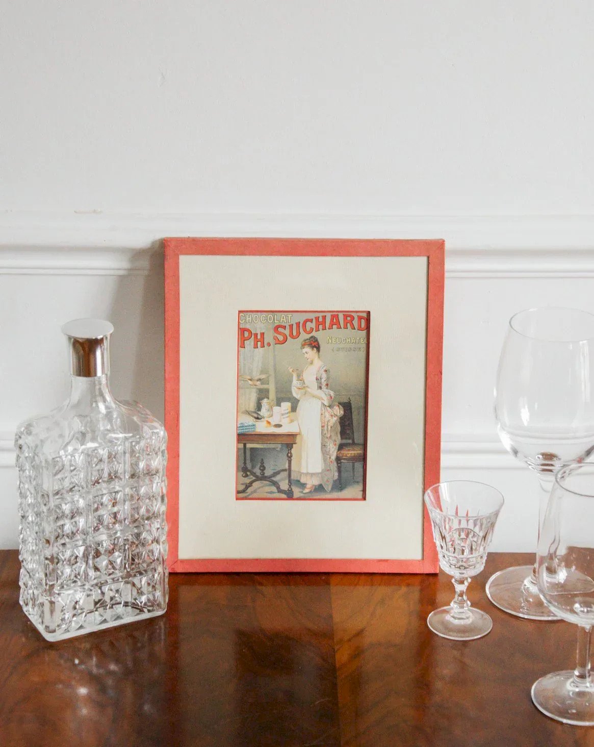 Discover this sublime framed vintage illustration of PH Suchard chocolate, a true nod to the culinary art of yesteryear. This piece evokes the sweetness and elegance of a bygone era, adding a refined retro touch to your interior decor. Perfect for chocolate lovers and vintage enthusiasts, this framing will enhance your space while telling a beautiful story. Treat yourself to a piece of history and let yourself be enchanted by its delightful colors and timeless charm. Width: 19.5 cm Height: 24 cm Depth: 1 cm Condition: Used item. Item shows some signs of superficial wear, fully operational and functioning properly. It may be a demo model or an item returned to the store after a short period of use. Possible imperfections. Brand: Debongout Type: Thrifted product Material: Paper Style: Contemporary