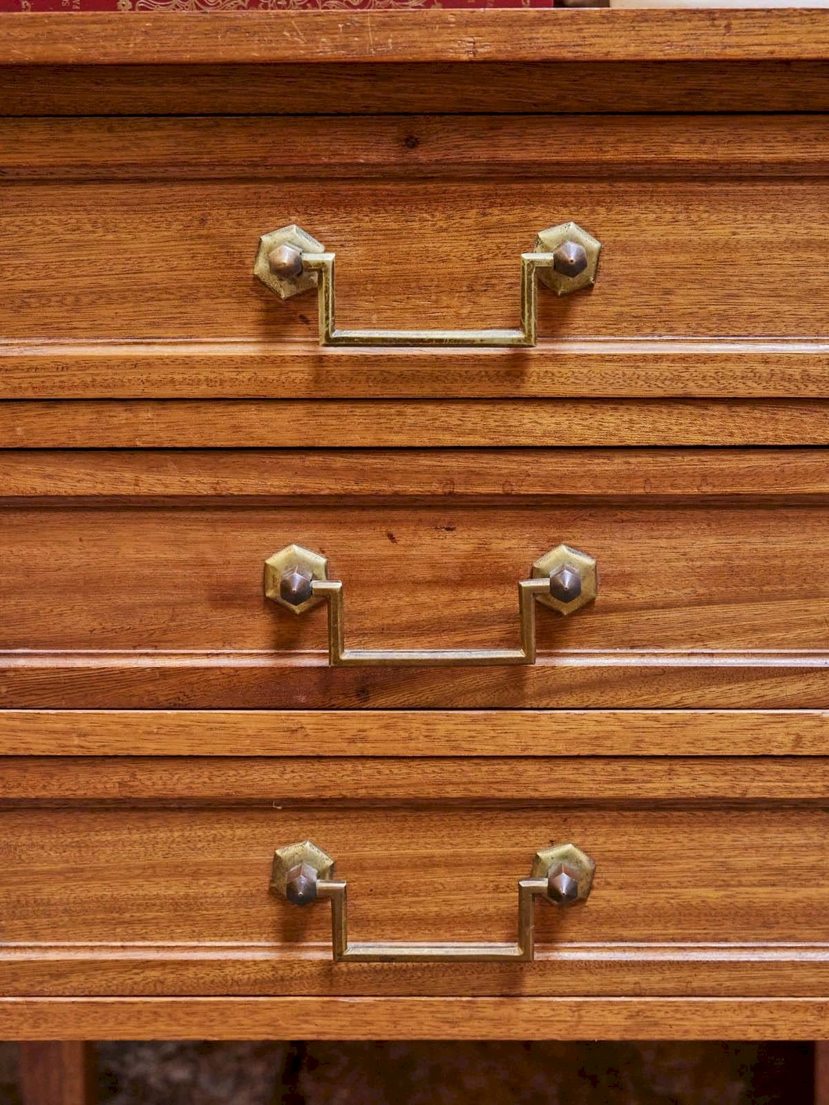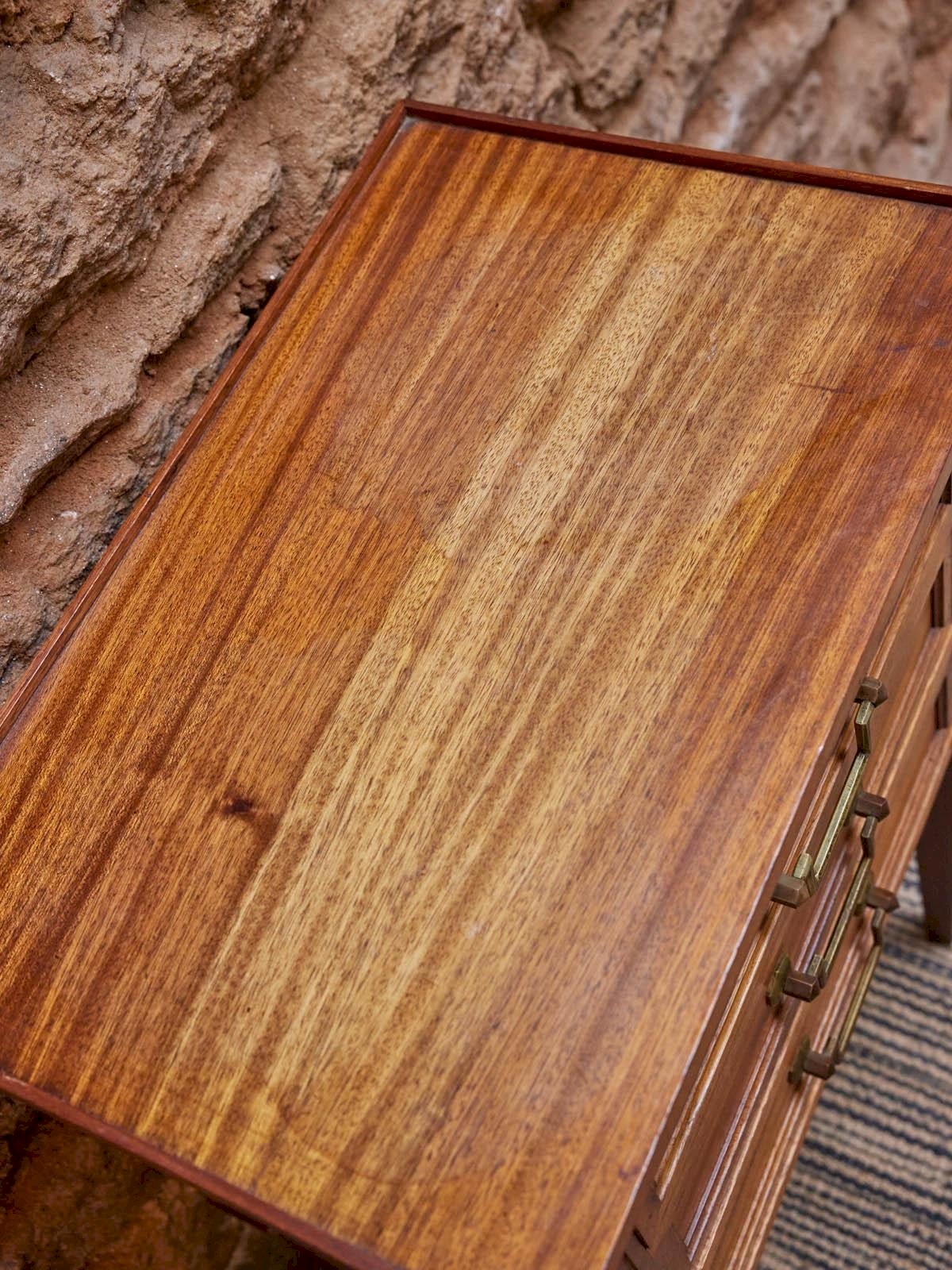 Embrace this Louis XVI-style wooden bedside table, with balanced lines and a compact size that fits easily beside the bed. Its three drawers offer discreet storage for books and everyday items, while the brass handles add a subtle touch of shine and elegance. Its design, inspired by classic codes without heaviness, creates a refined and warm atmosphere. Ideal for bringing character and functionality to your sleeping space. Length: 47 cm Width: 30 cm Height: 70 cm Drawer height: 12 cm A brief history of the bedside table The term "bedside table" has referred since the Middle Ages to a small piece of furniture placed beside the bed. Initially designed as a support for a lamp or personal items, the bedside table has evolved over time to include drawers and shelves. Essential in the bedroom, it today combines functionality and design, adapting to all interior styles. Condition: Used: Item that has been used. Item showing some superficial signs of wear... Used: Item that has been used. Item showing some superficial signs of wear, fully operational and functioning properly. It may be a demonstration model or an item returned to the store after a short period of use. any potential imperfections. Brand: Debongout Type: Vintage product Material: Wood Style: Country Personalized: Bedside tables