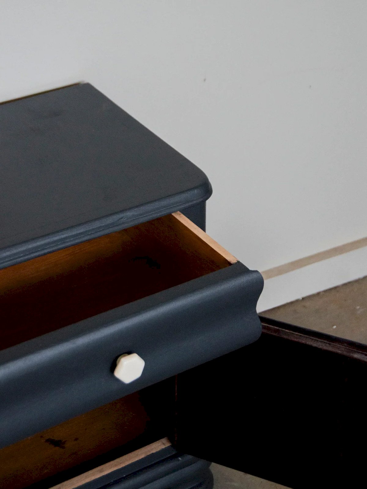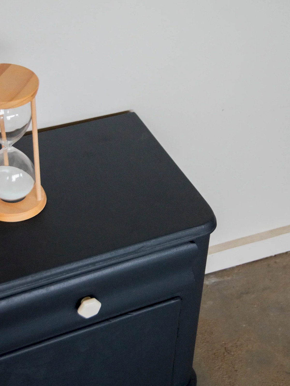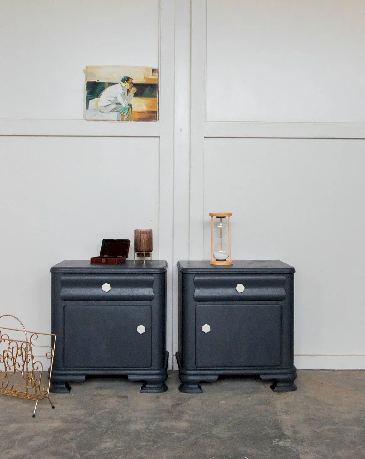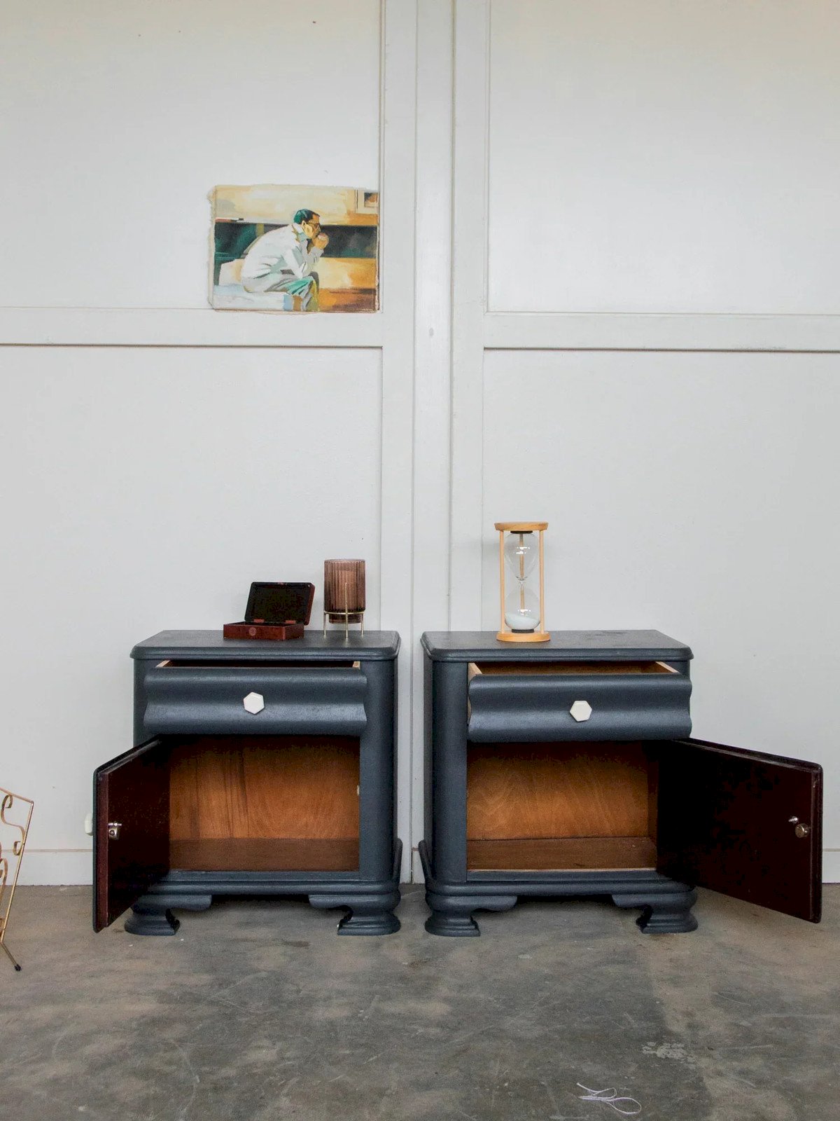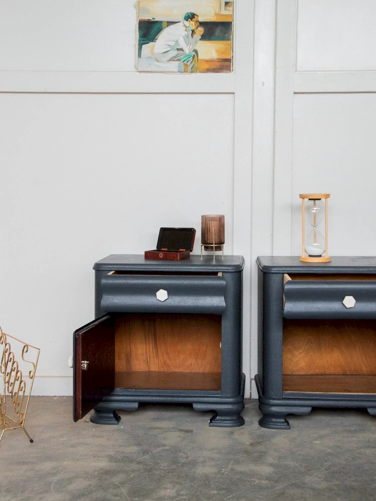 Discover this pair of wooden nightstands with a sleek design, each module combining a drawer and a cupboard for organized bedside storage. The hexagonal handles add a geometric and contemporary touch while the small feet lighten the silhouette and promote visual flow in the room. Designed to hold your nighttime essentials, they integrate well into both contemporary decor and a warmer, more intimate atmosphere. Length: 51 cm Width: 38 cm Height: 55 cm Drawer height: 9 cm Niche height: 28 cm A brief history of the nightstand The term "nightstand" has referred to a small piece of furniture placed next to the bed since the Middle Ages. Initially designed to support a lamp or personal items, the nightstand has evolved over time to include drawers and shelves. Essential in the bedroom, it now combines functionality and design, adapting to all interior styles. Condition: Used: An item that has been used. Item showing some superficial signs of wear, fully operational and functioning correctly. It may be a display model or an item returned to the store after a short period of use. Any imperfections. Brand: Debongout Type: Vintage product Material: Wood Customized: Nightstands Style: Country