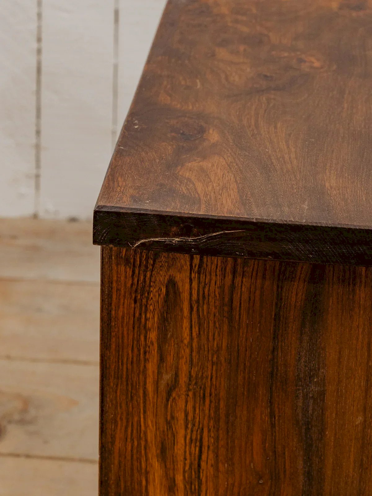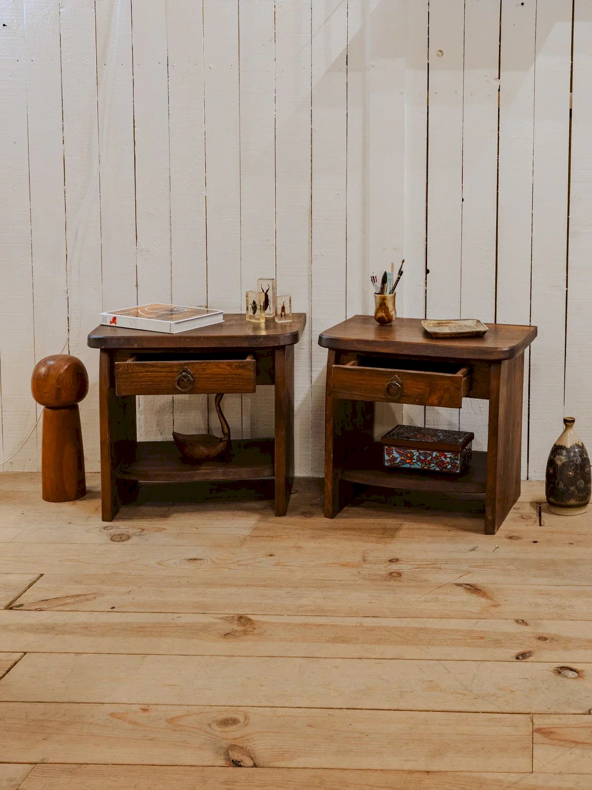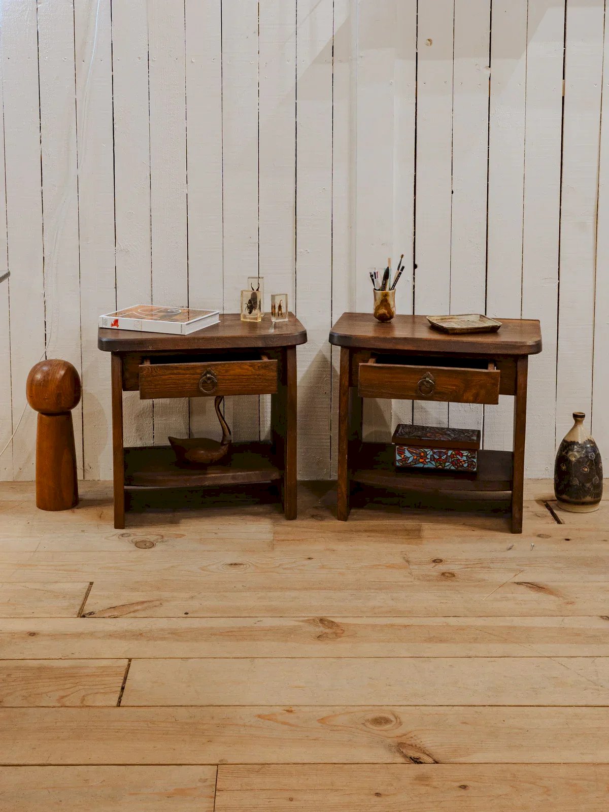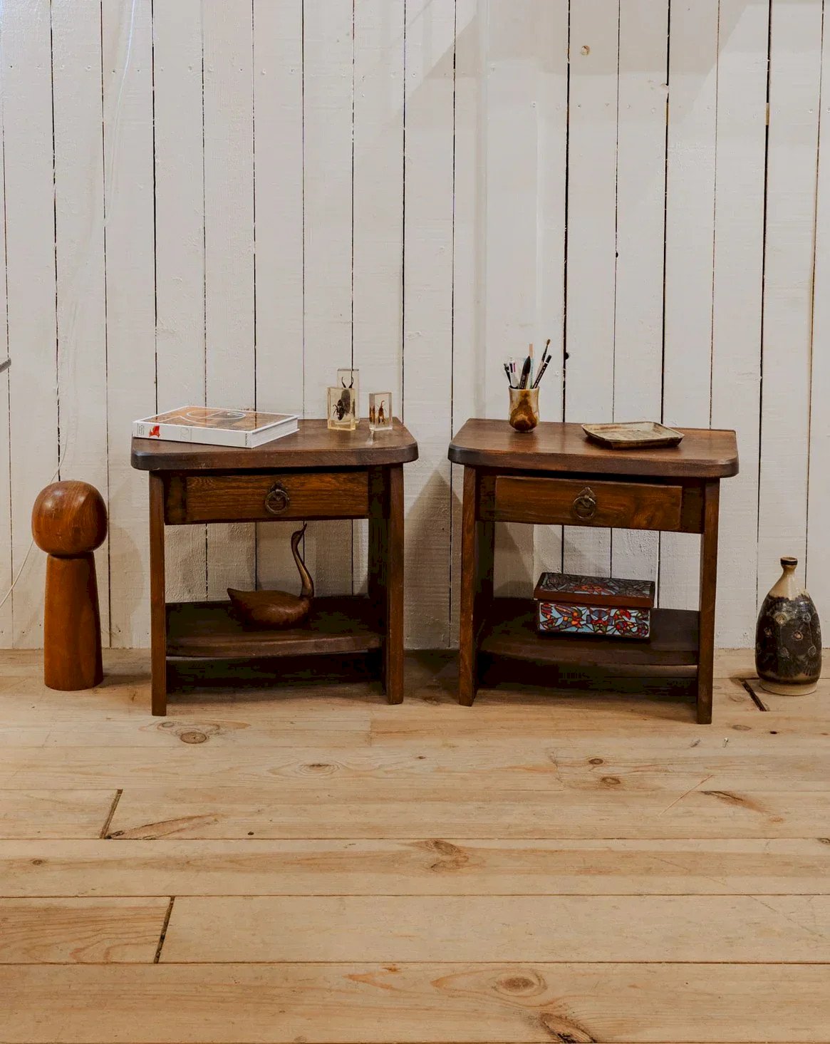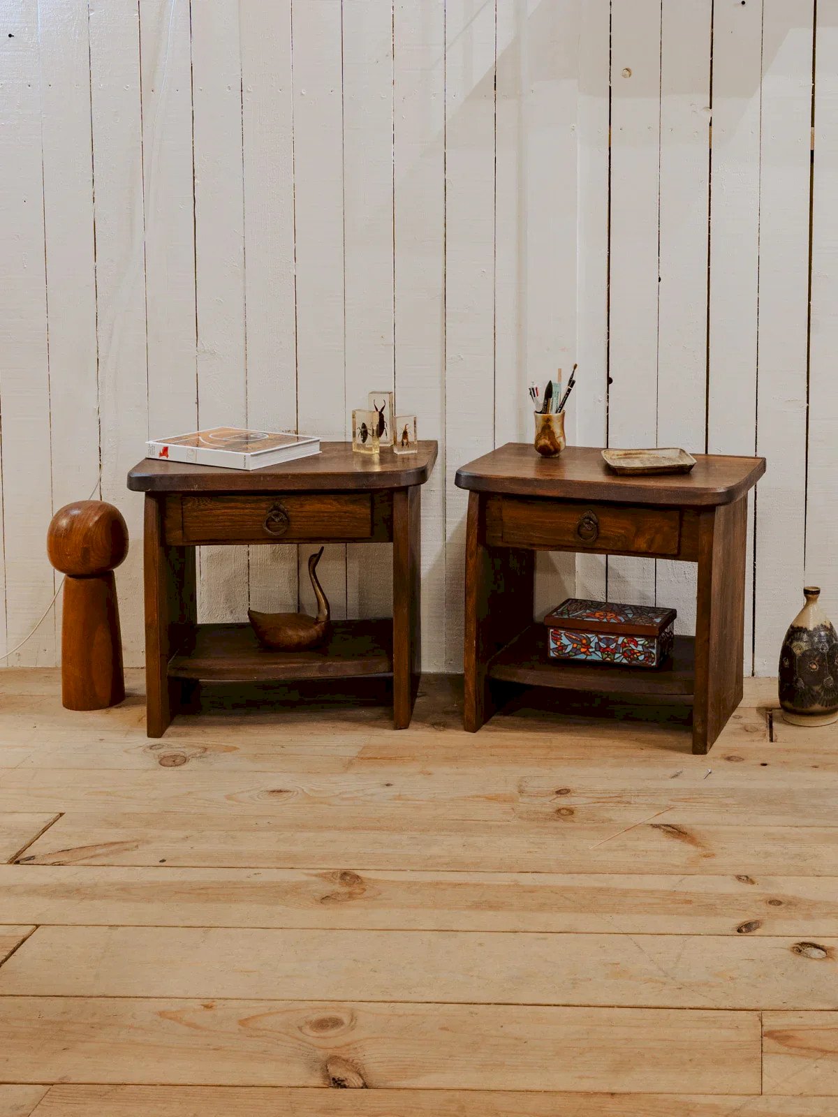 Adopt this pair of wooden bedside tables, with a sober and warm design enhanced by metal handles. Their size and proportions provide a drawer and an under-shelf to keep your books and belongings within reach, perfect for a bedroom with contemporary or classic lines. The finish creates an intimate and elegant ambiance, easy to match with natural textiles. Some signs of wear are present. Length: 55 cm Width: 33 cm Height: 51 cm Drawer height: 5 cm A brief history of the bedside table The term "bedside table" has referred since the Middle Ages to a small piece of furniture placed next to the bed. Originally designed as a support for a lamp or personal items, the bedside table has evolved over time to include drawers and shelves. Essential in the bedroom, it today combines functionality and design, adapting to all interior styles. Condition: Used: Item has been used. Item shows some signs of superficial wear, fully operational and functioning correctly. It may be a display model or an item returned to the store after a short period of use. any imperfections. Brand: Debongout Type: Thrifted product Material: Wood, Metal Style: Country Customized: Bedside tables