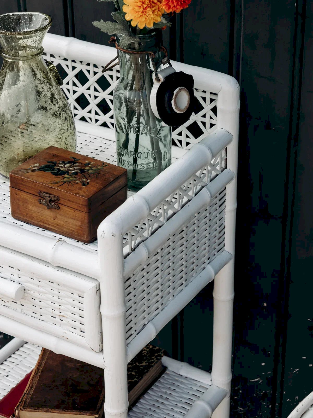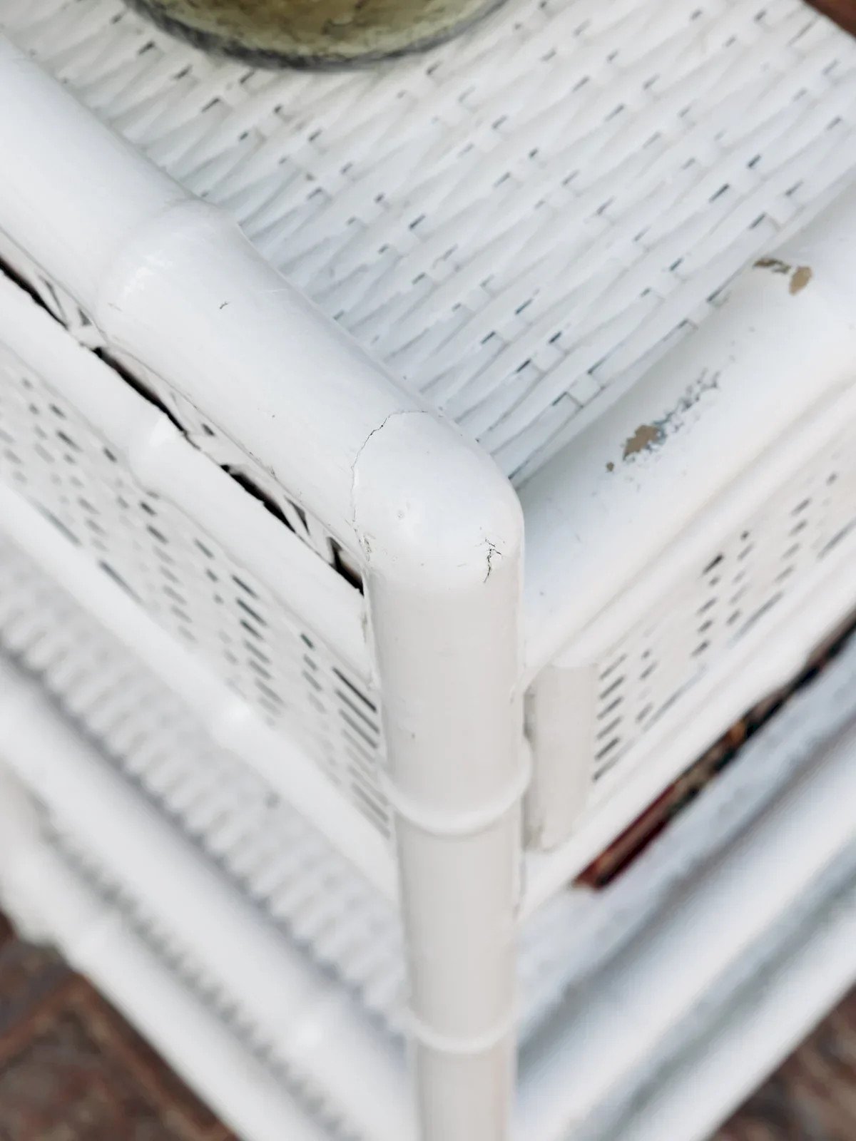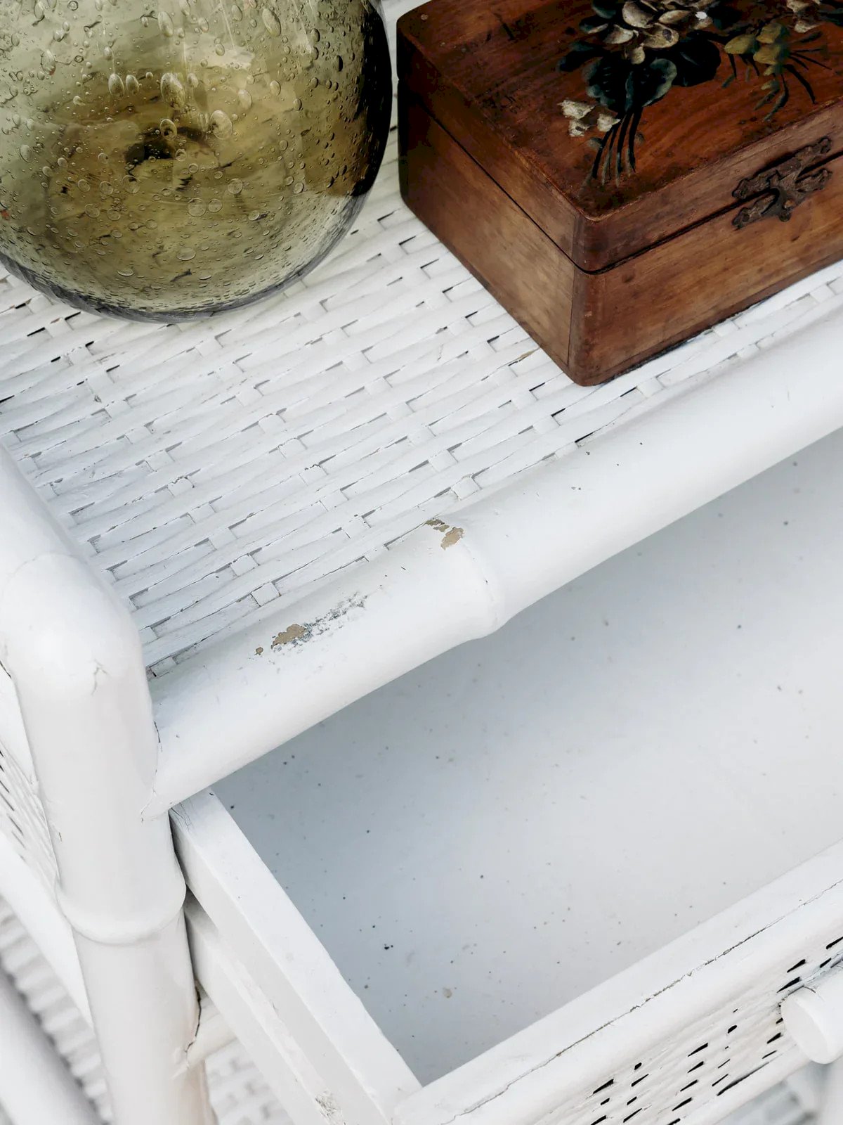 Bring warmth and natural charm to your home with this bedside table or accent table made of white rattan and bamboo, equipped with two rattan shelves and a practical drawer, enhanced by beautiful artisan details that provide elegance and authenticity, combining lightness, functionality, and bohemian style to enrich your decor with softness and character. Some visible signs of wear. Length: 32 cm Height: 84 cm Drawer height: 8 cm Depth: 32 cm Niche height: 23 cm x 2 A little history of the bedside table The term "bedside table" has referred since the Middle Ages to a small piece of furniture placed next to the bed. Originally designed as a support for a lamp or personal items, the bedside table has evolved over time to include drawers and shelves. Essential in the bedroom, it now combines functionality and design, adapting to all interior styles. Condition: Used: Item has been used. Item shows some signs of superficial wear... Used: Item has been used. Item shows some signs of superficial wear, fully operational and functioning properly. It may be a display model or an item returned to the store after a short period of use. Any imperfections. Brand: Debongout Type: Vintage product Material: Rattan, Bamboo Customized: Bedside tables Style: Country