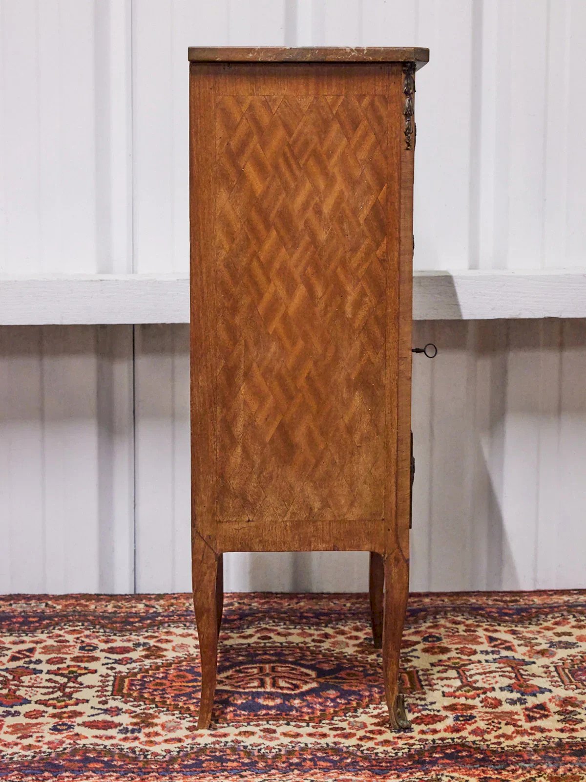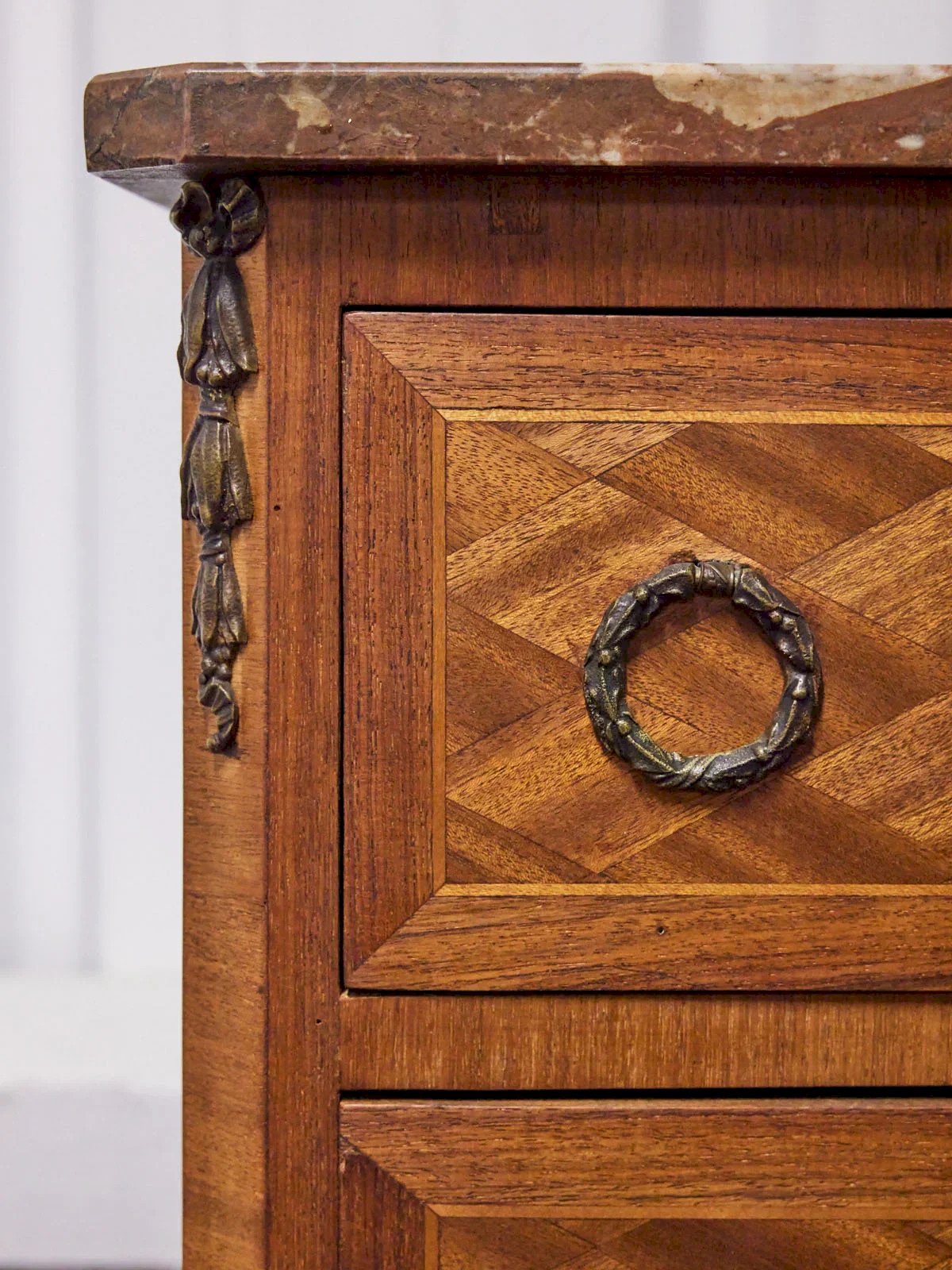 Enhance your interior with this bedside table featuring a delicate pink marble top and a warm wooden structure. Its compact proportions provide a practical accent piece with four handy drawers, perfect for organizing small items, papers, and accessories while remaining discreet. The contrast of materials creates an elegant and timeless silhouette, ideal next to a sofa or a bed to diffuse a soft and refined atmosphere. A piece of furniture that invites conviviality and staging. Length: 43 cm Width: 32 cm Height: 94 cm A brief history of the bedside table The term "bedside table" has referred since the Middle Ages to a small piece of furniture placed beside the bed. Initially designed as a support for a lamp or personal items, the bedside table has evolved over time to include drawers and shelves. Essential in the bedroom today, it combines functionality and design, adapting to all interior styles. Condition: Used: Item that has been used. Item showing some superficial wear marks, fully operational and functioning correctly. It may be a demonstration model or an item returned to the store after a short period of use, with possible imperfections. Brand: Debongout Type: Vintage product Material: Wood, Marble Style: Country Customizable: Bedside tables